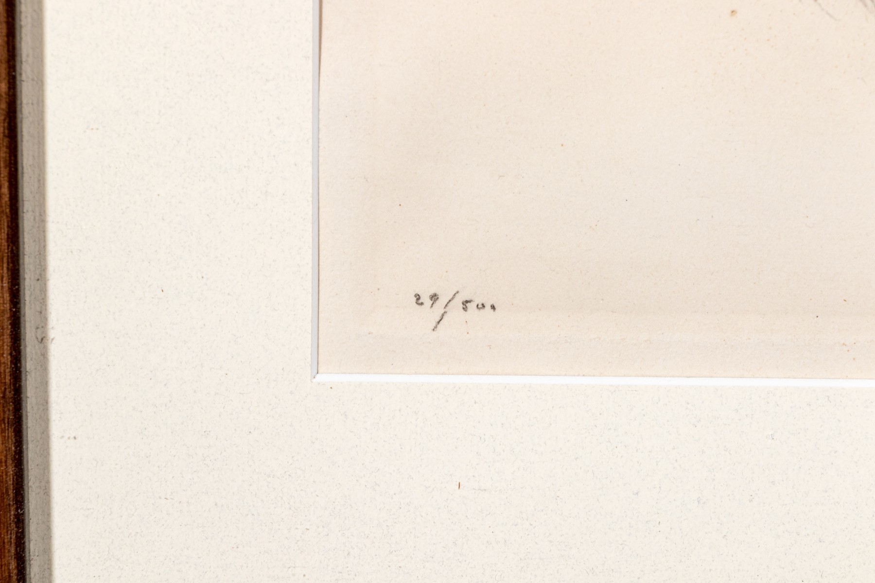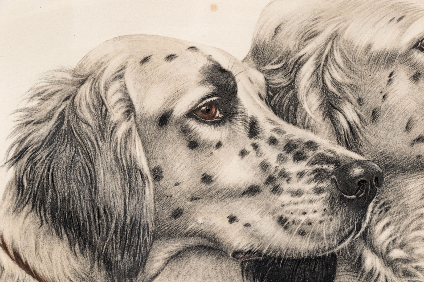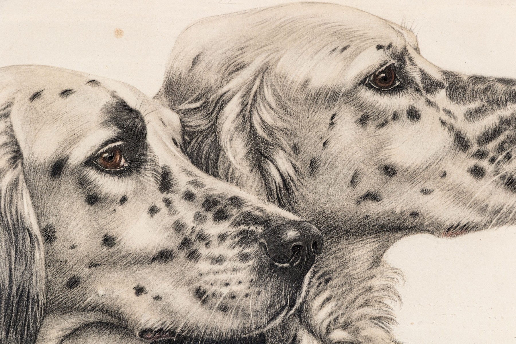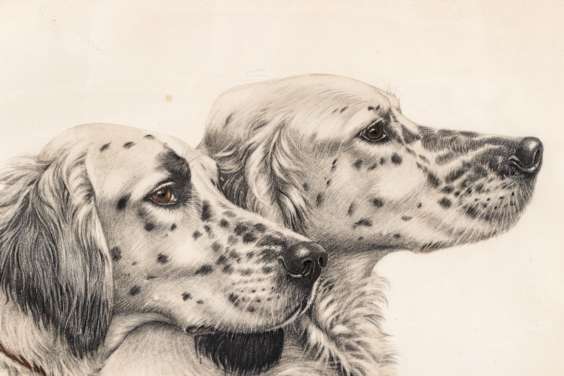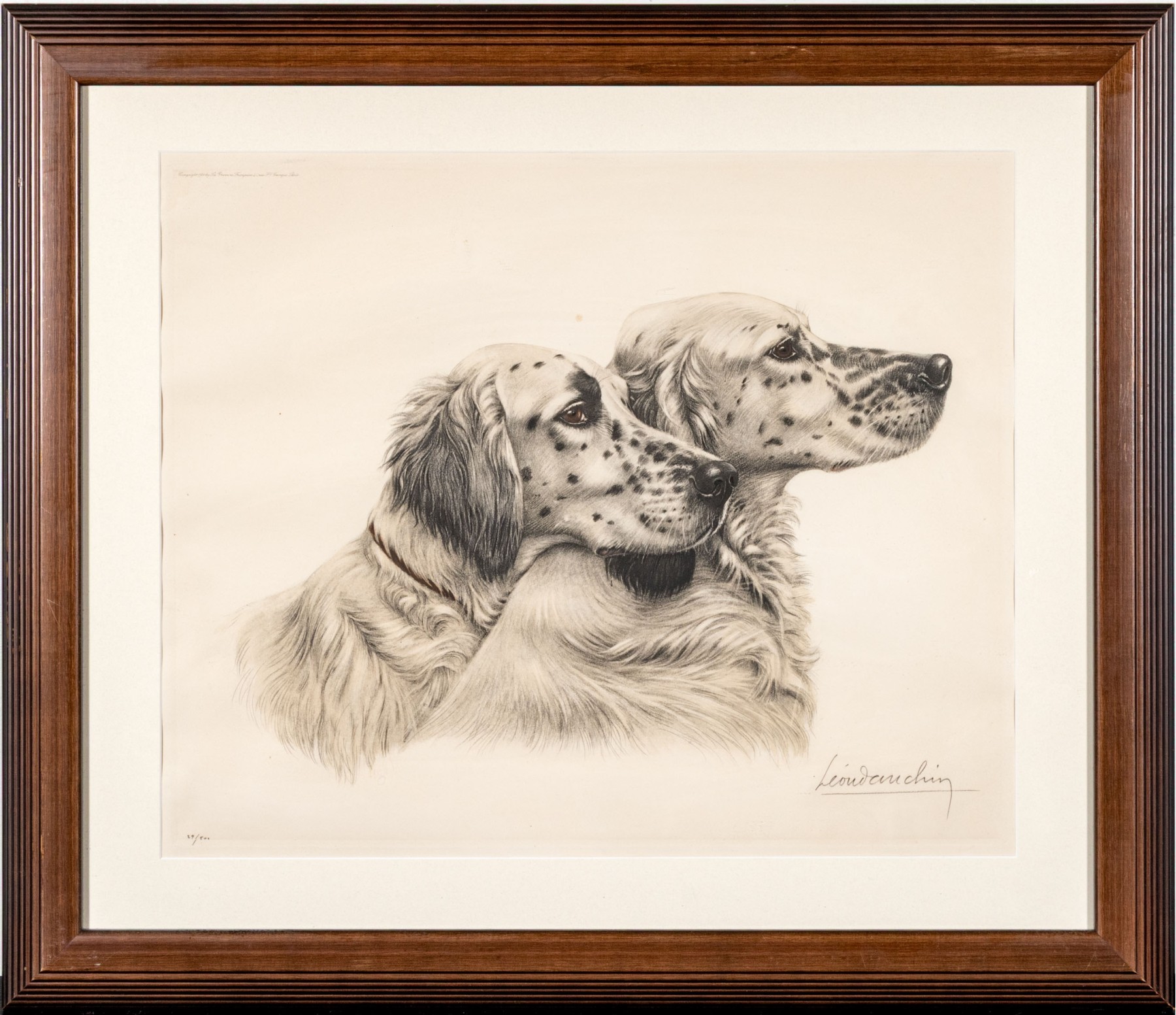 Depicting two dogs in profile. Pencil signed lower right and numbered '29/500' lower left. Presented matted and framed in a wooden frame. Dim. 16 3/4 x 20 1/4" W, sight // 24 x 27 7/8" W, frame