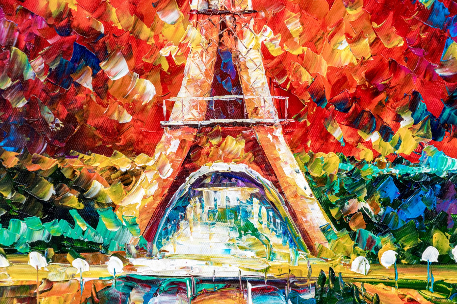 A vibrant Expressionist style painting on canvas depicting the iconic Parisian, Eiffel Tower. The work displays the tower as the central focus of the canvas with the perspective of gazing down a boulevard directly facing the Eiffel tower. Short, vibrant brushstrokes throughout give an Autumnal aesthetic through the use of color palette.