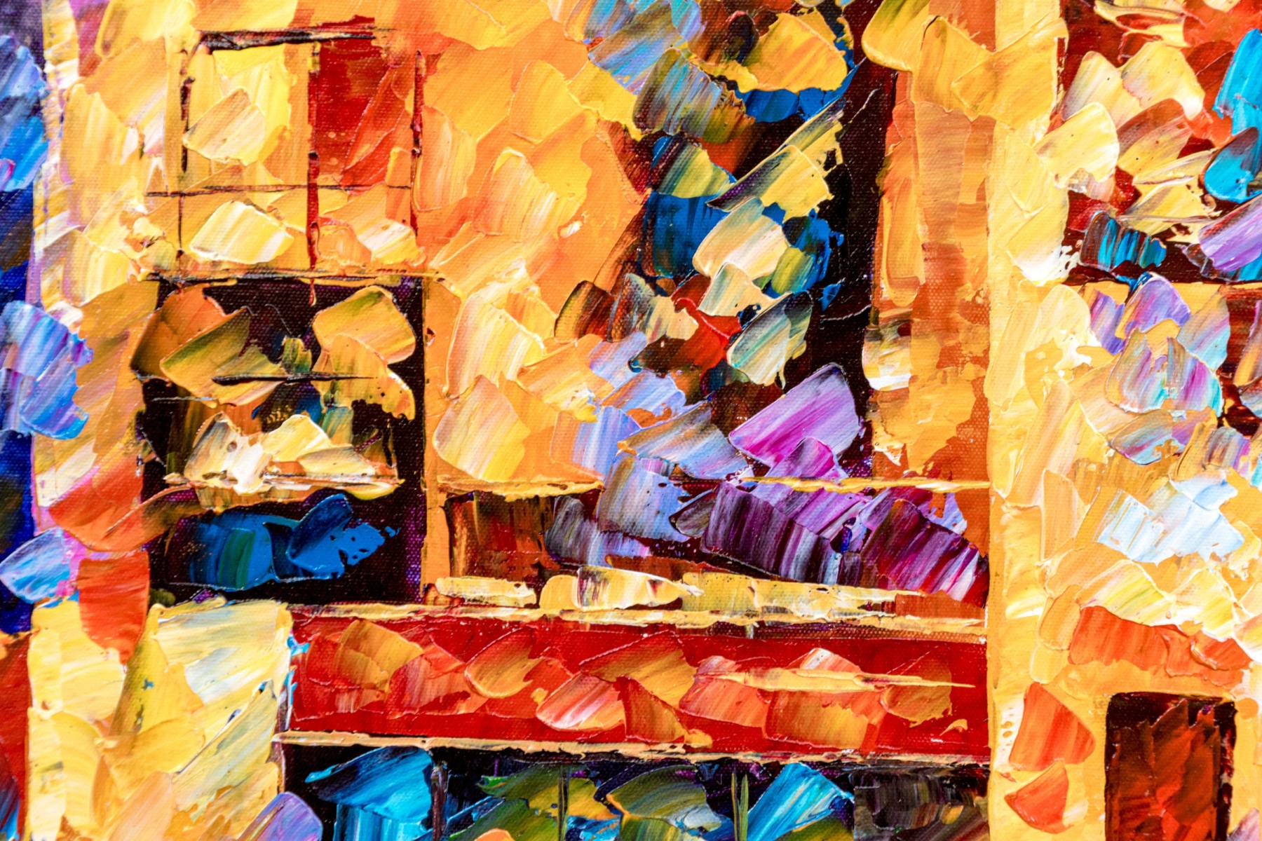 An Expressionist style painting on canvas depicting building facades with figure staring into a window with short paint brush strokes of color lending the work its Expressionist aesthetic.