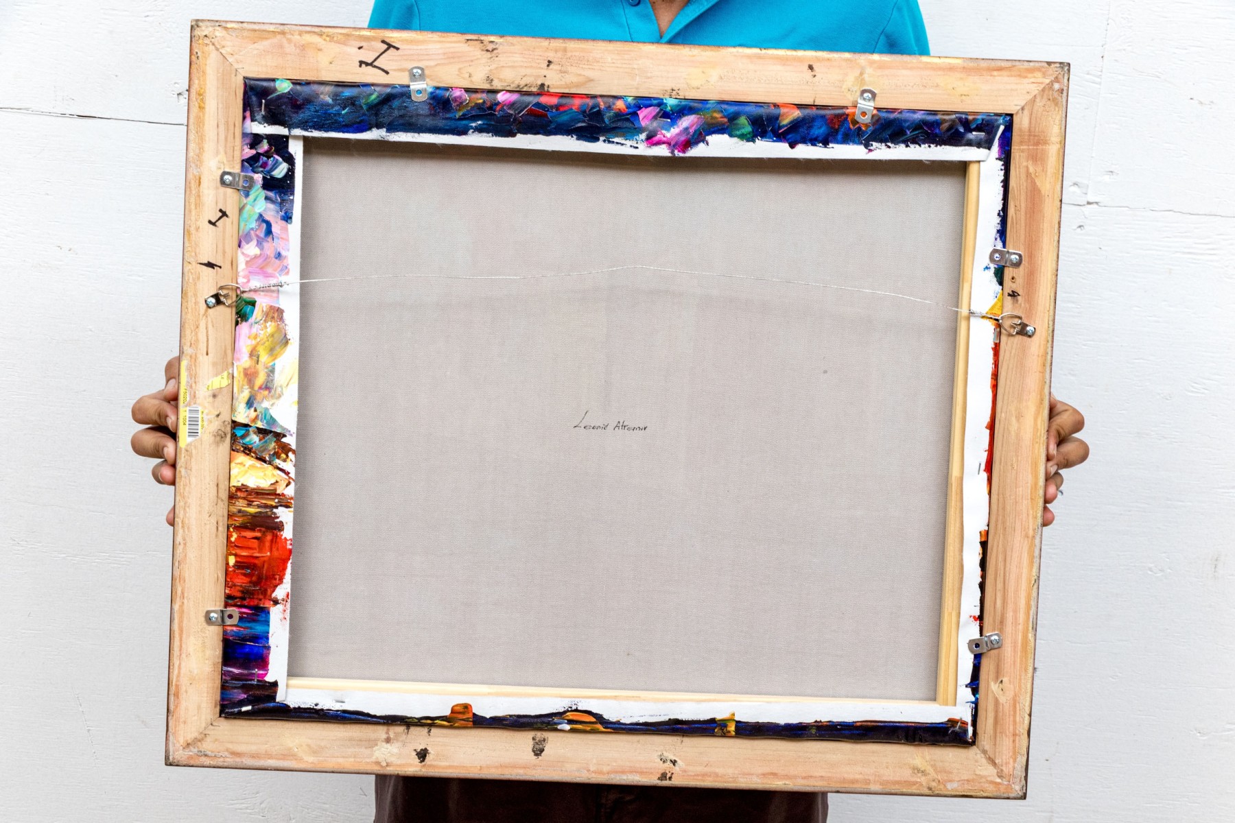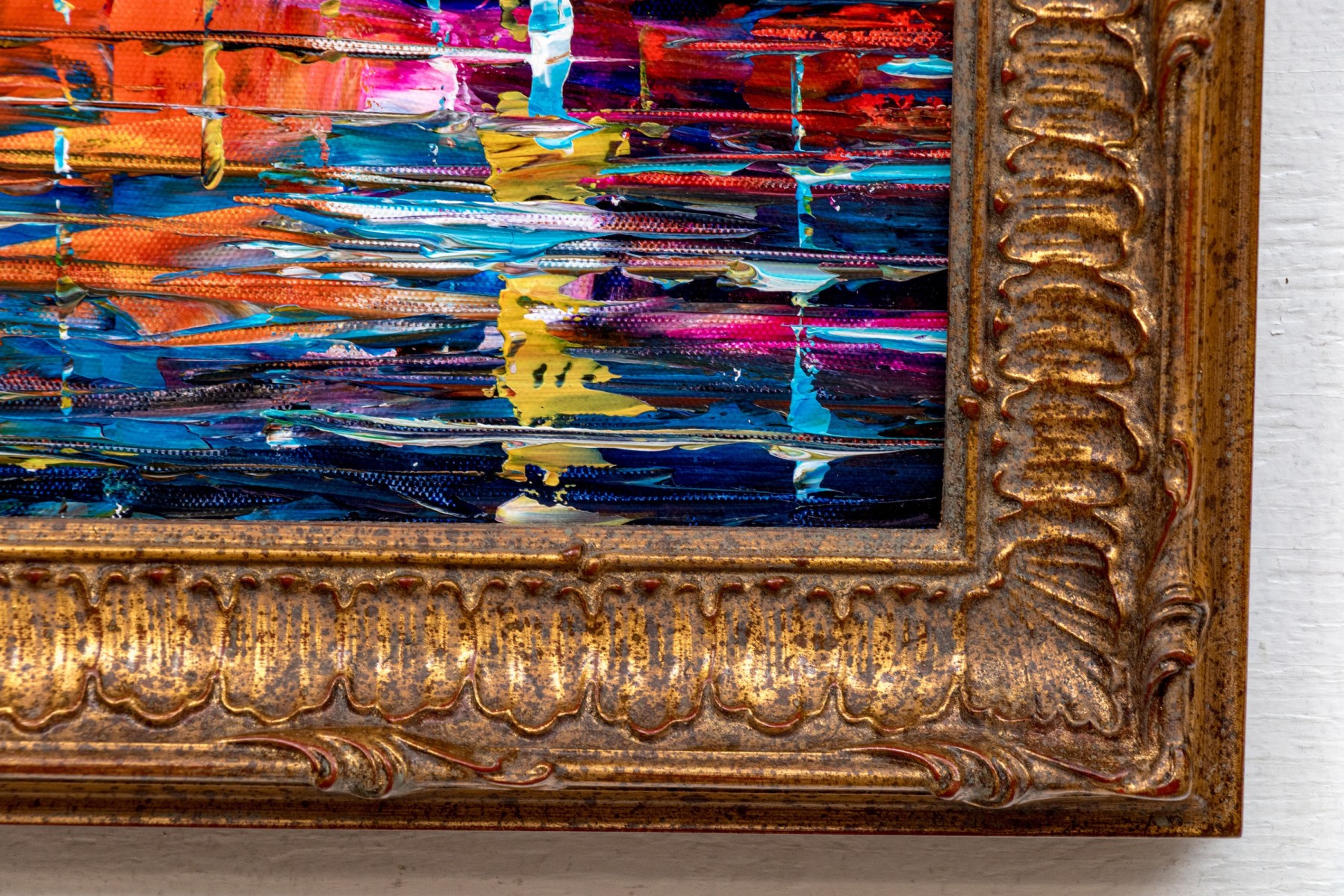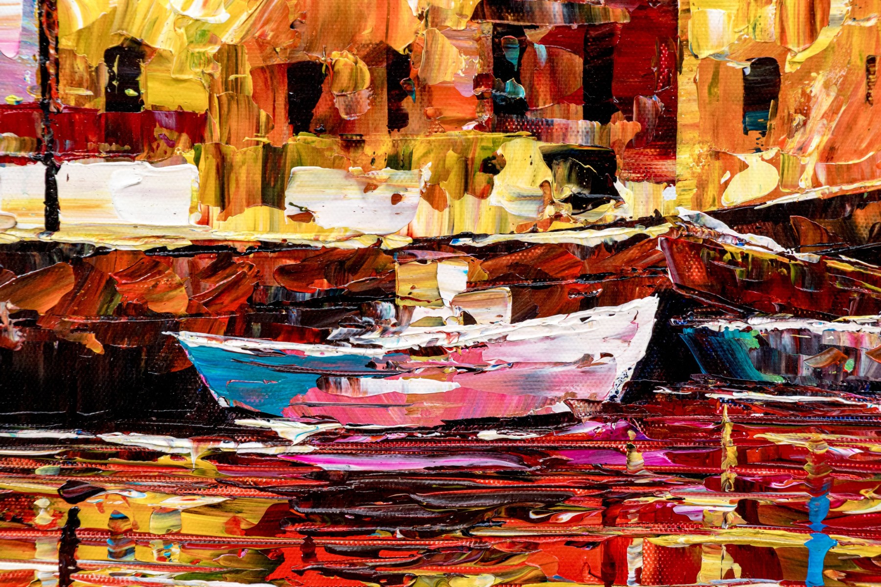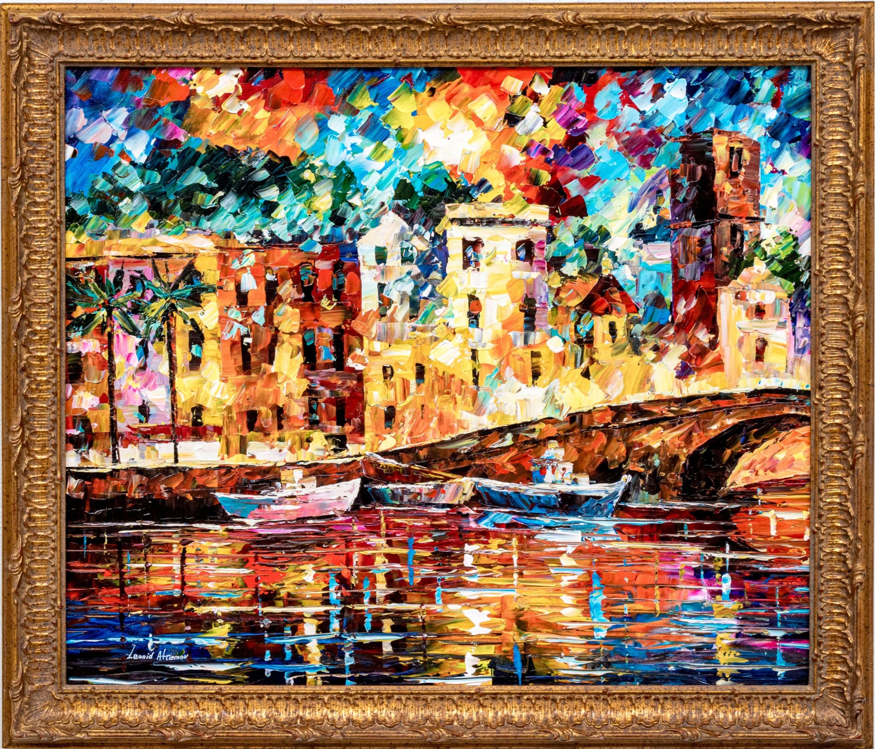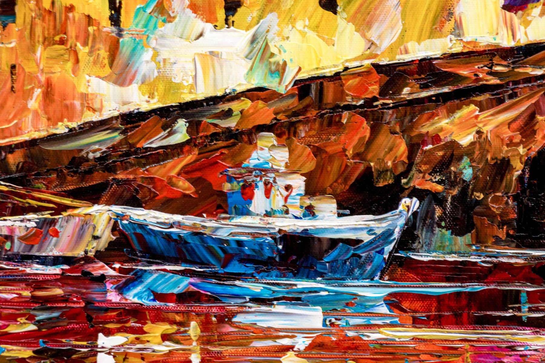 Signed in white lower left; additionally signed on verso. The painting depicts an Impressionist style river or canal with arched bridge and three boats along the bank. The building facades with palm trees and a pointillist style sky.