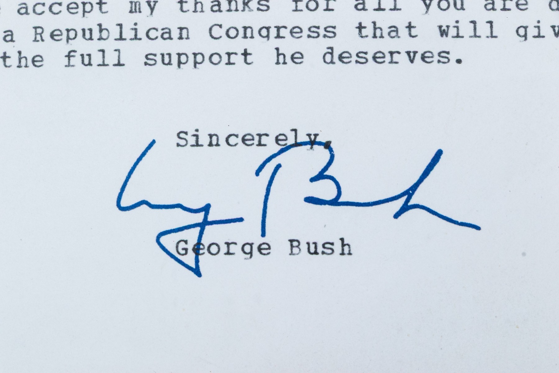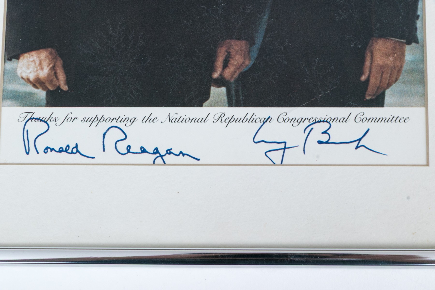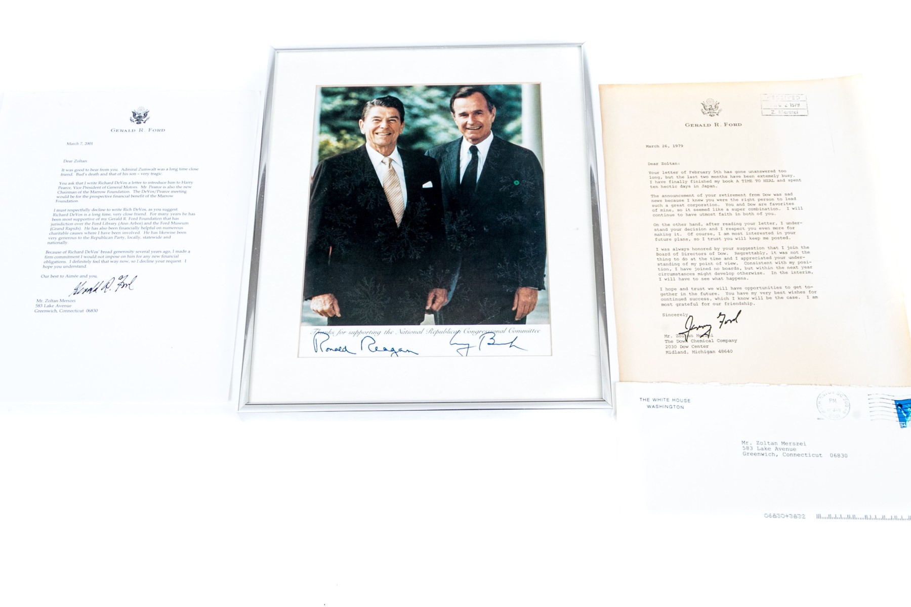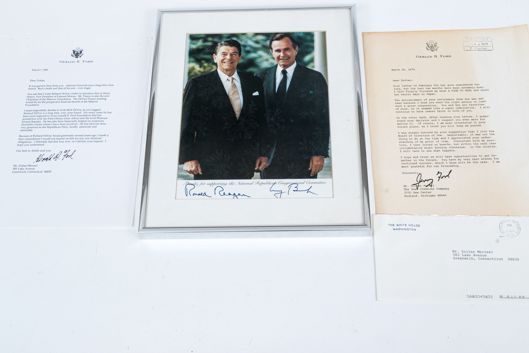 A collection of presidential signatures including letters from 38th US President Gerald R. Ford Jr. and 43rd US President George W. Bush, along with a photograph of 40th US President Ronald Reagan with Vice President George H.W. Bush signed by both beneath the margin.
