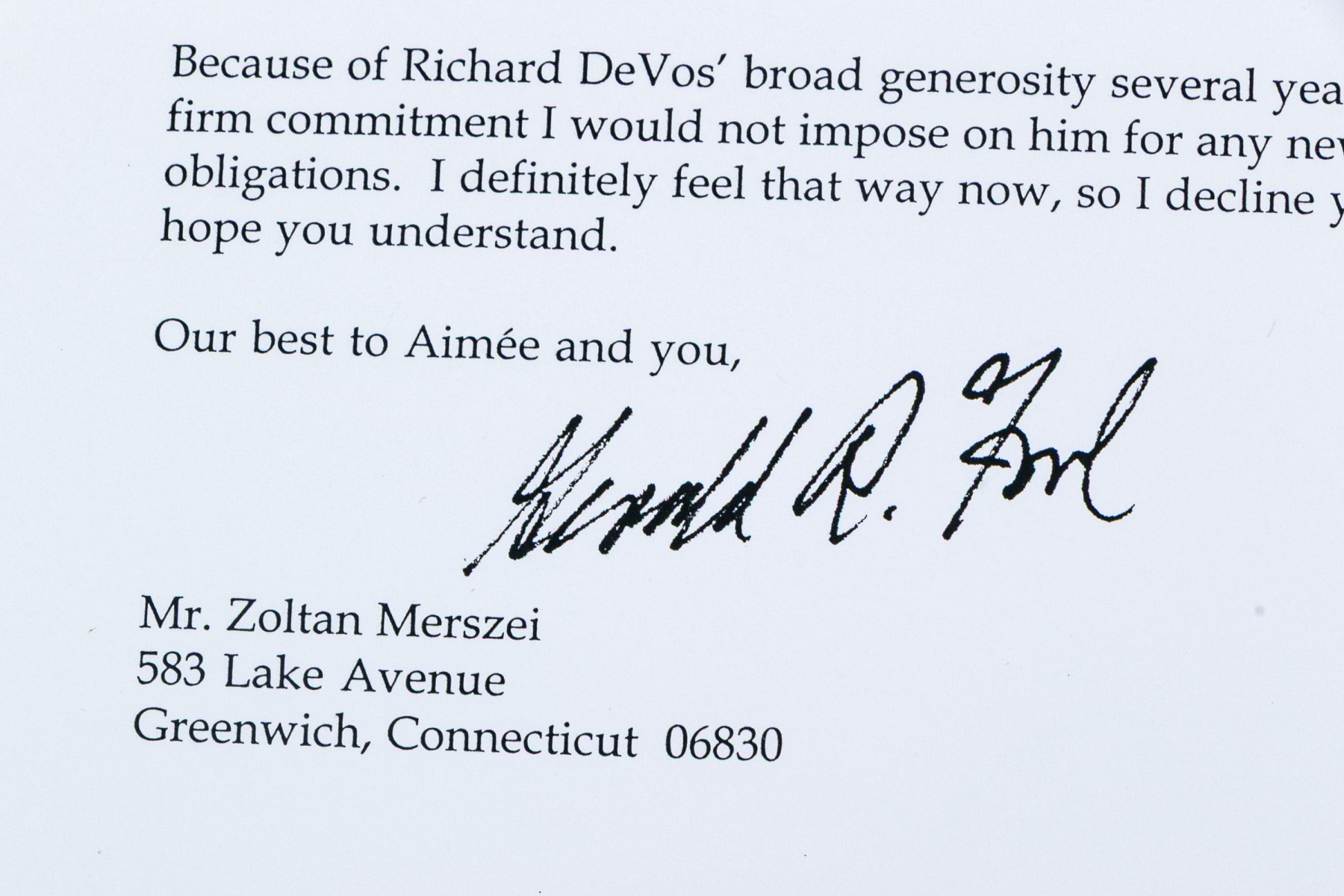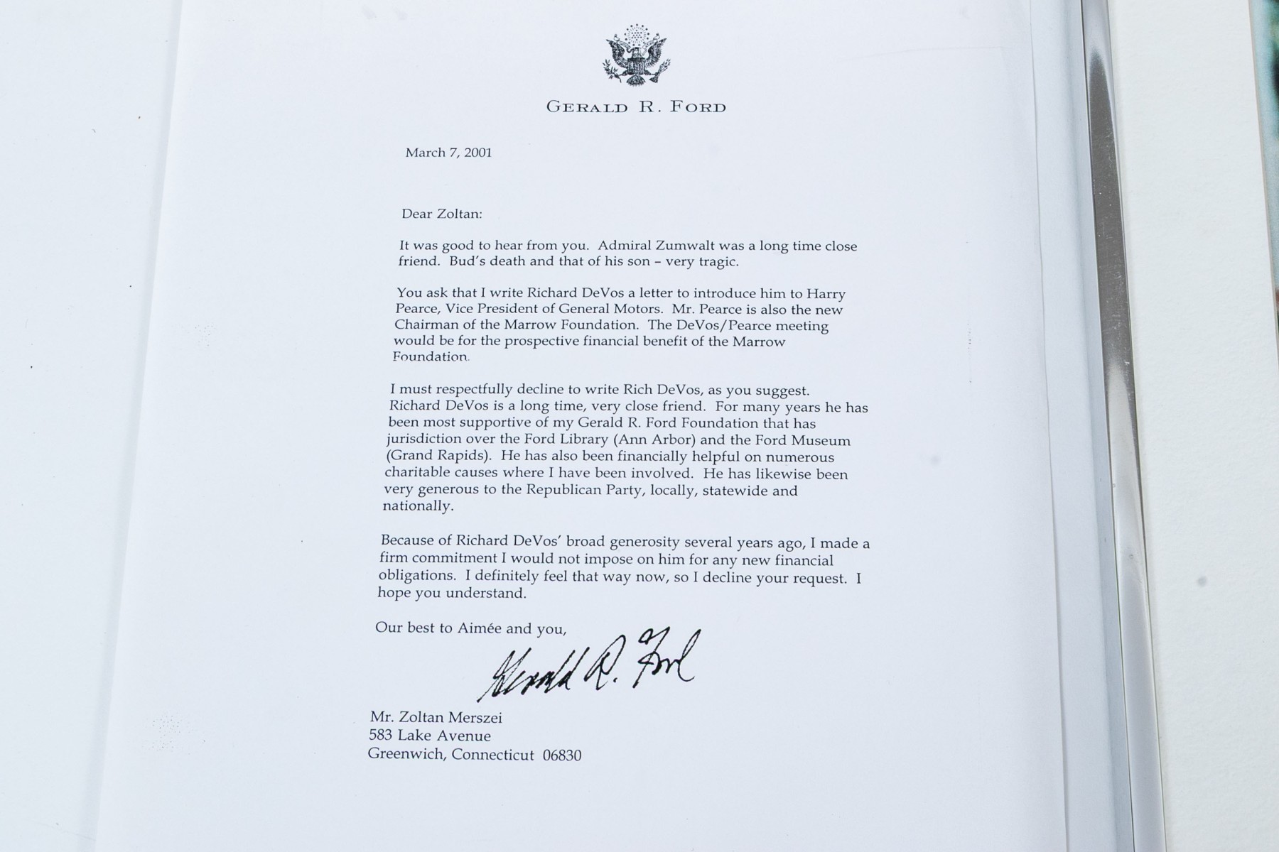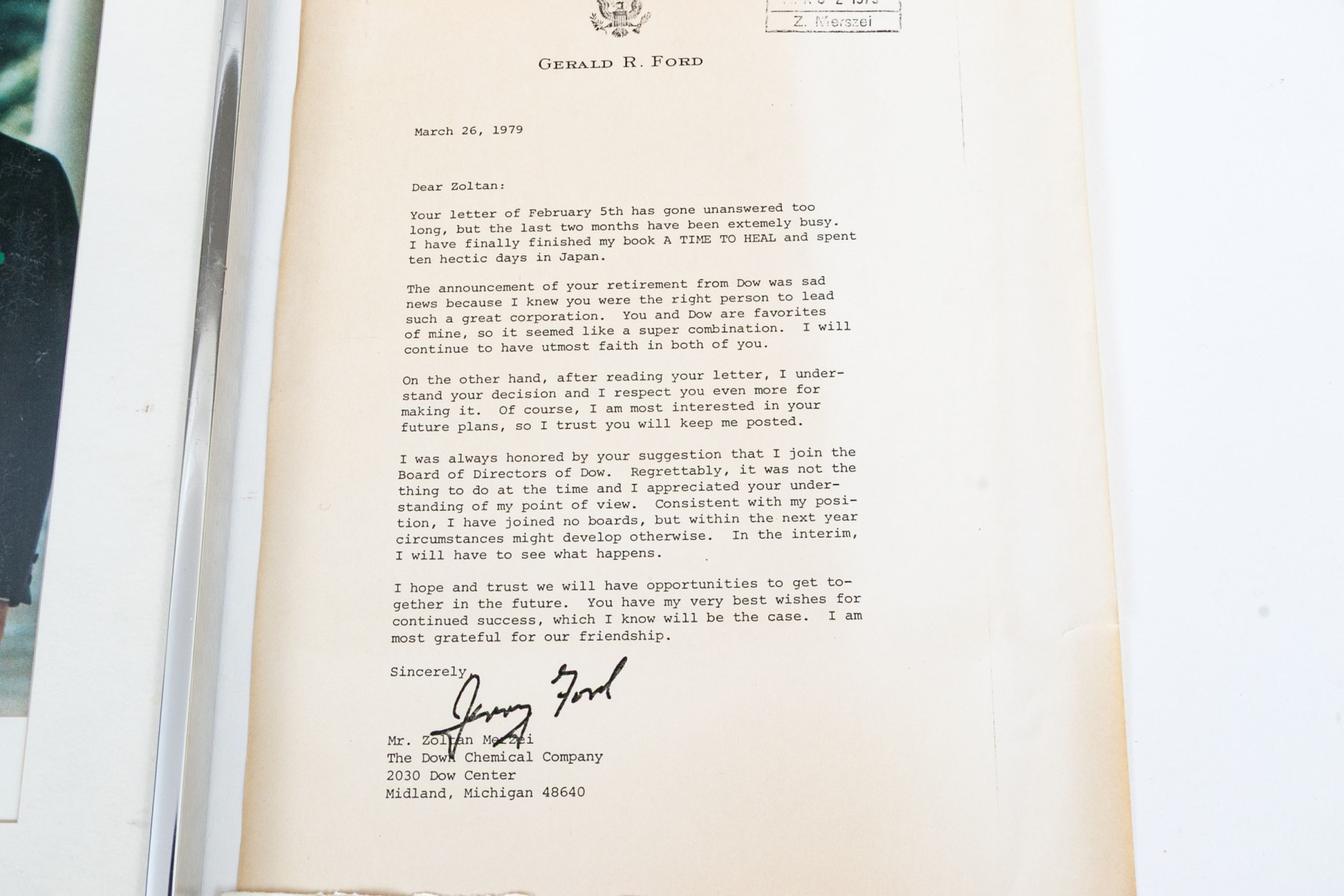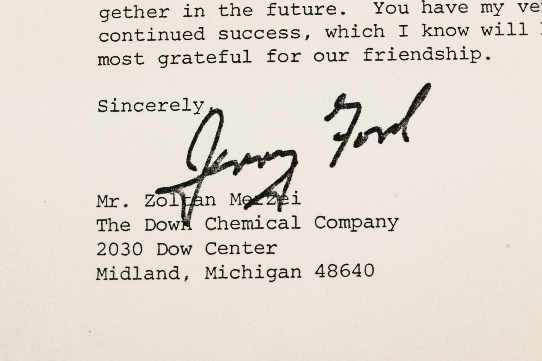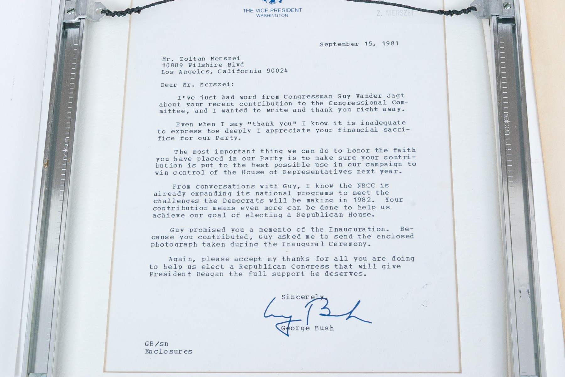 A collection of presidential signatures including letters from 38th US President Gerald R. Ford Jr. and 43rd US President George W. Bush, along with a photograph of 40th US President Ronald Reagan with Vice President George H.W. Bush signed by both beneath the margin.