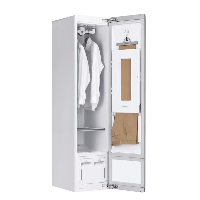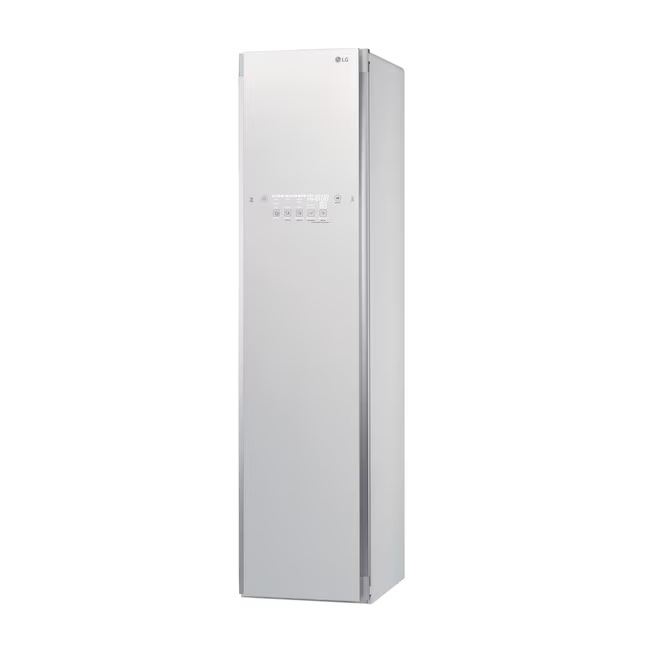 An LG Styler White Programmable Fabric Steamer, designed to refresh and care for garments with gentle steam technology. Finished in a sleek white cabinet, it helps reduce wrinkles, odors, and allergens while keeping clothes looking their best. A smart and convenient addition to a modern laundry or dressing area.
