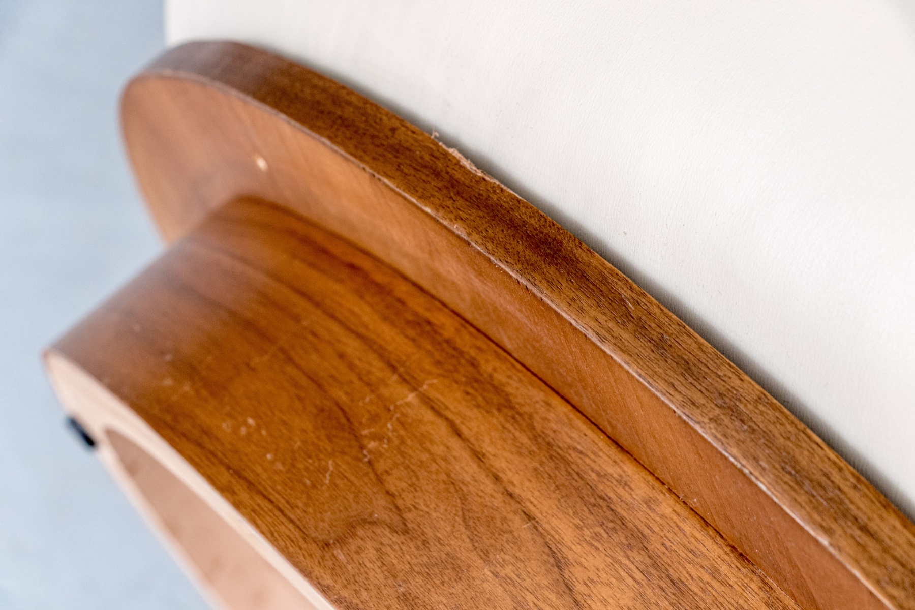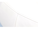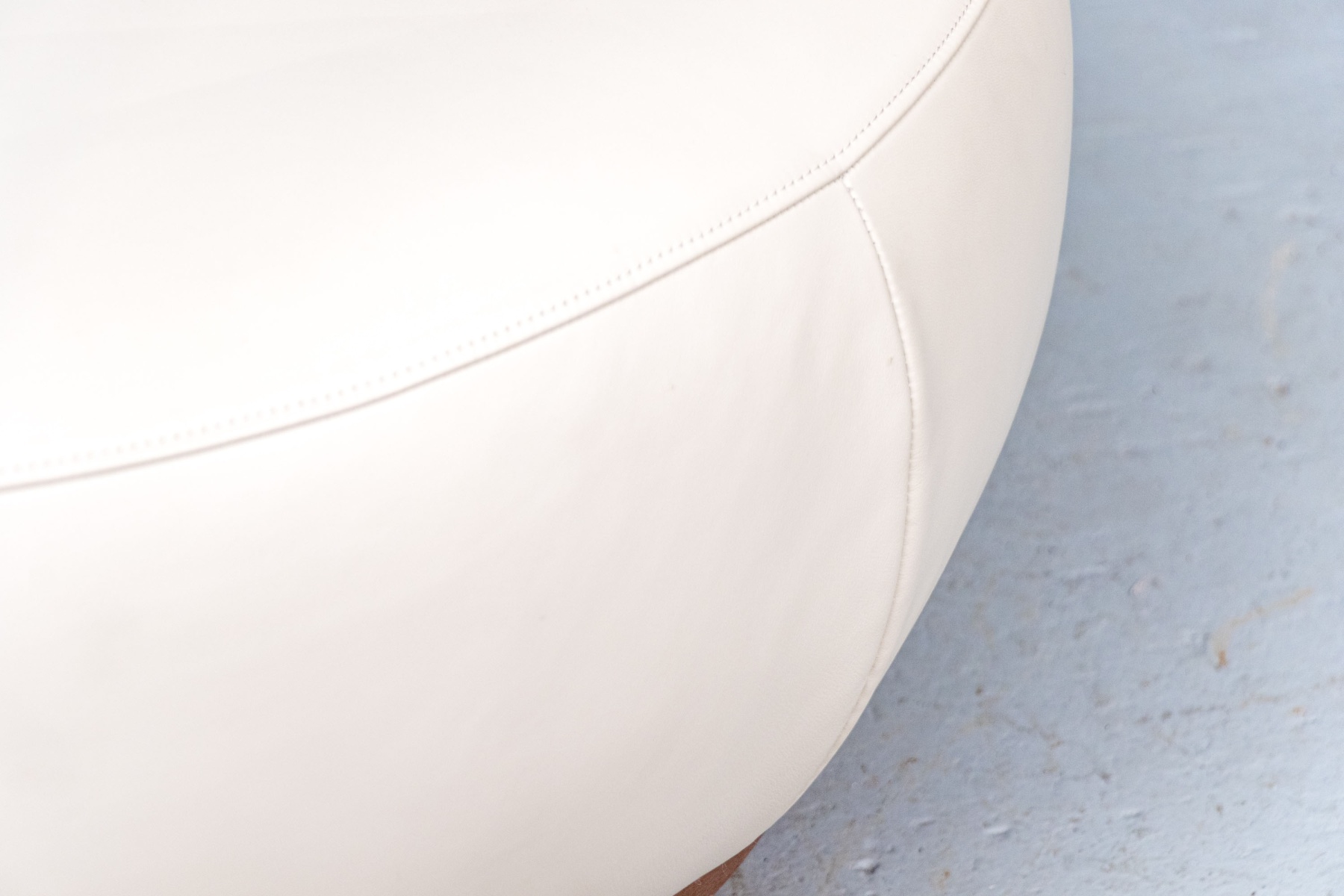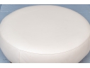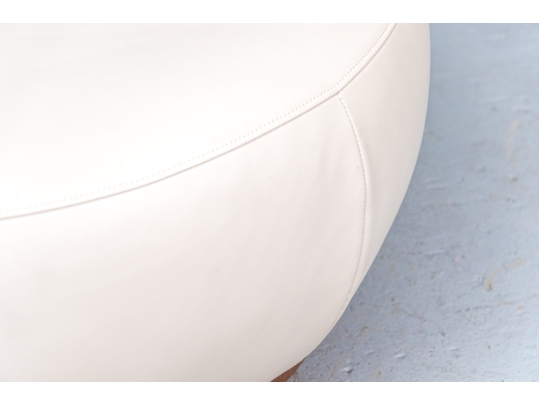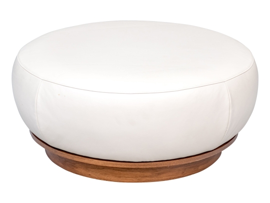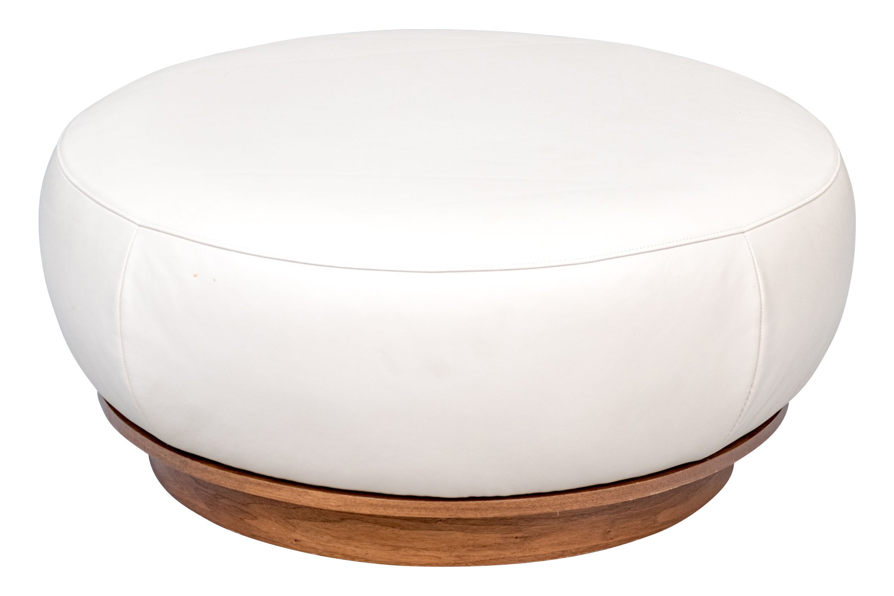 A custom made ottoman featuring an oversized faux leather cushion on a turned solid wood base. It is a versatile piece that can be used as a footrest, extra seating, or an alternative coffee table. Custom made by LIC Furniture, makers of fine quality custom furniture.