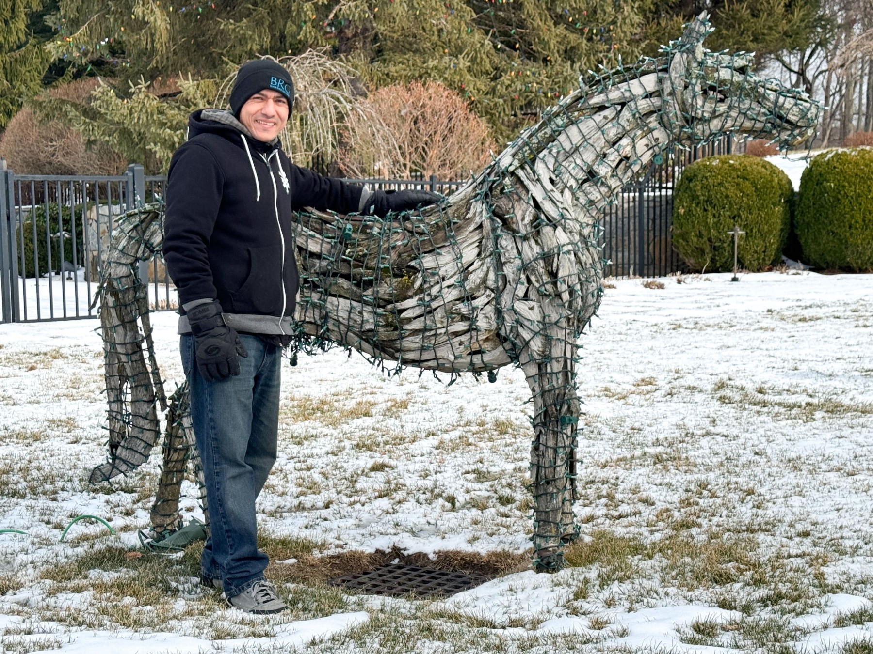 An impressive life size handcrafted horse sculpture beautifully constructed of textural driftwood for an eye-catching rustic aesthetic. Beautifully detailed and nicely formed for an eye-catching statement piece perfect for any ranch or farmhouse.