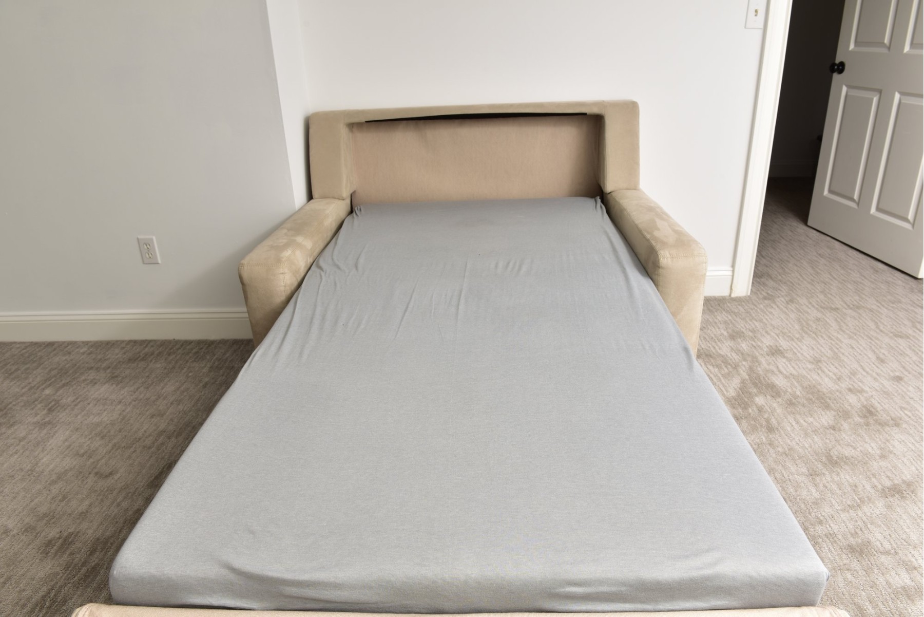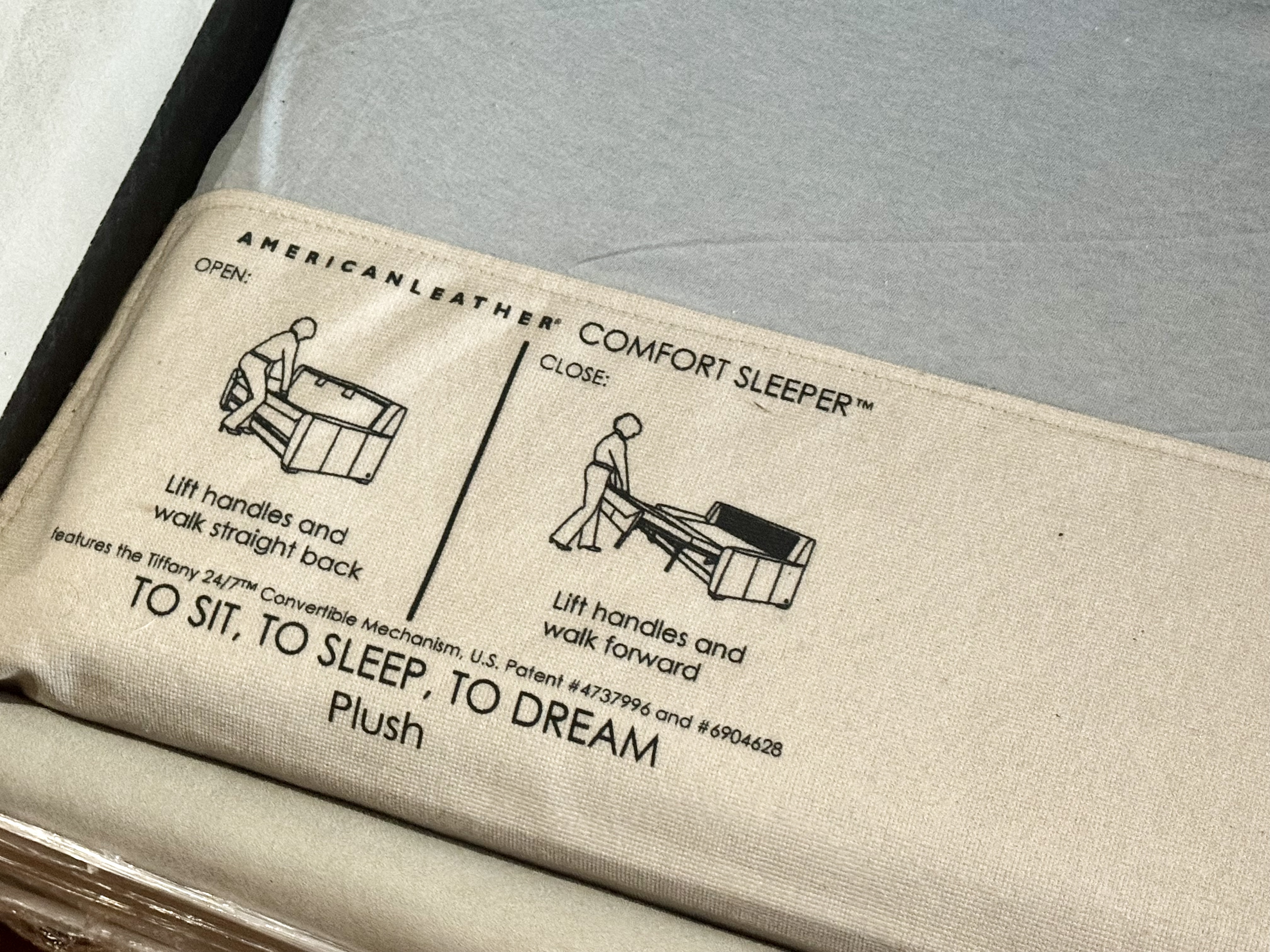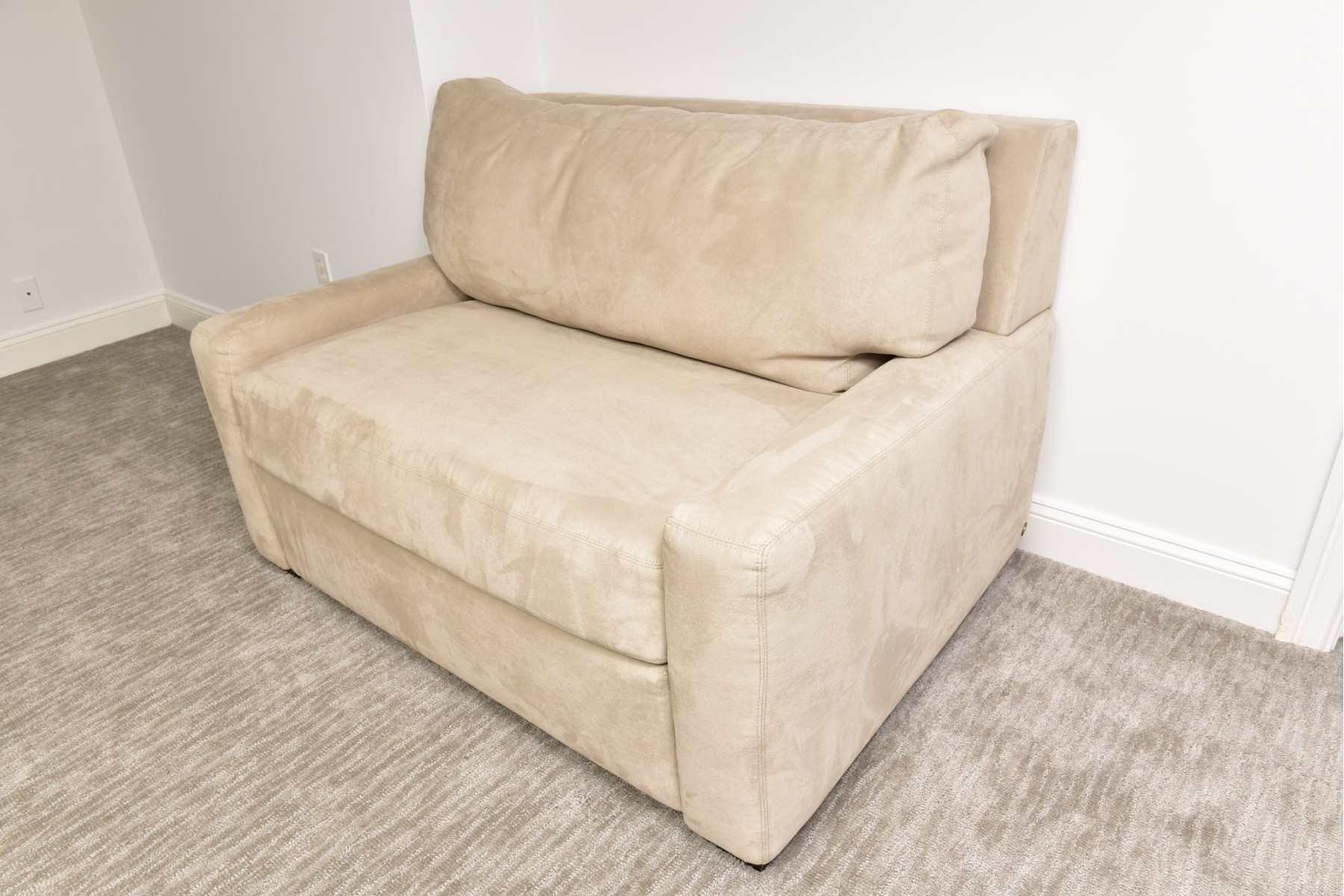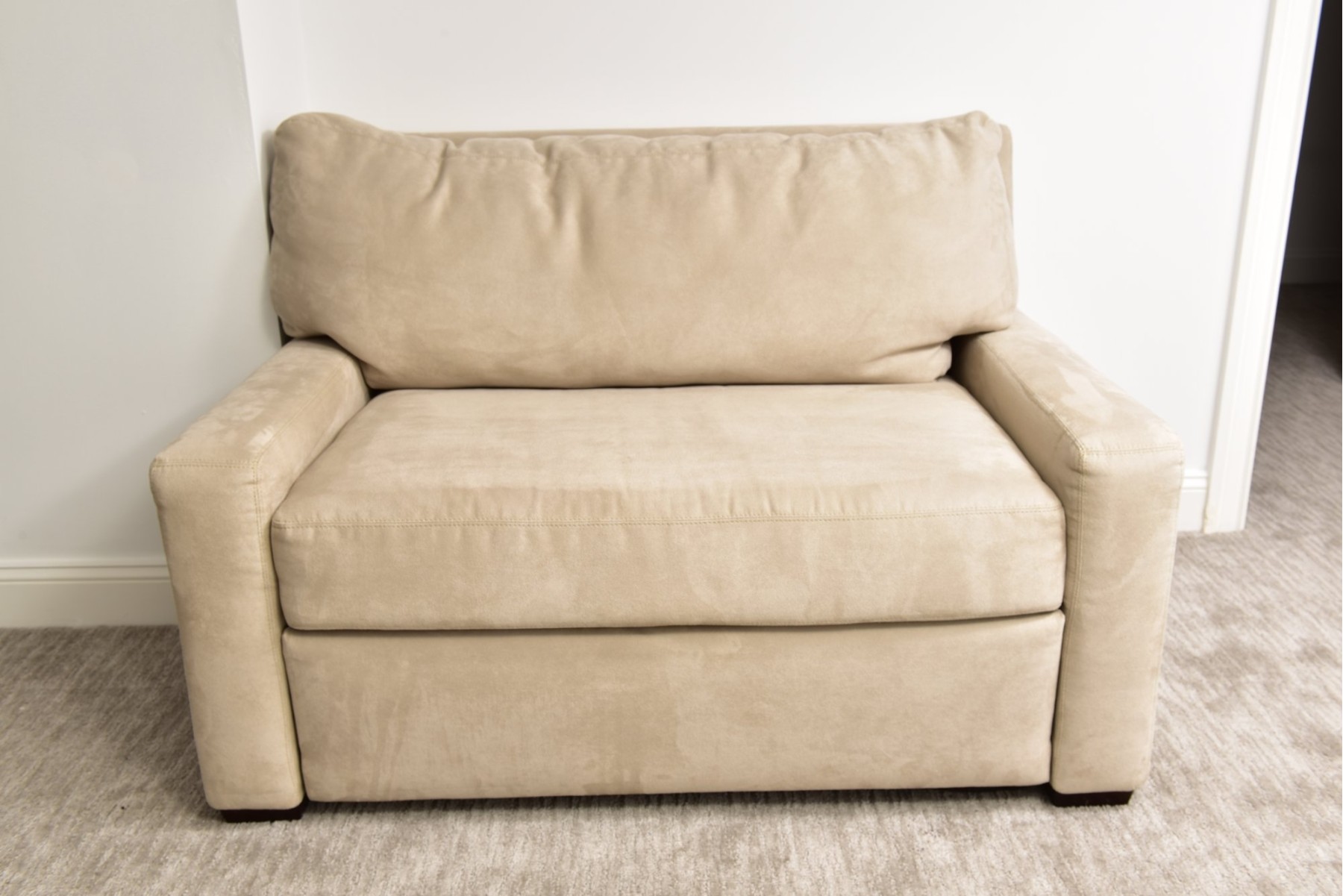 The American Leather twin size chair and a half comfort sleeper combines style, comfort, and functionality in a compact design. Upholstered in premium suede, this chair features a plush seat that offers ample space for lounging, making it perfect for reading or relaxing. The standout feature is its easily accessible sleeper mechanism, which smoothly unfolds to reveal a twin-sized mattress, ideal for accommodating overnight guests. The sleek lines and modern silhouette make it a versatile addition to any room, whether in a living area, home office, or guest room. With its durable construction and elegant design, this chair and a half sleeper seamlessly blends practicality with sophistication.