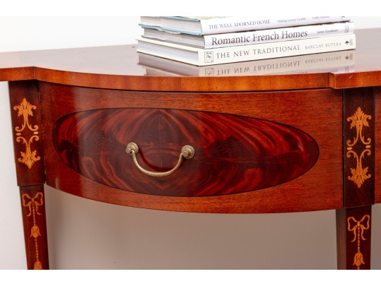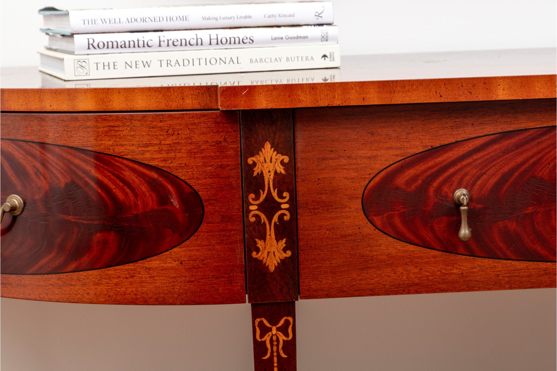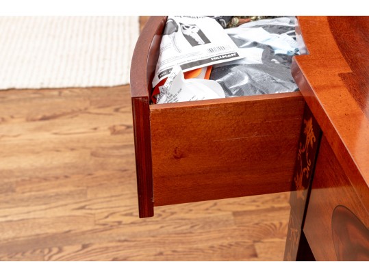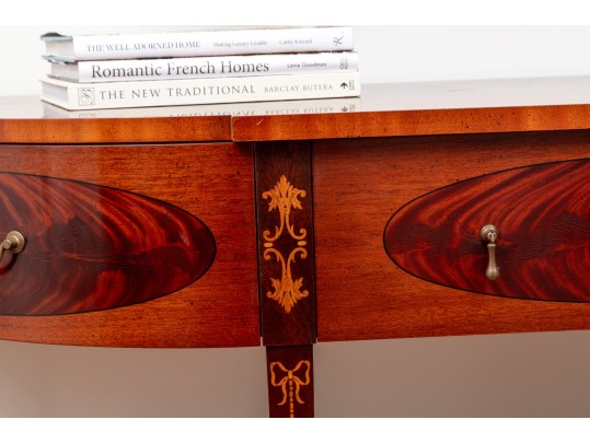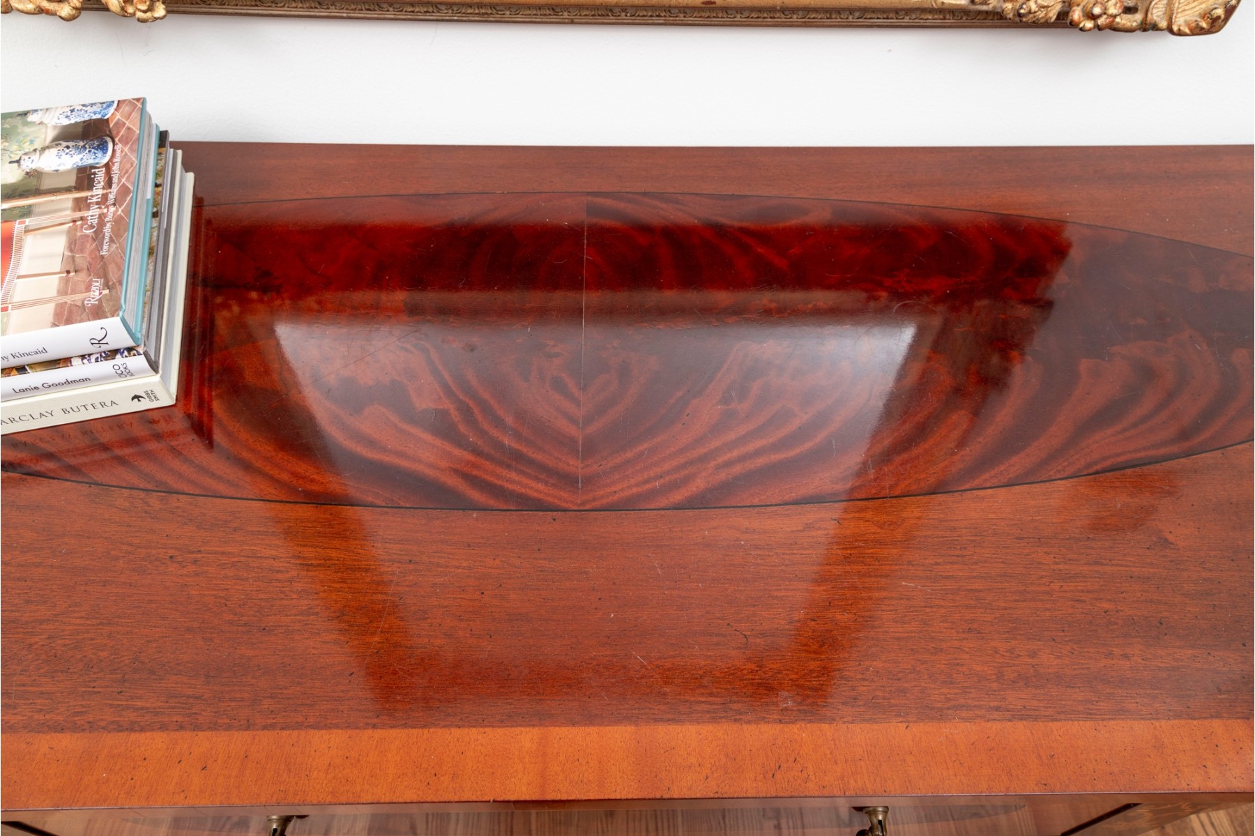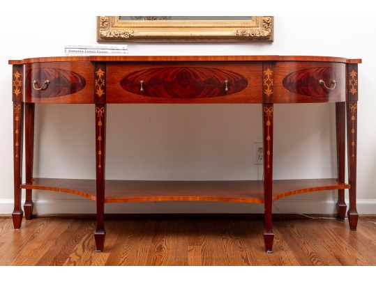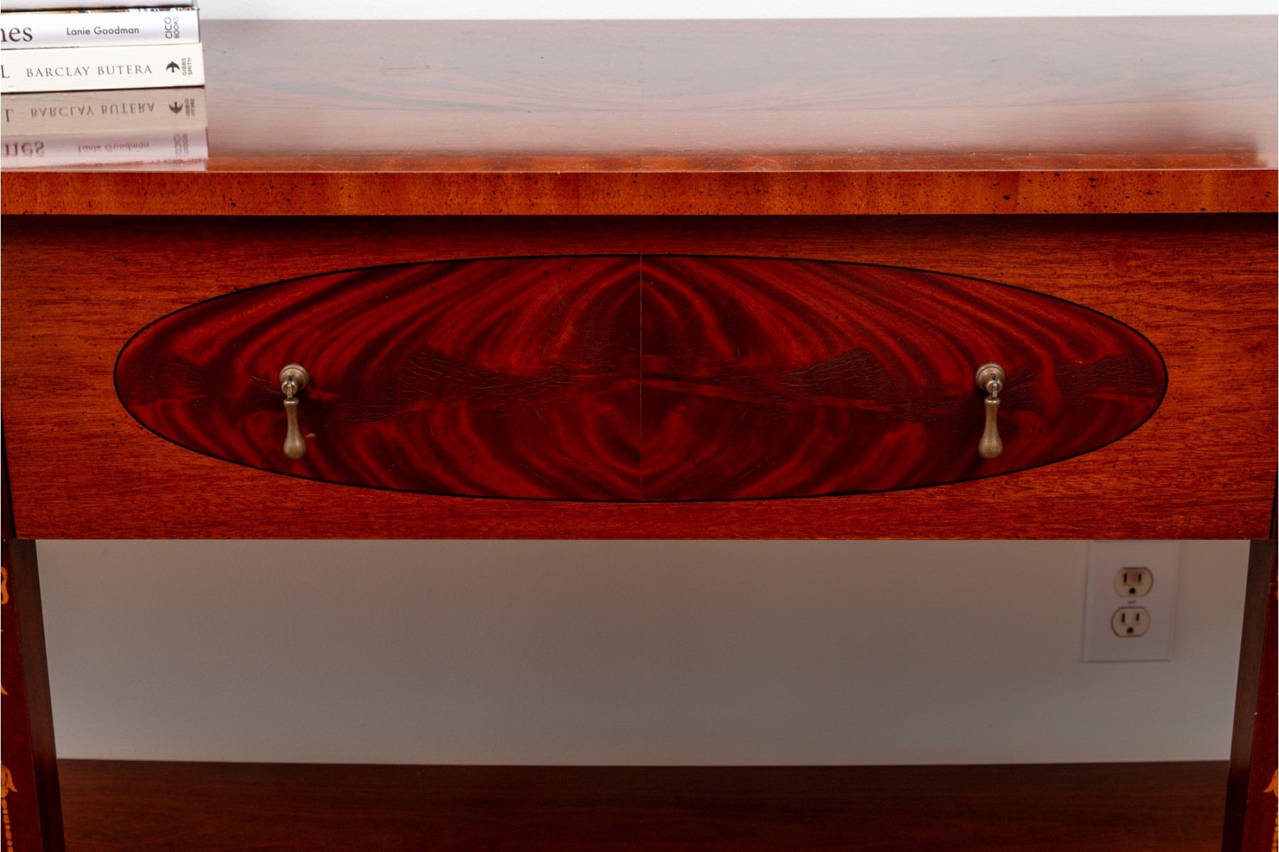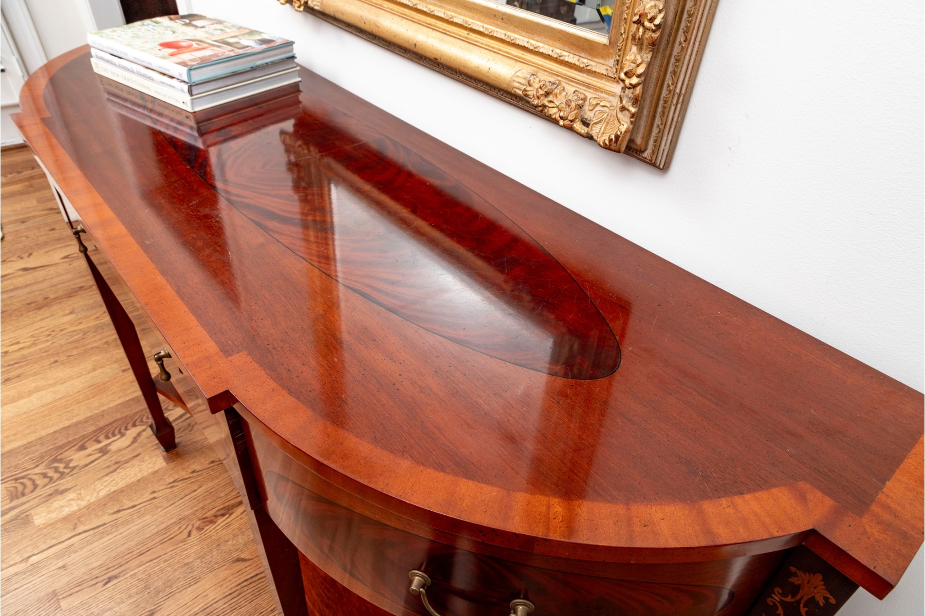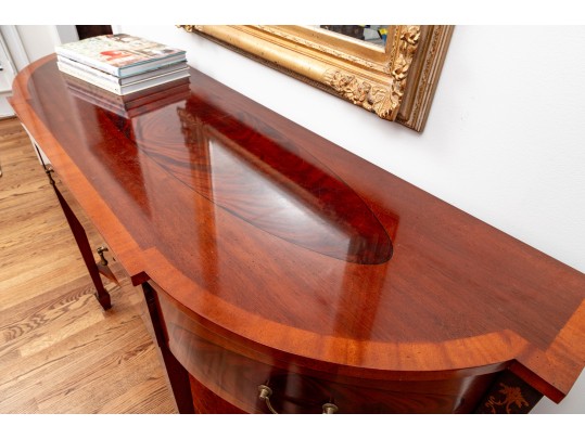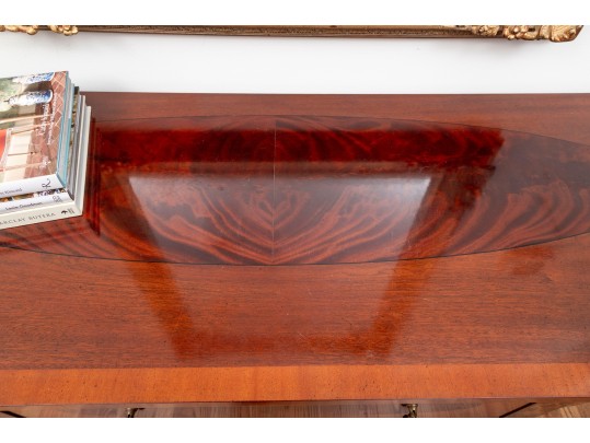 A stunning sideboard by Lilian August, embellished with flame mahogany drawer fronts, traditional brass pull handles and decorative inlaid stencils. Contents not included.