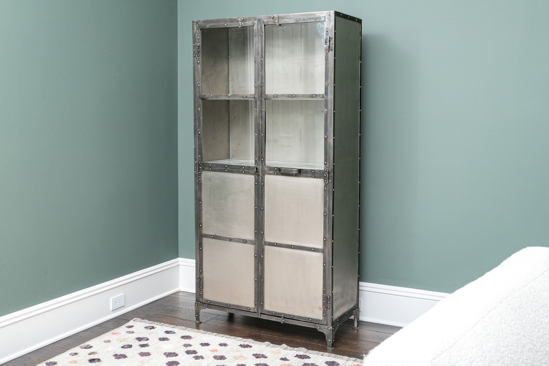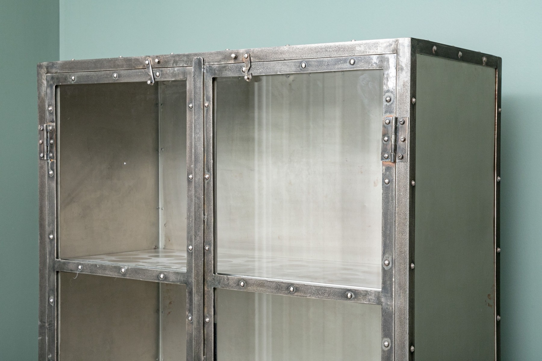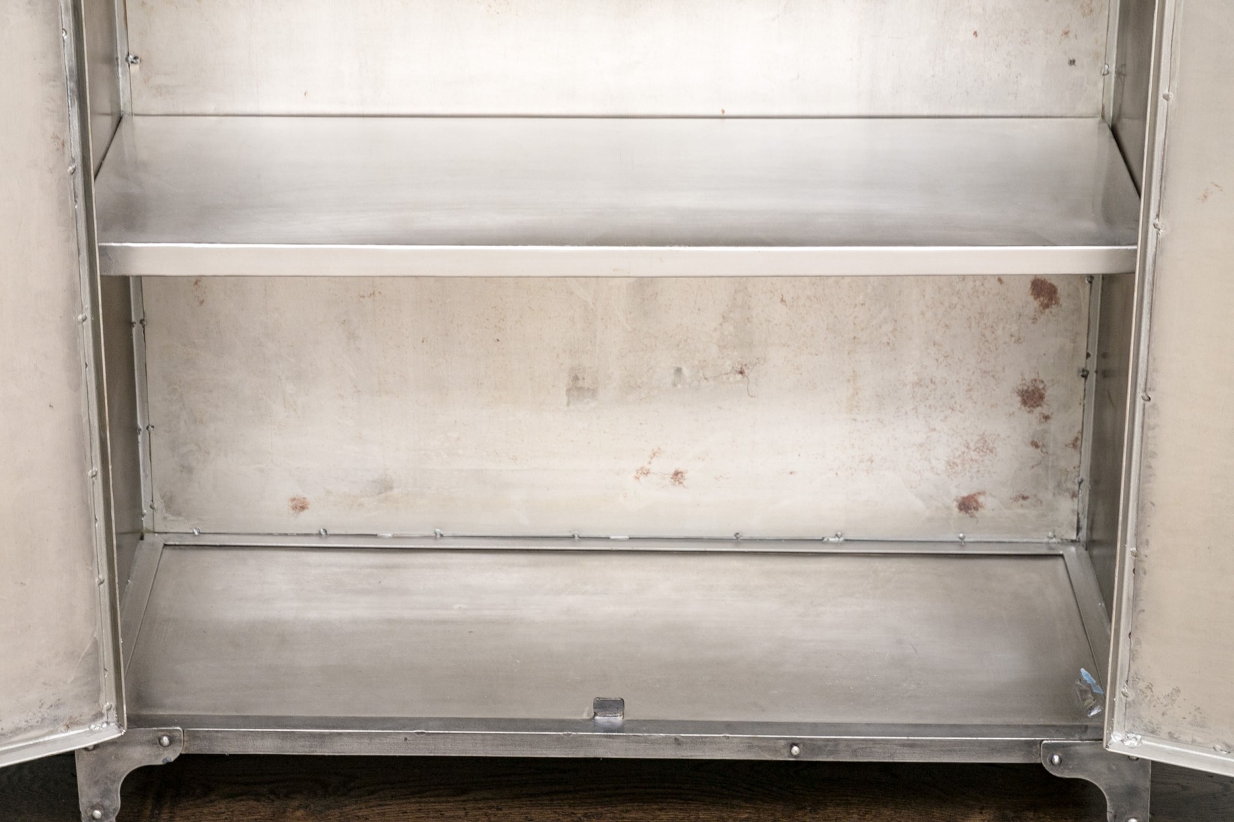 This captivating piece, inspired by an industrial foundry cabinet, masterfully combines mixed metals. The dark iron frame creates a striking contrast with the antiqued nickel panels, and construction marks enhance its character. Long cabinet doors unveil both visible and concealed shelves, making it a functional and visually intriguing addition to your space.
