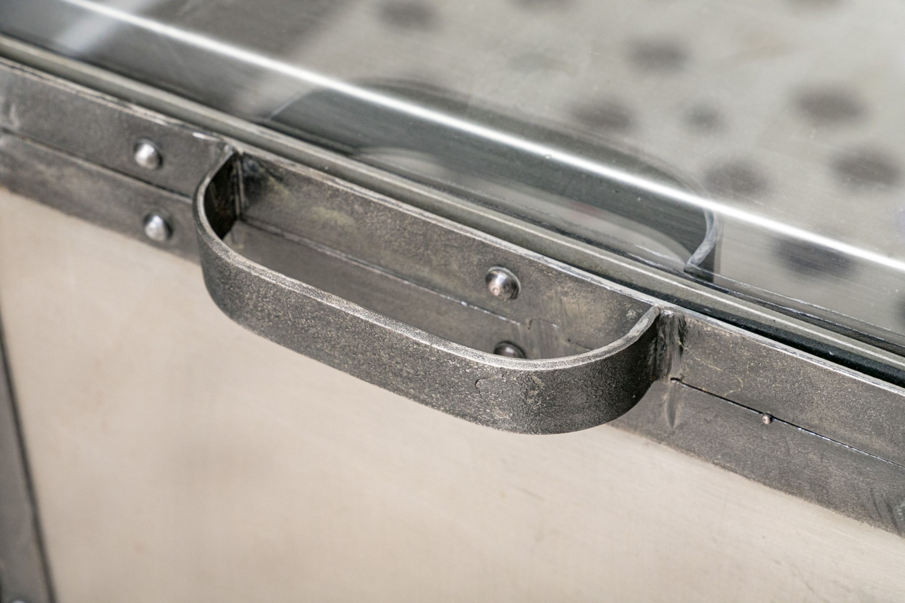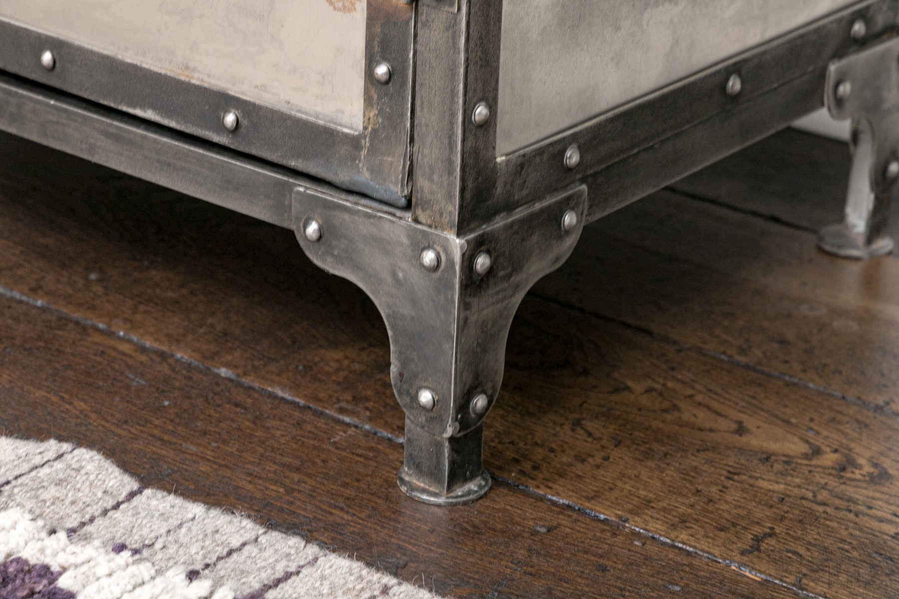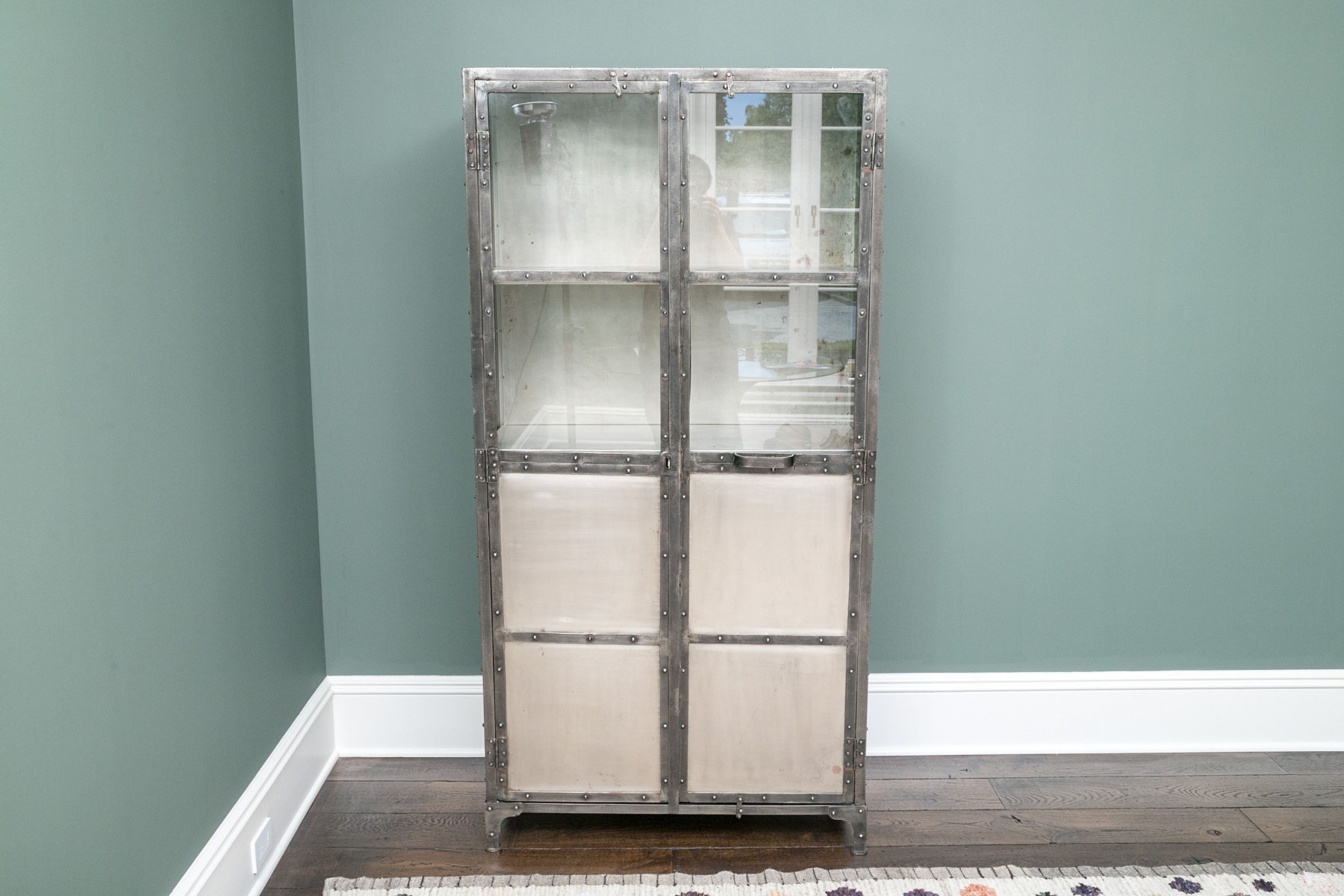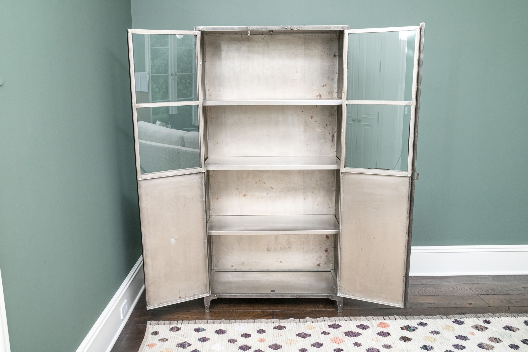 This captivating piece, inspired by an industrial foundry cabinet, masterfully combines mixed metals. The dark iron frame creates a striking contrast with the antiqued nickel panels, and construction marks enhance its character. Long cabinet doors unveil both visible and concealed shelves, making it a functional and visually intriguing addition to your space.