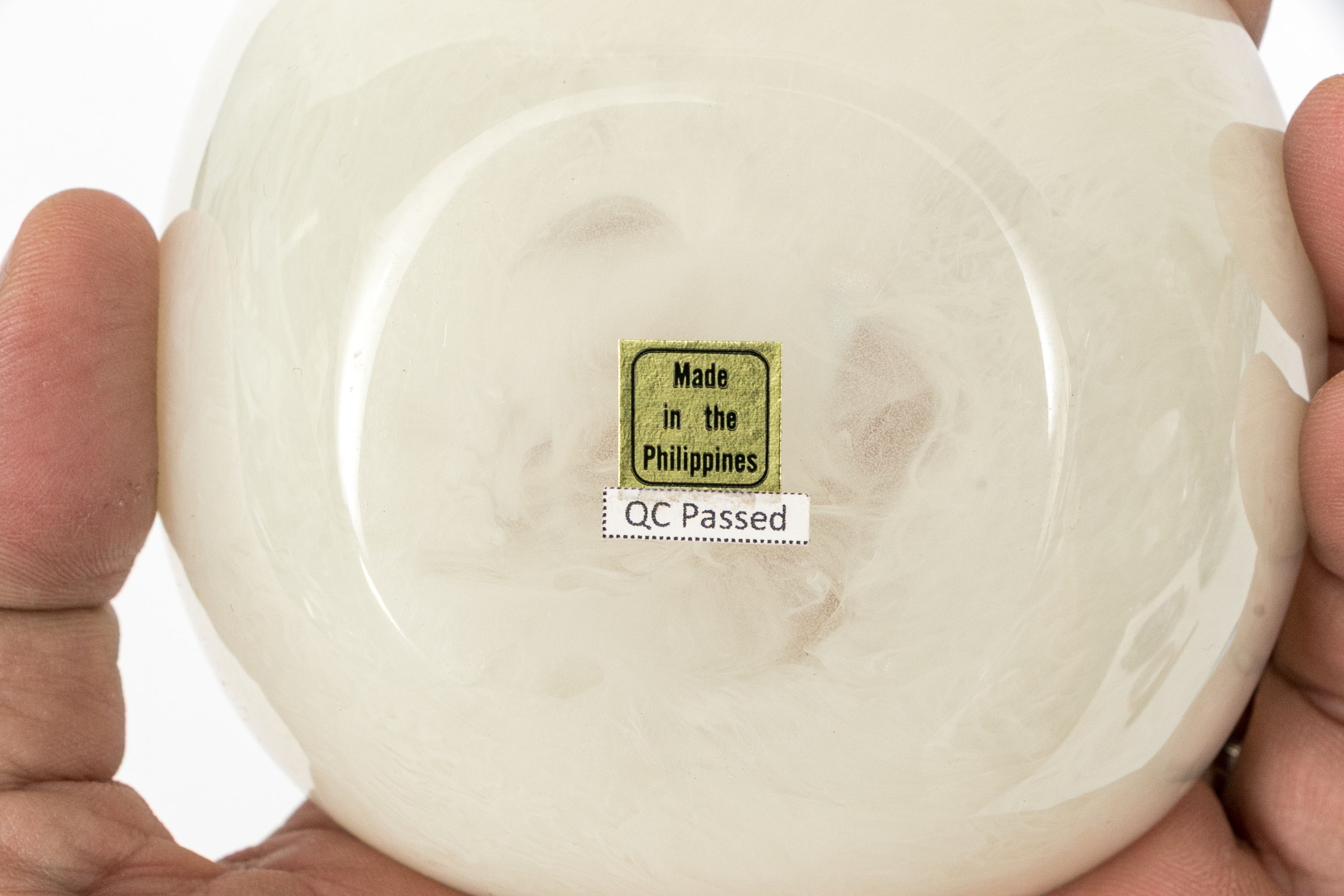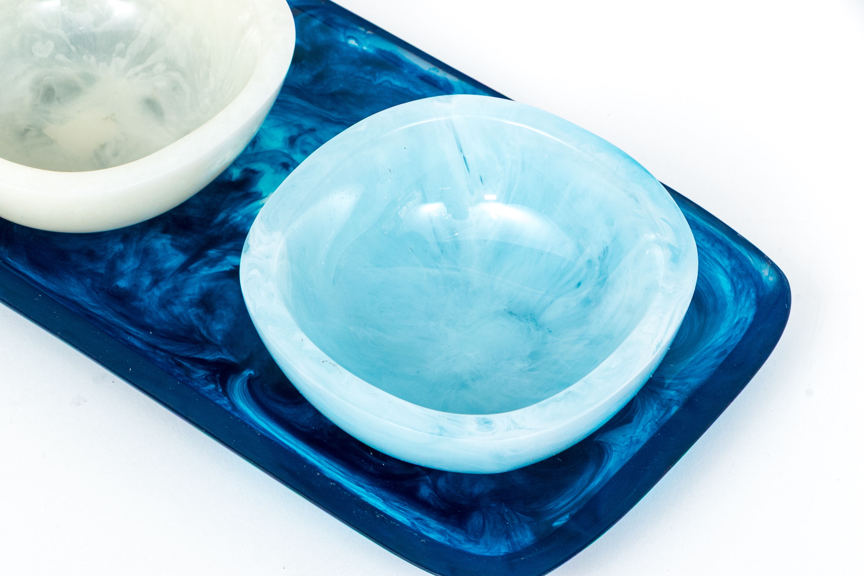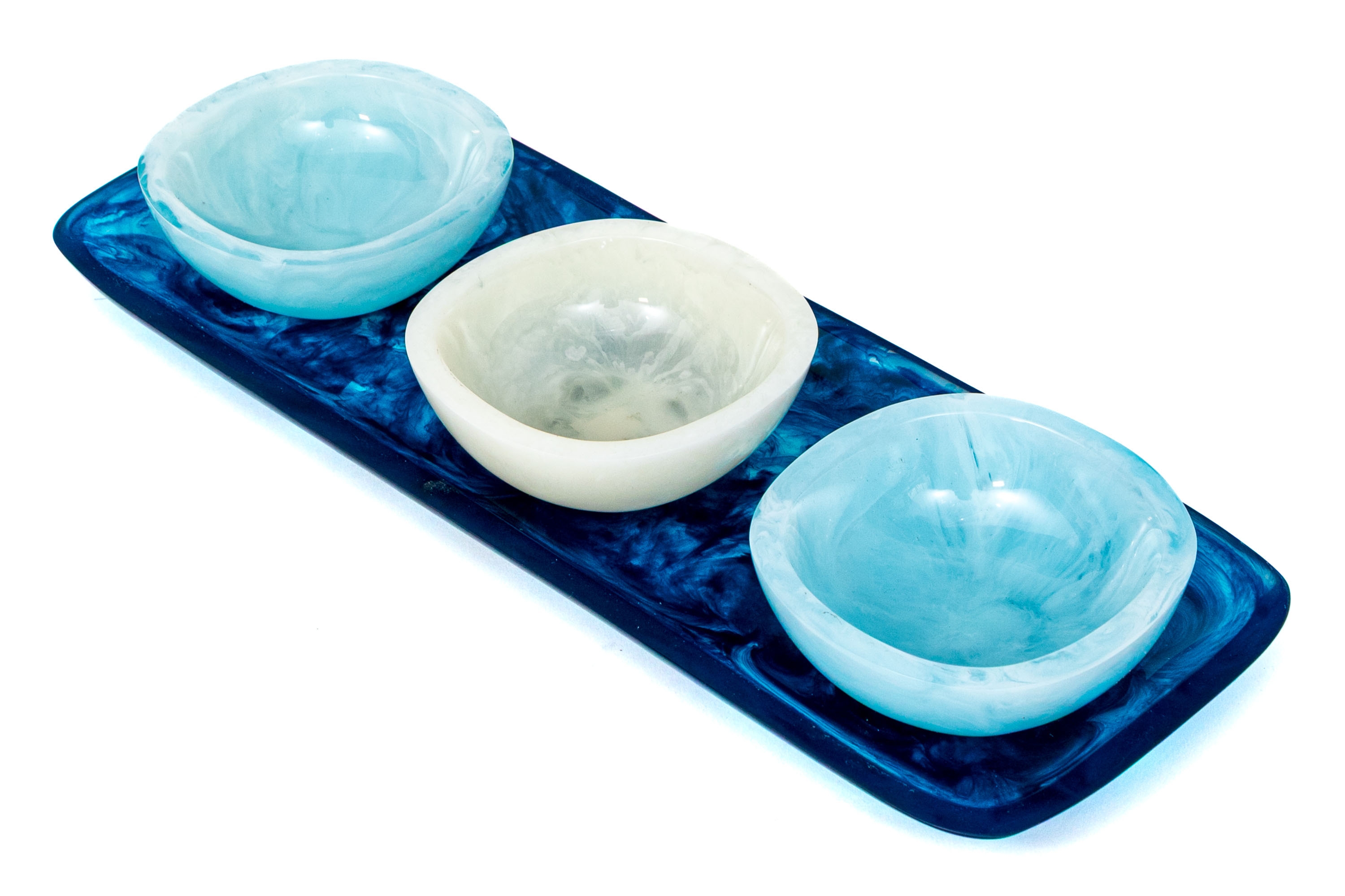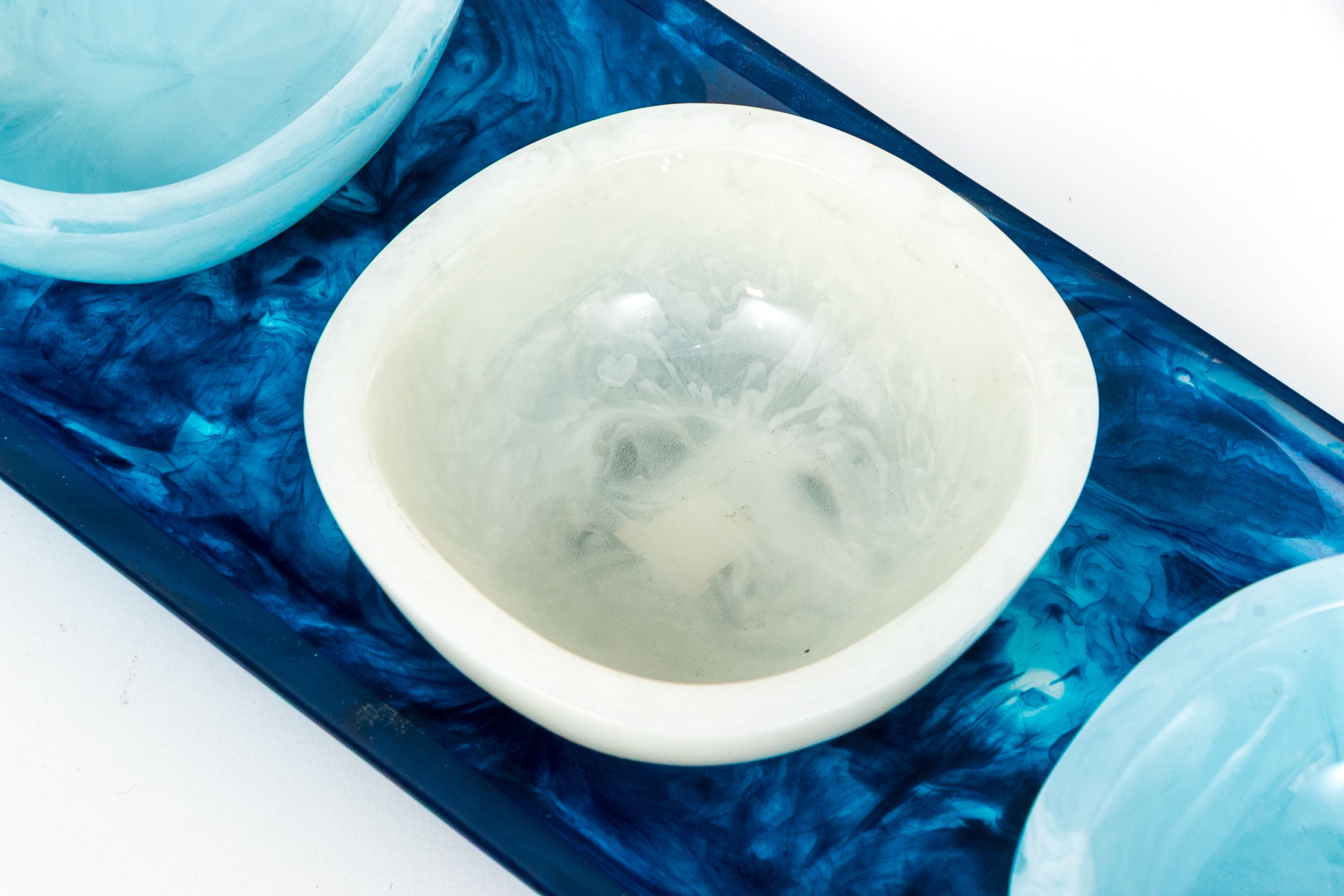 Each marked Made in Phillipines to a label underneath. The set is comprised of a long blue serving tray with three smaller bowls. All are acrylic and resin and all present handsomely.