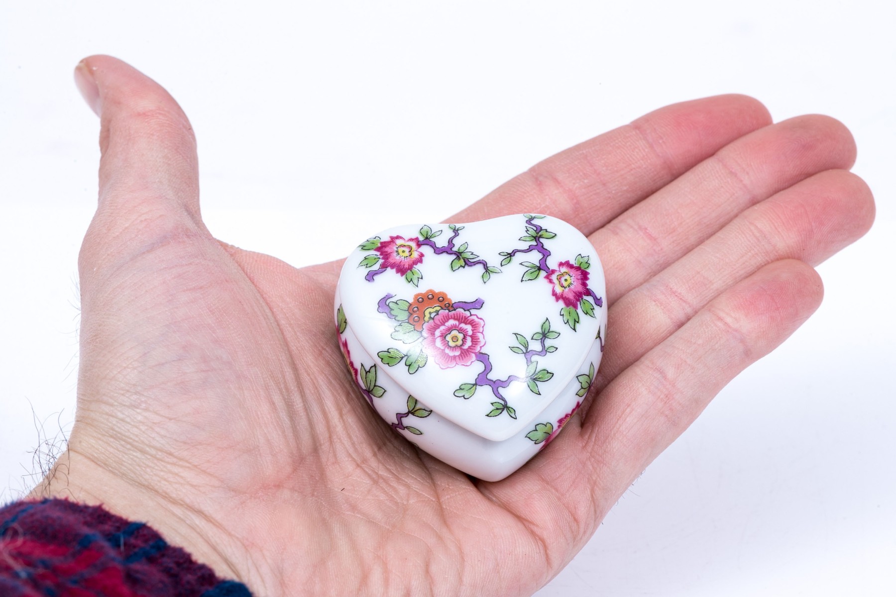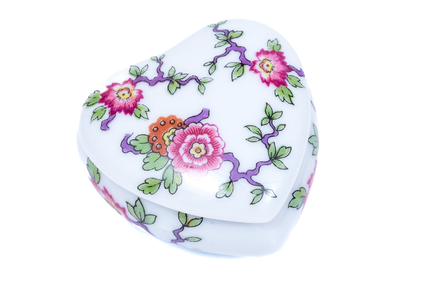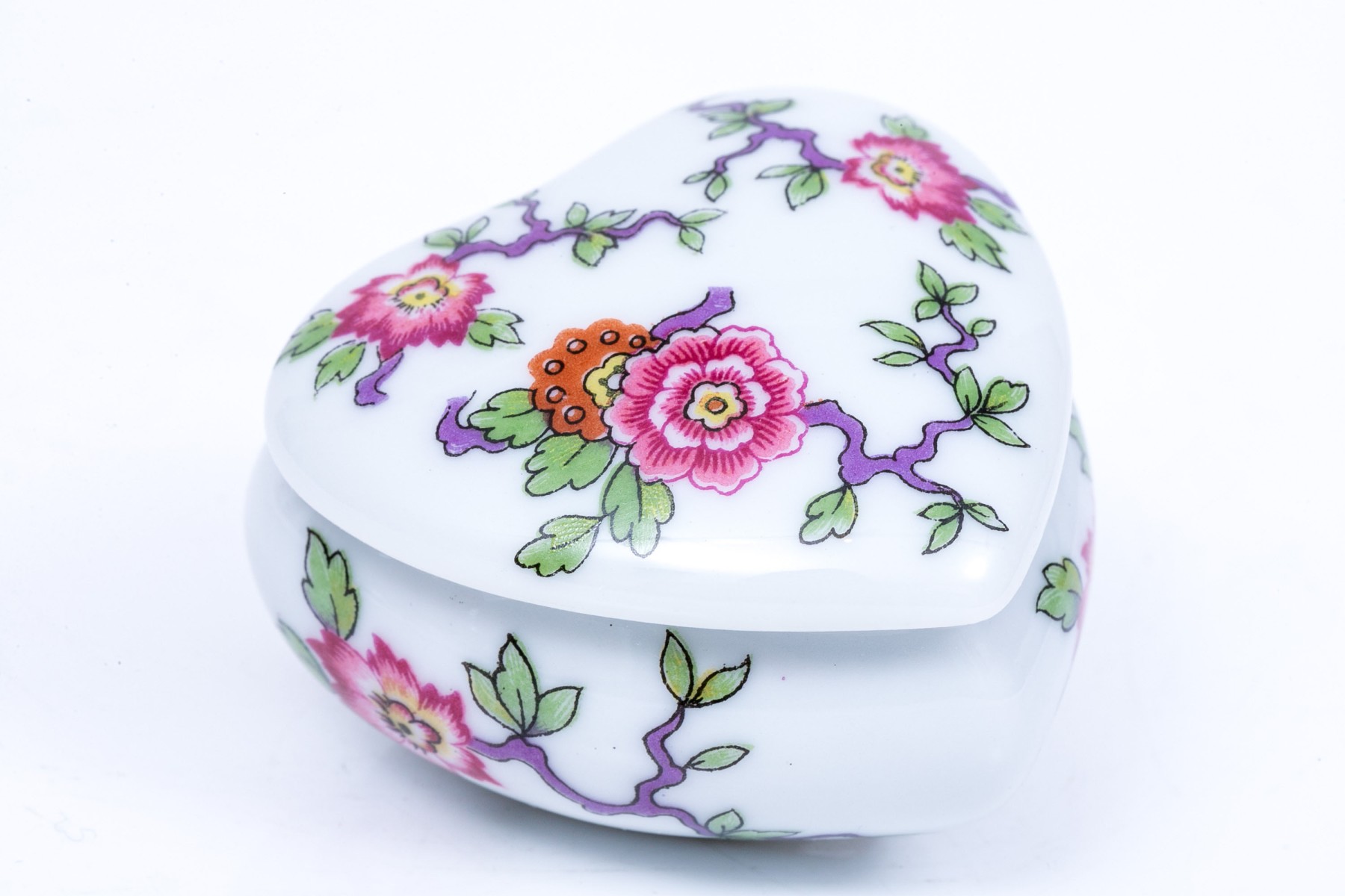 Limoges French floral painted box. The box has a heart form with colorful floral design.