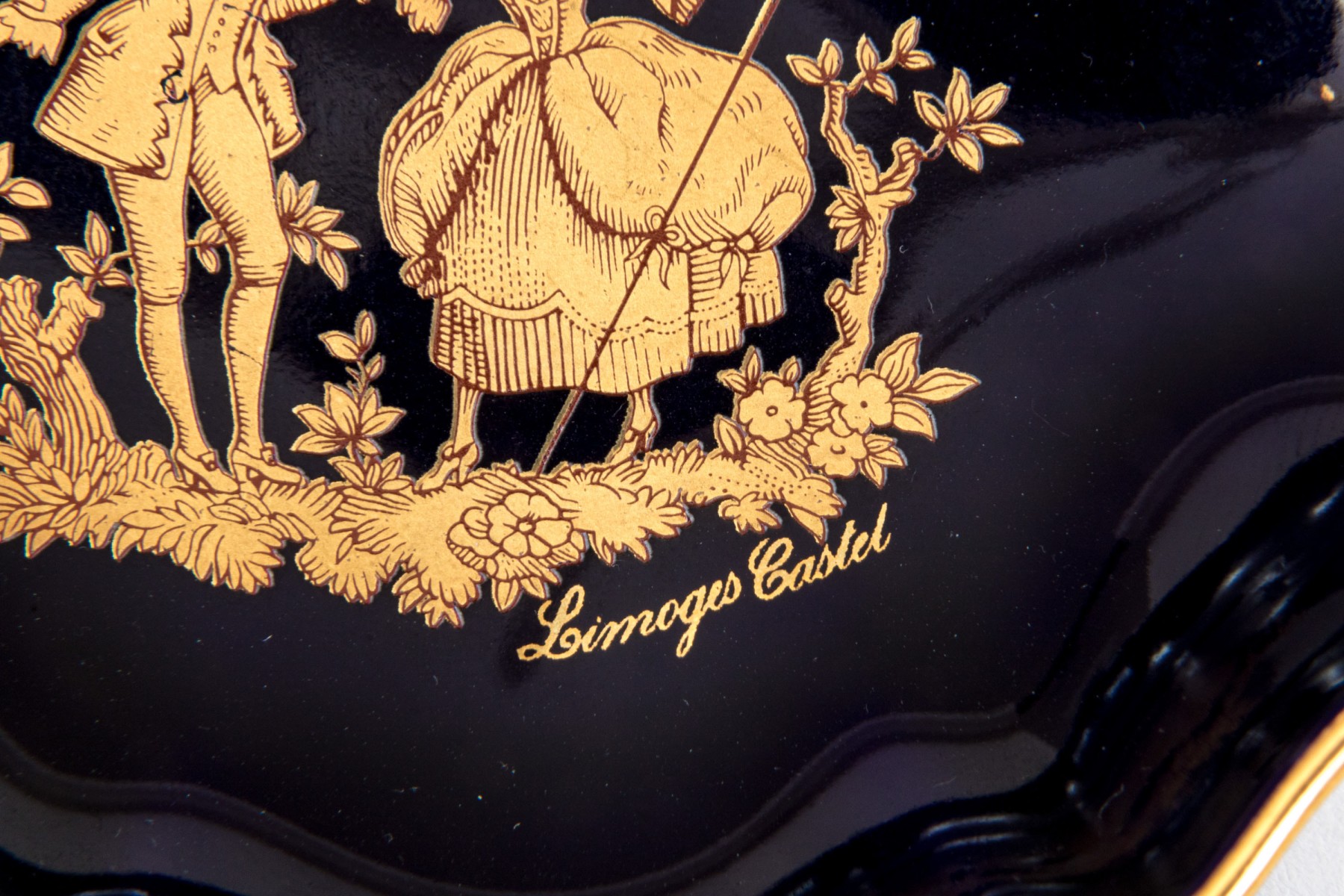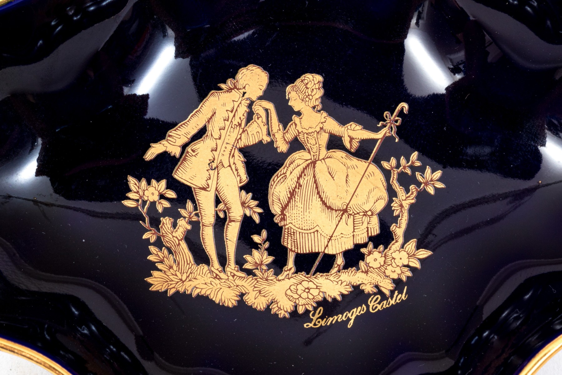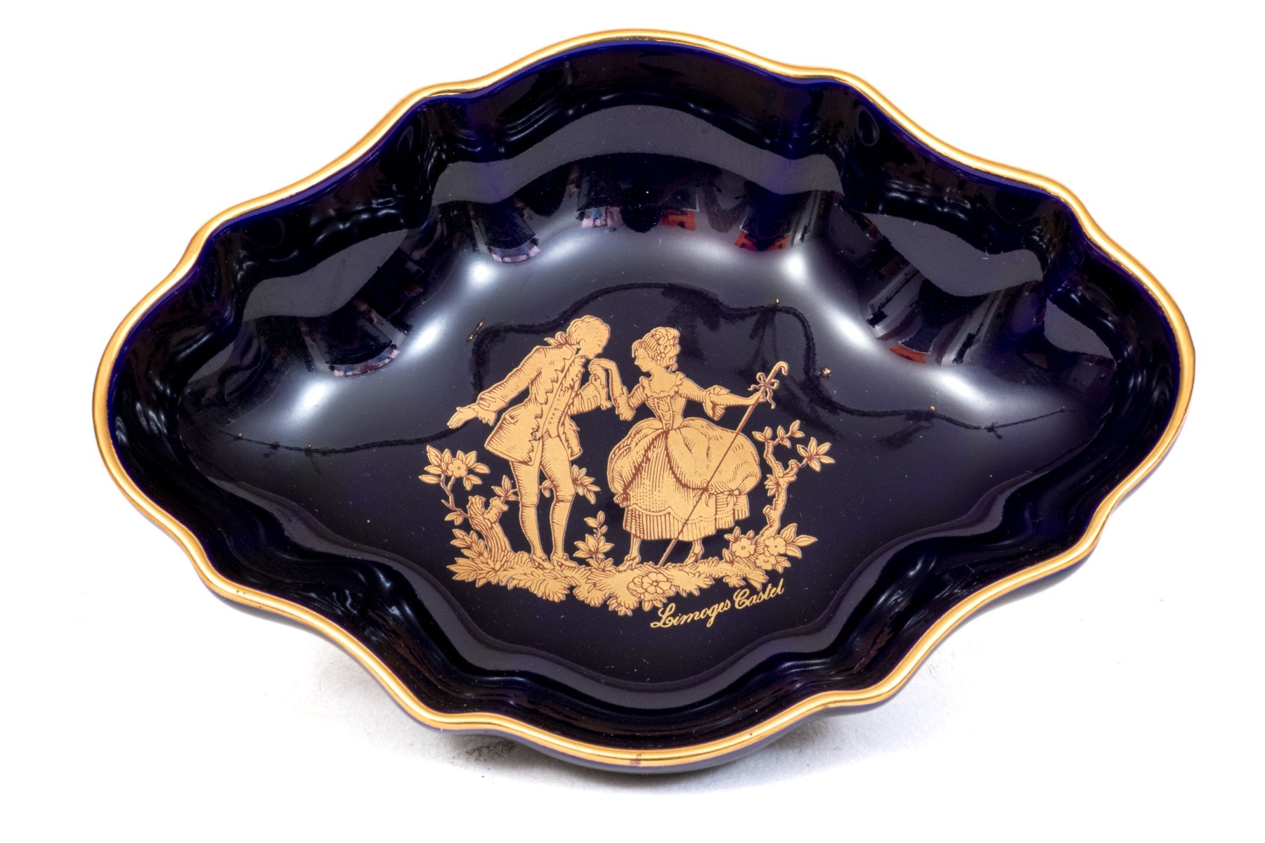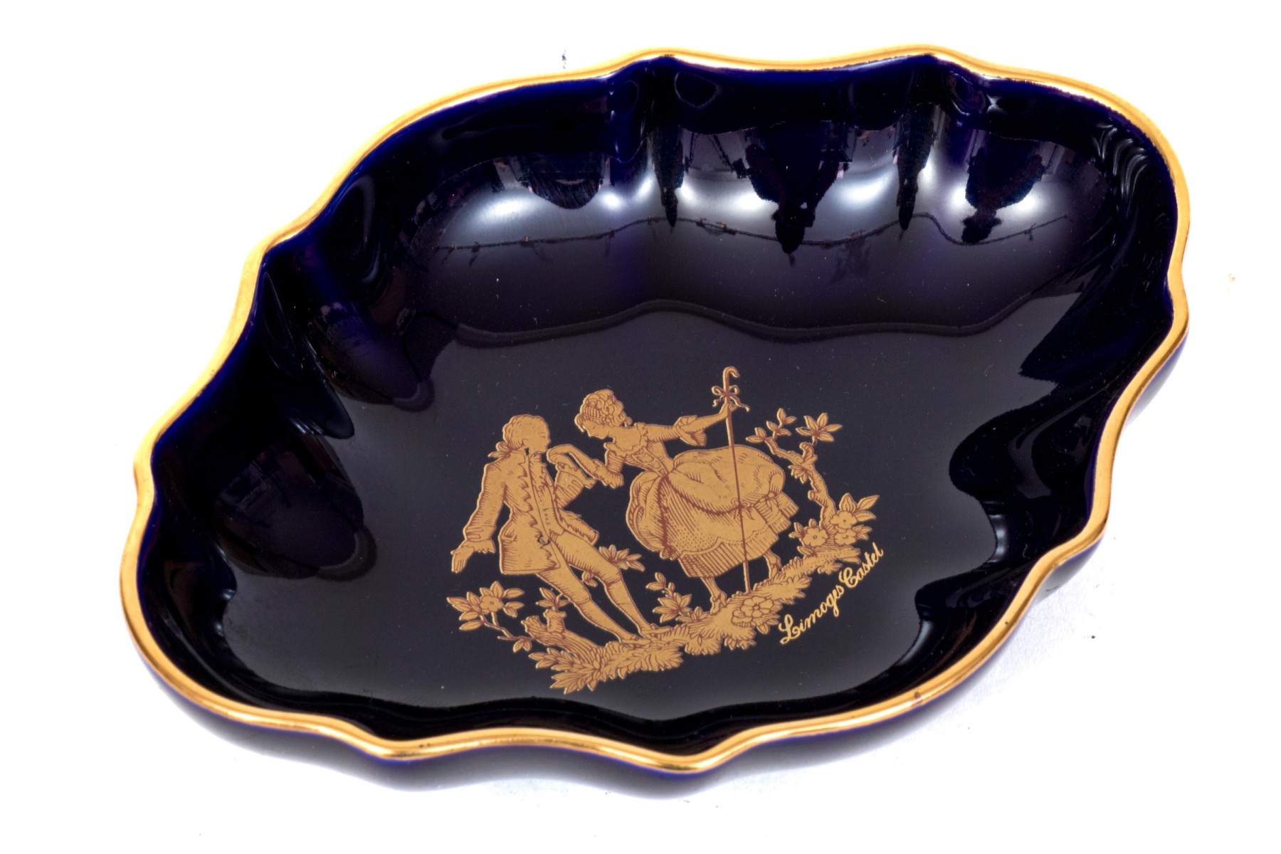 Limoges porcelain dish. The dish has a deep cobalt blue color. Displayed at the center of the dish is a 22K gold gilt painting of a courting couple. Gold gilt trims the edges.