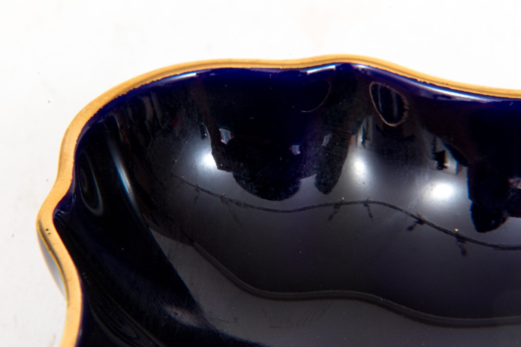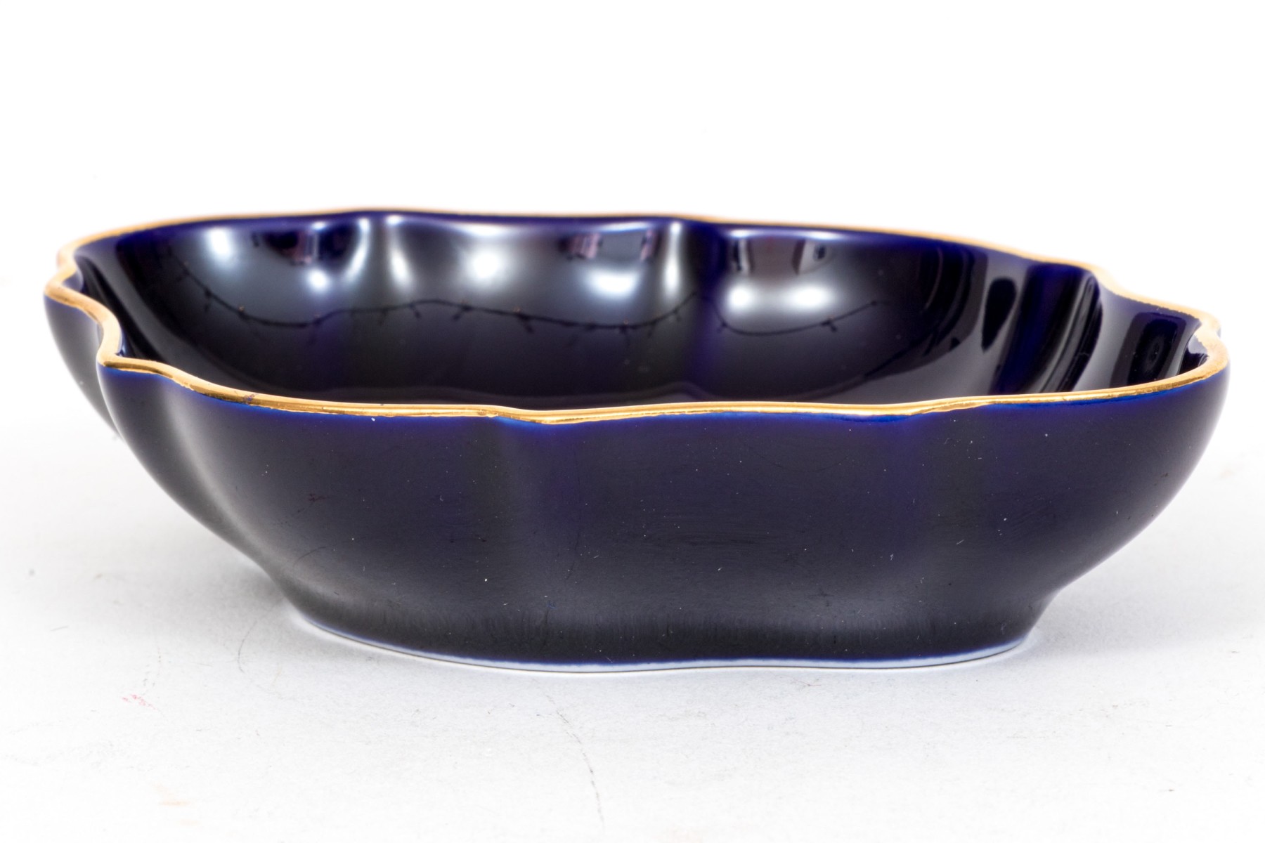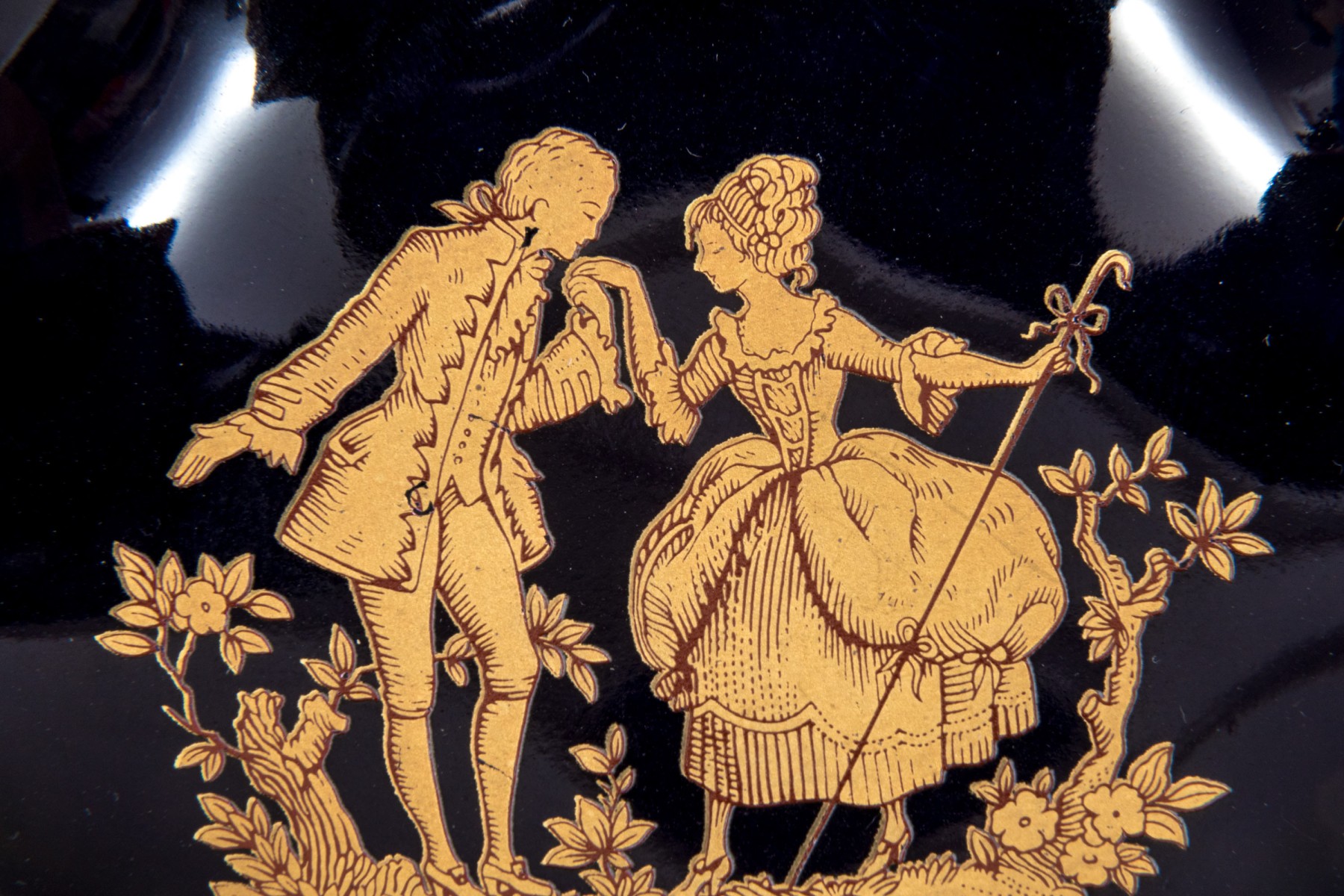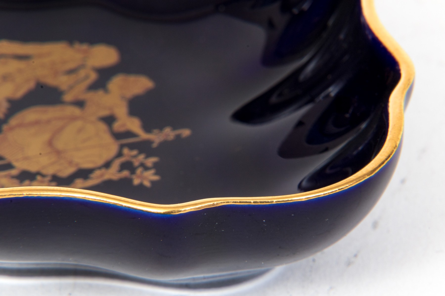 Limoges porcelain dish. The dish has a deep cobalt blue color. Displayed at the center of the dish is a 22K gold gilt painting of a courting couple. Gold gilt trims the edges.
