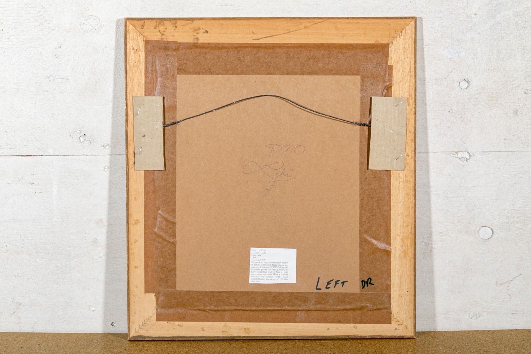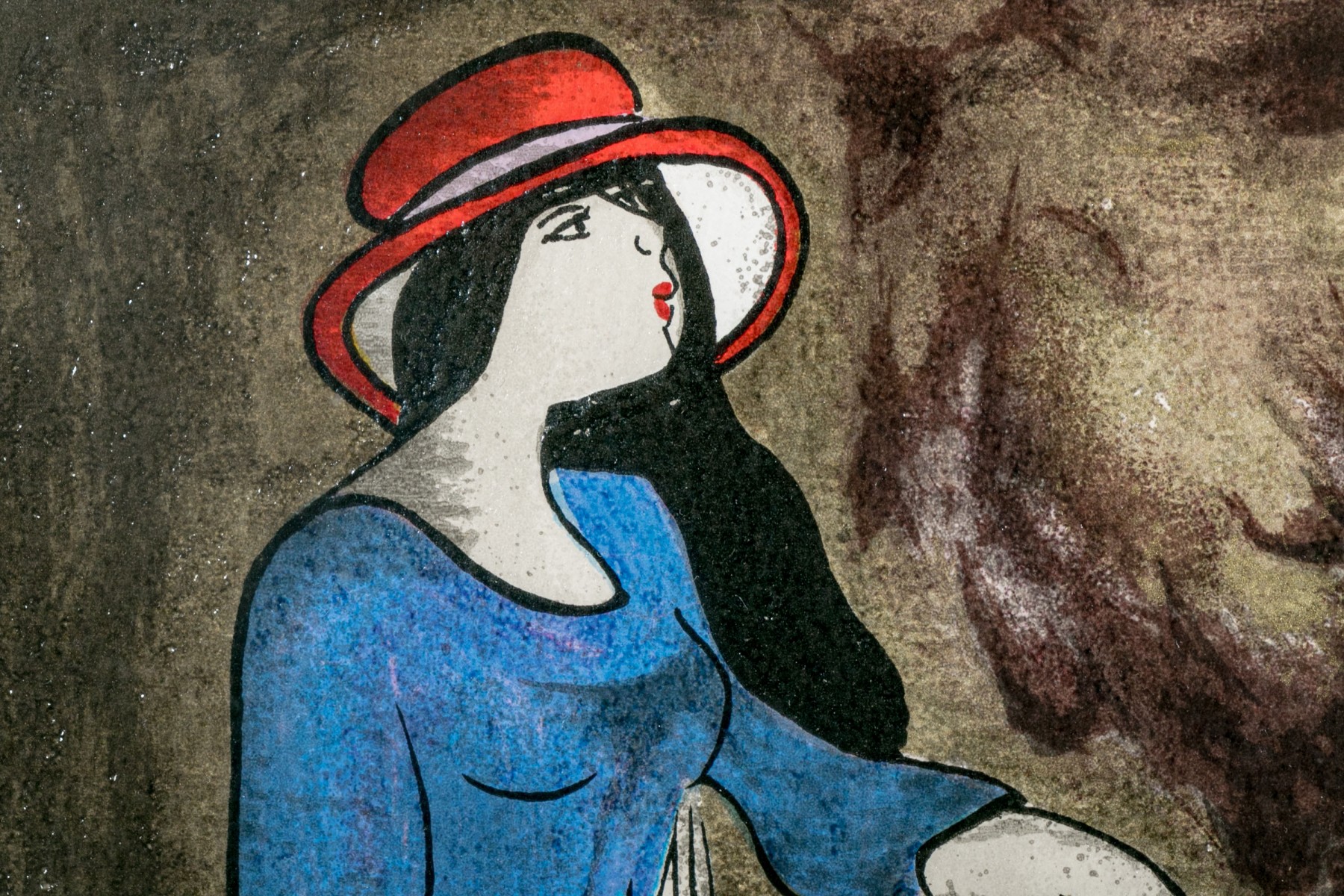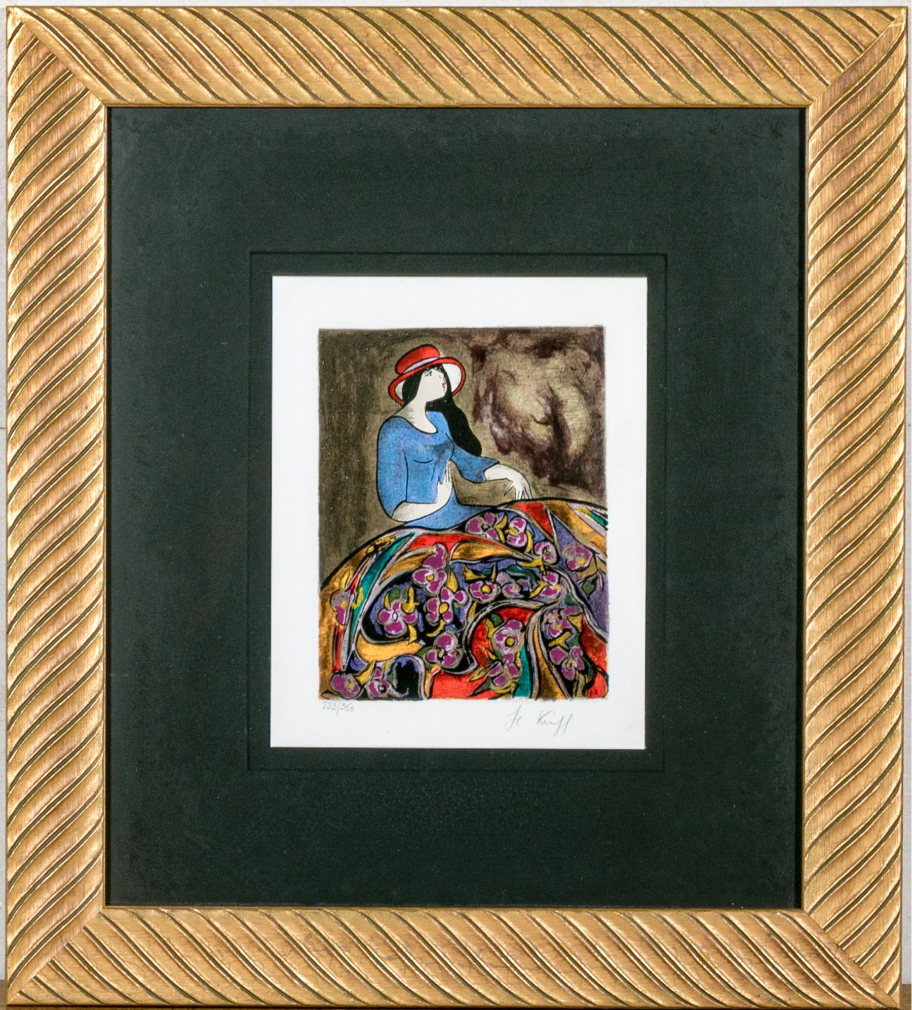 Pencil signed lower right and on verso, numbered 233/350 lower left, label on verso. A beauty wearing a flowery full skirt looks at a shadowy scene at her right. Presented in a gilt frame with glass.
