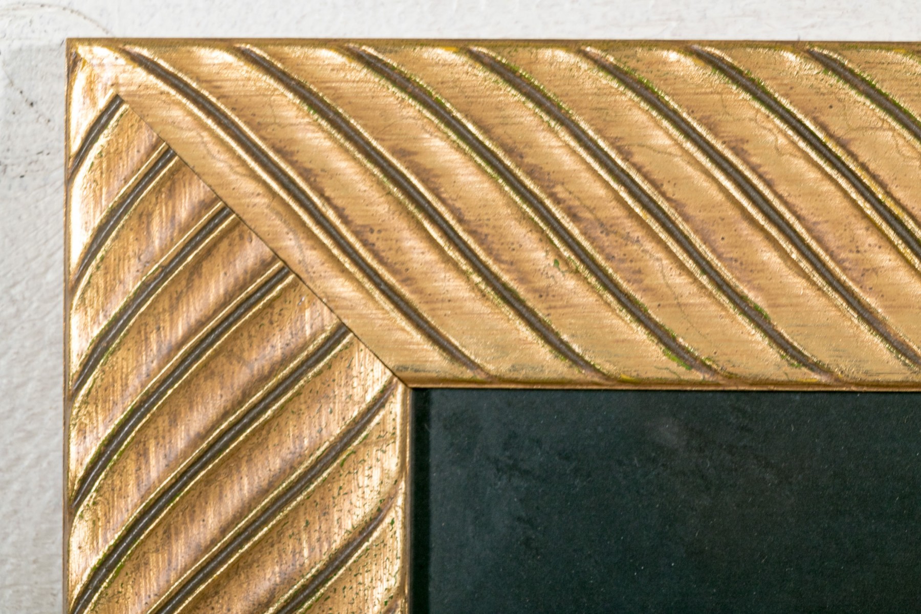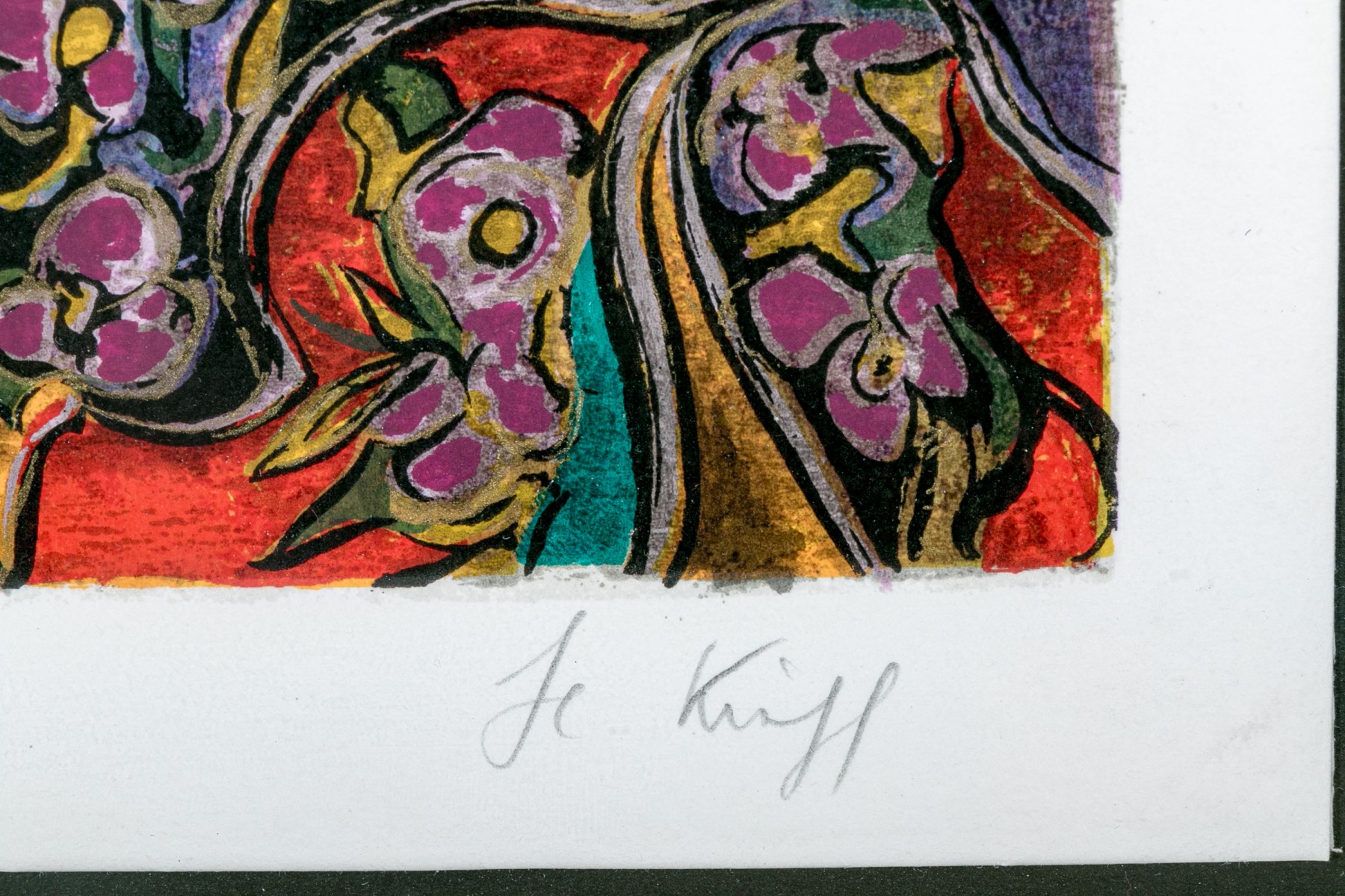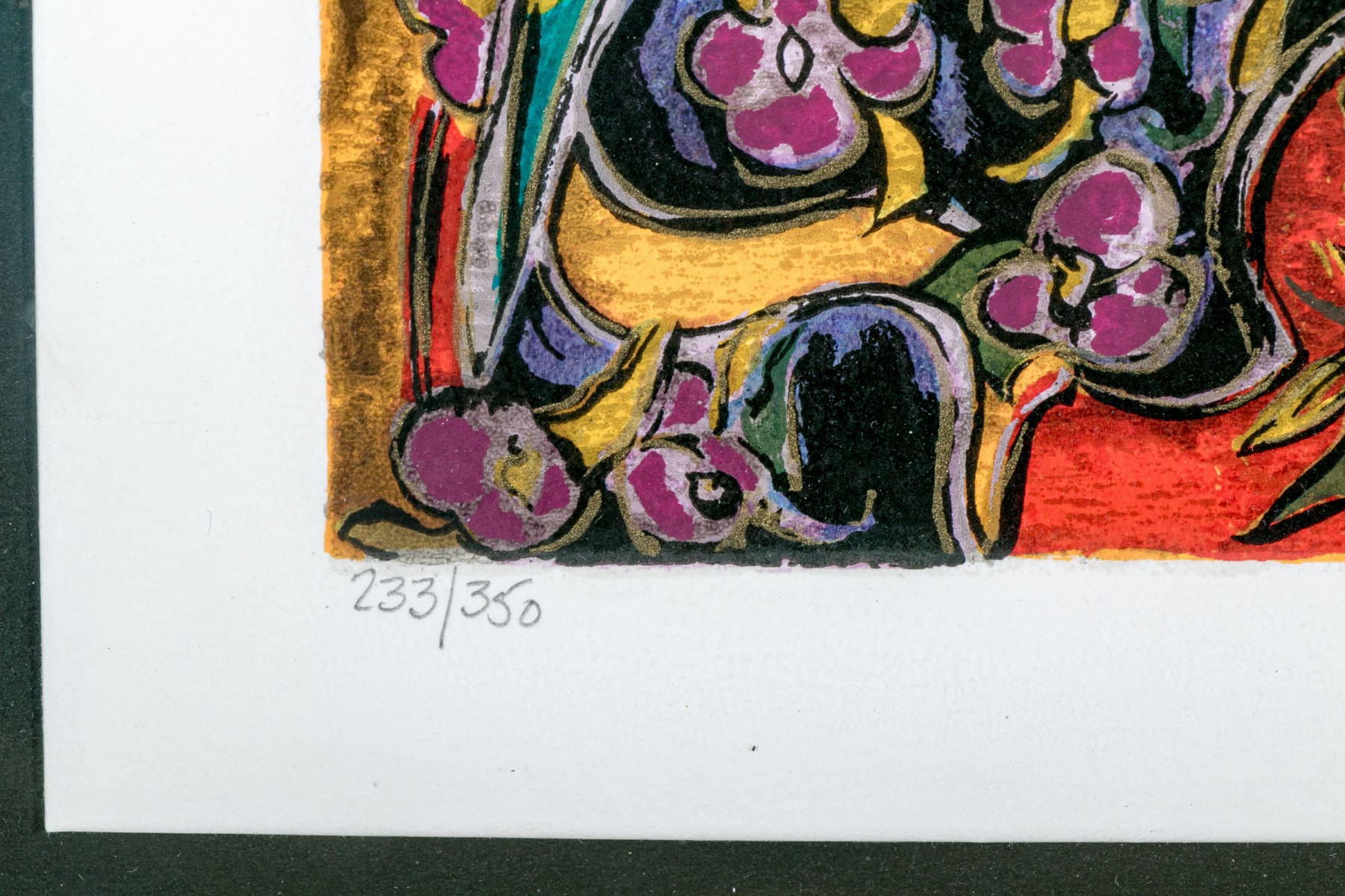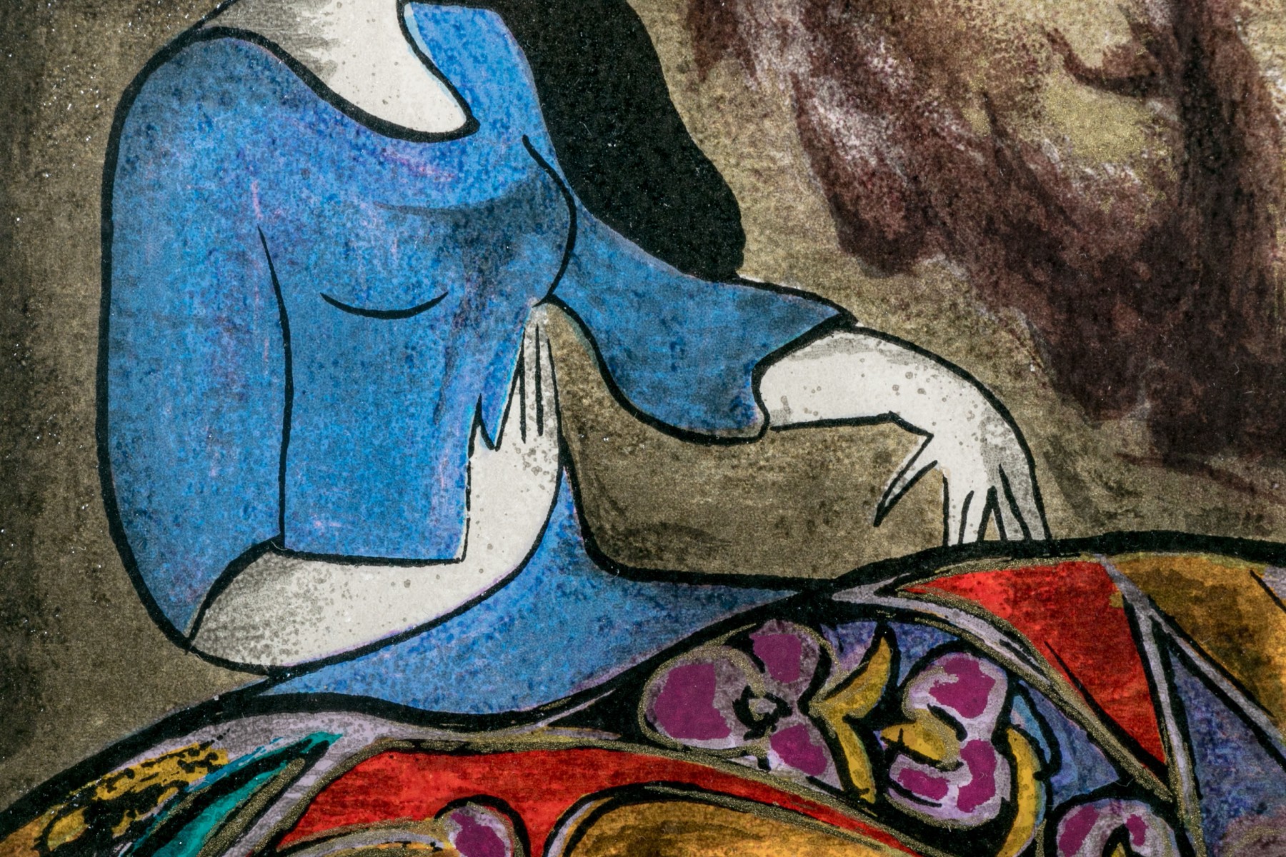Pencil signed lower right and on verso, numbered 233/350 lower left, label on verso. A beauty wearing a flowery full skirt looks at a shadowy scene at her right. Presented in a gilt frame with glass.