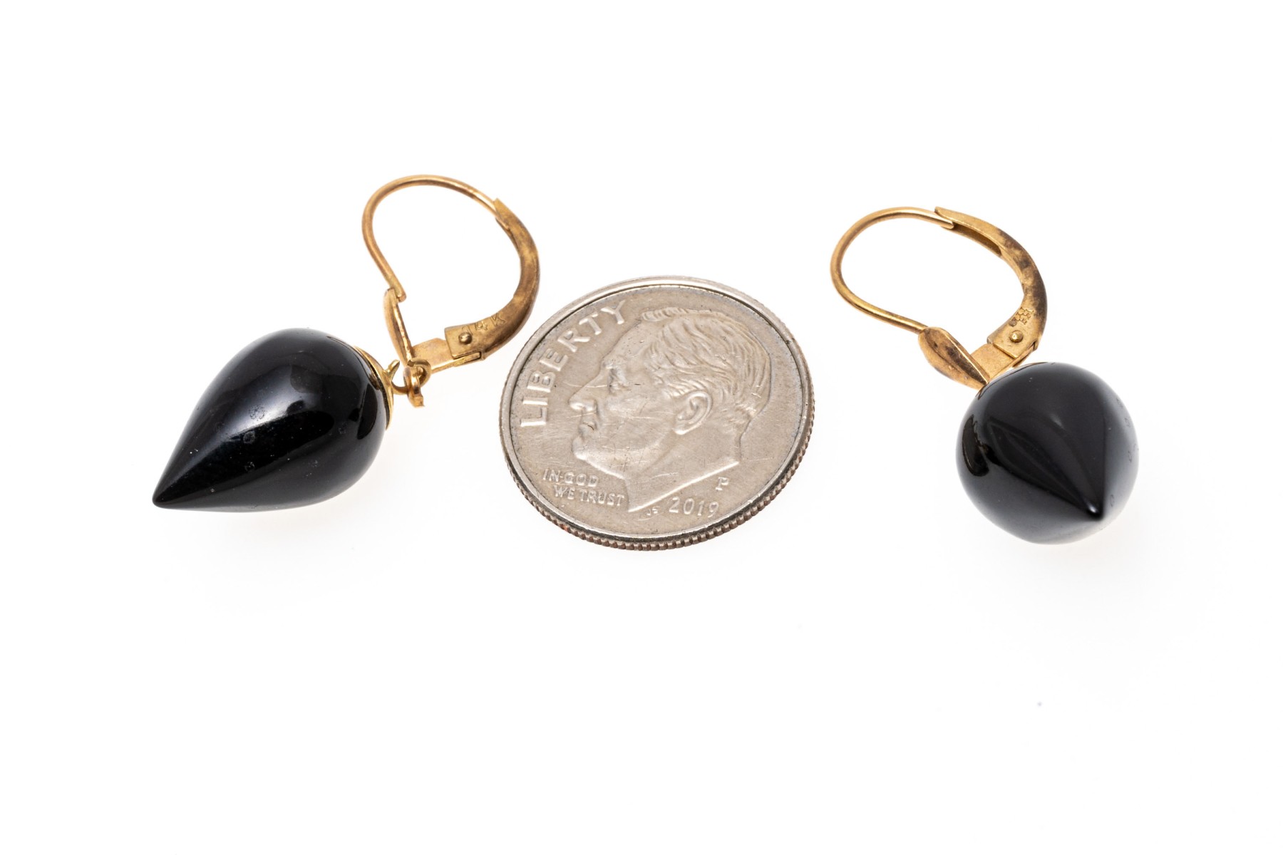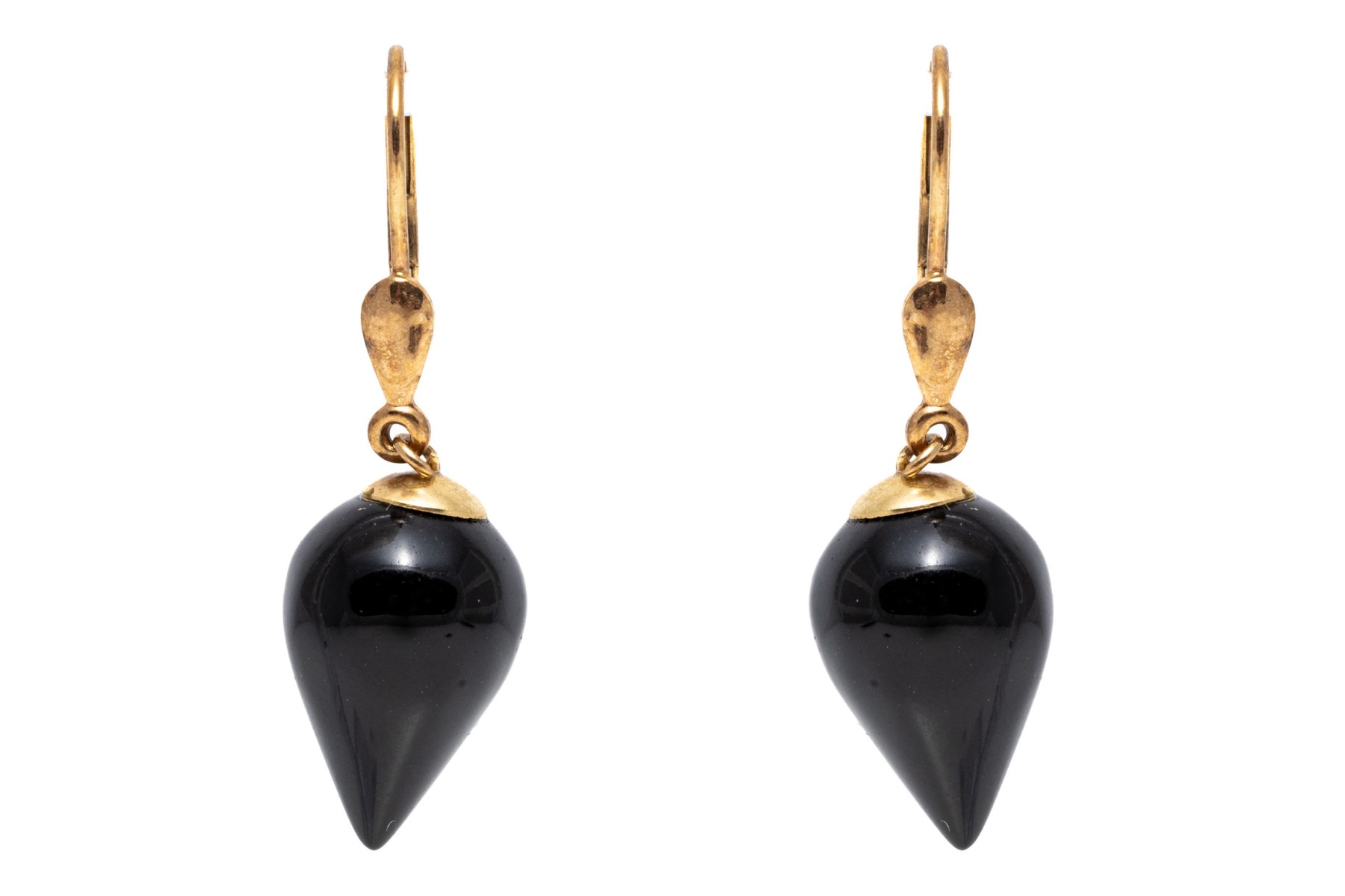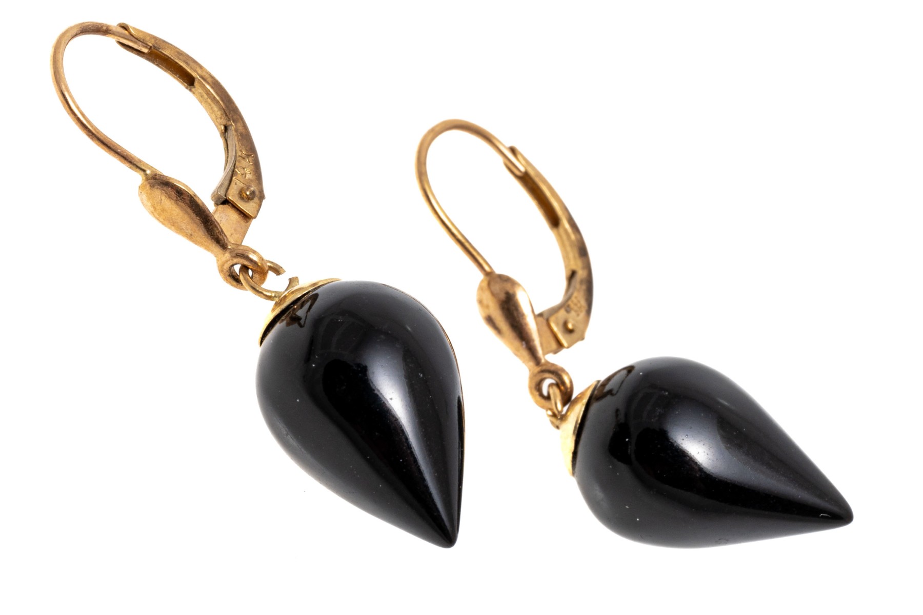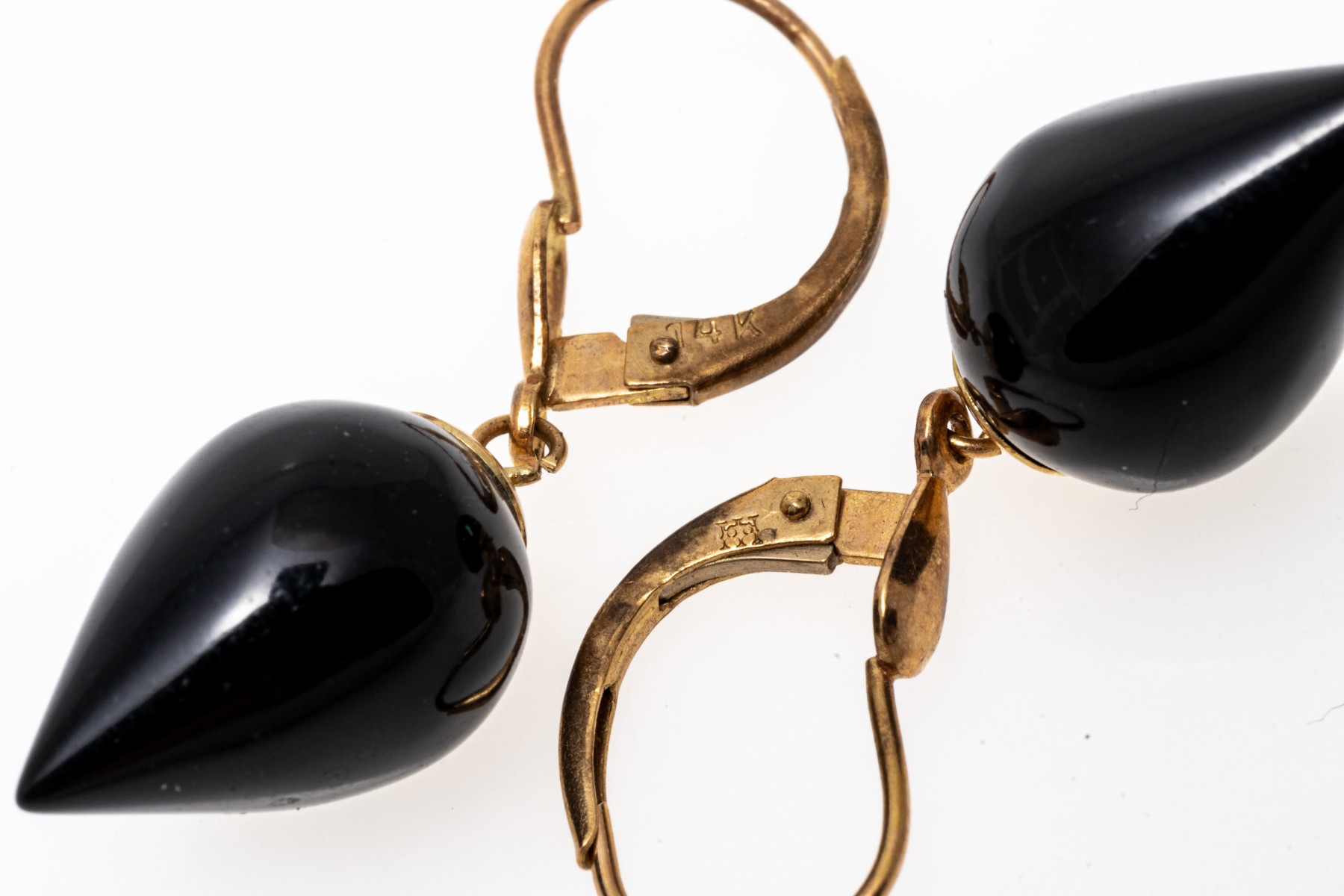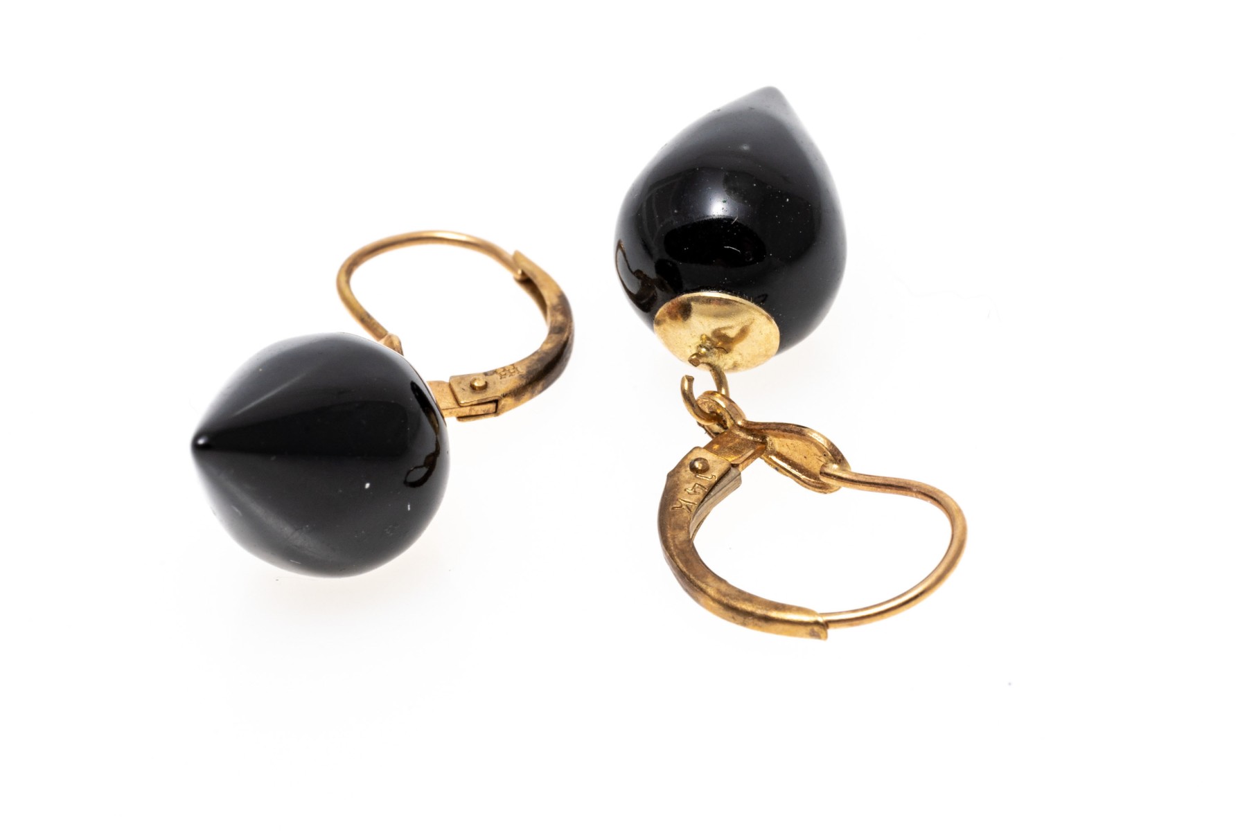 Lively 14K yellow gold pendant earrings. Suspended from the earring are inverted teardrop black onyx stones, 9.8mm.