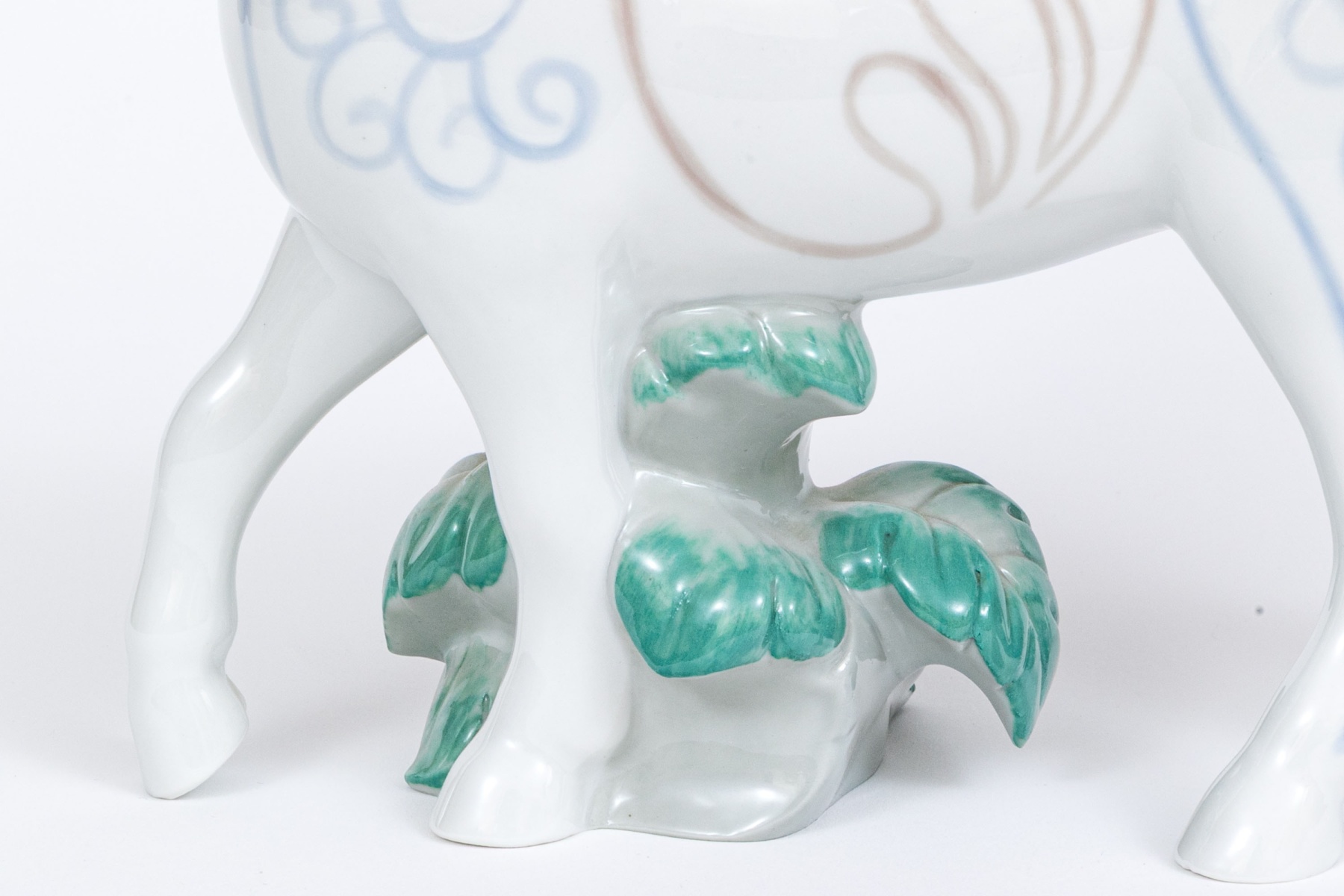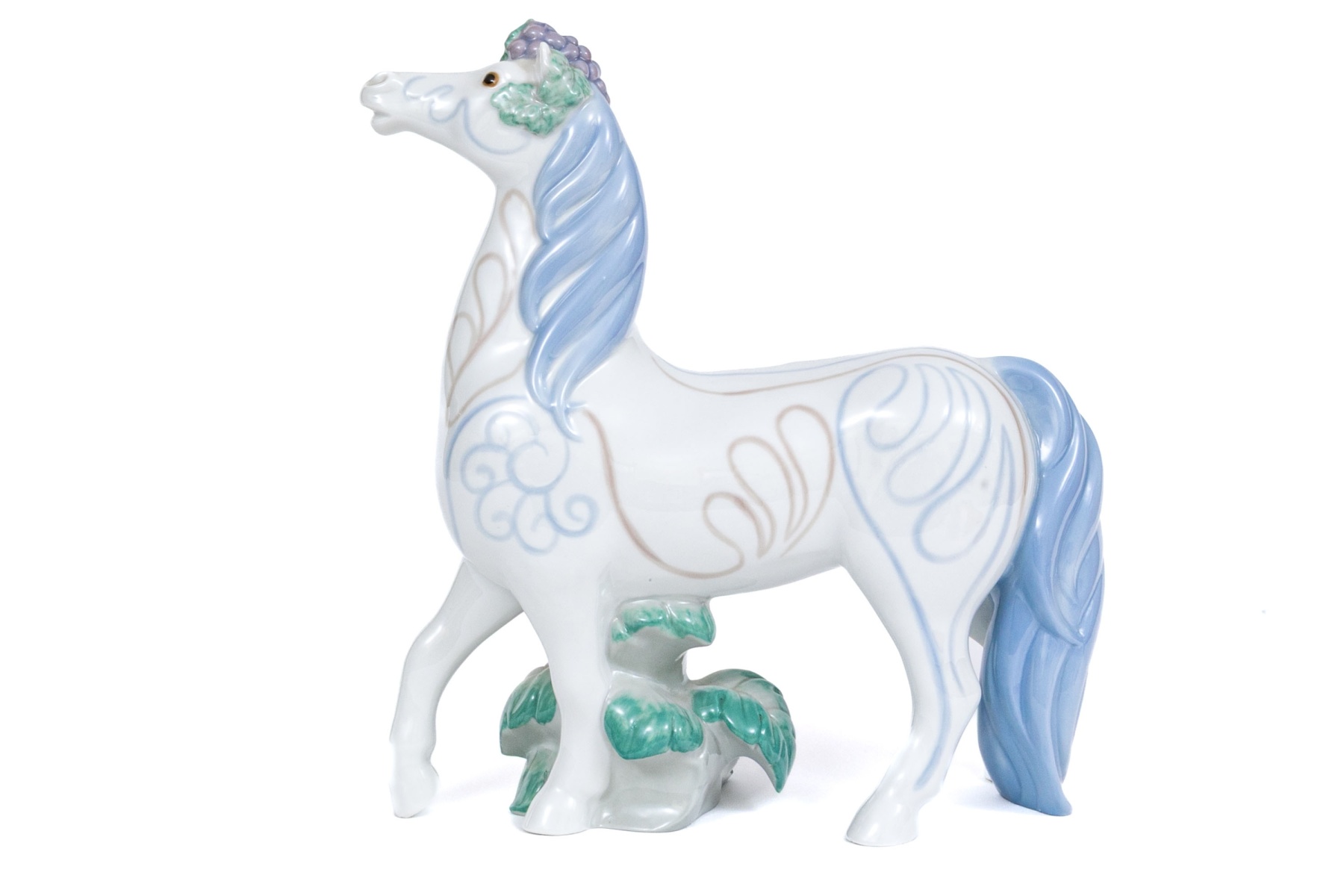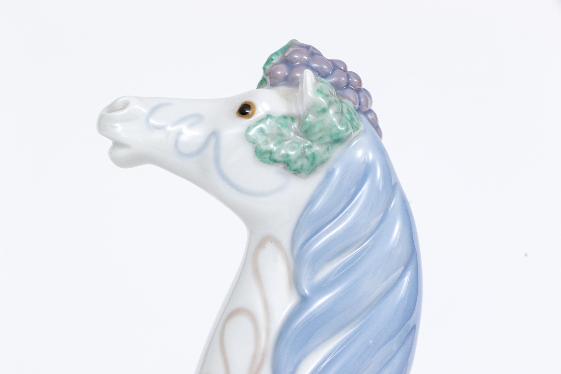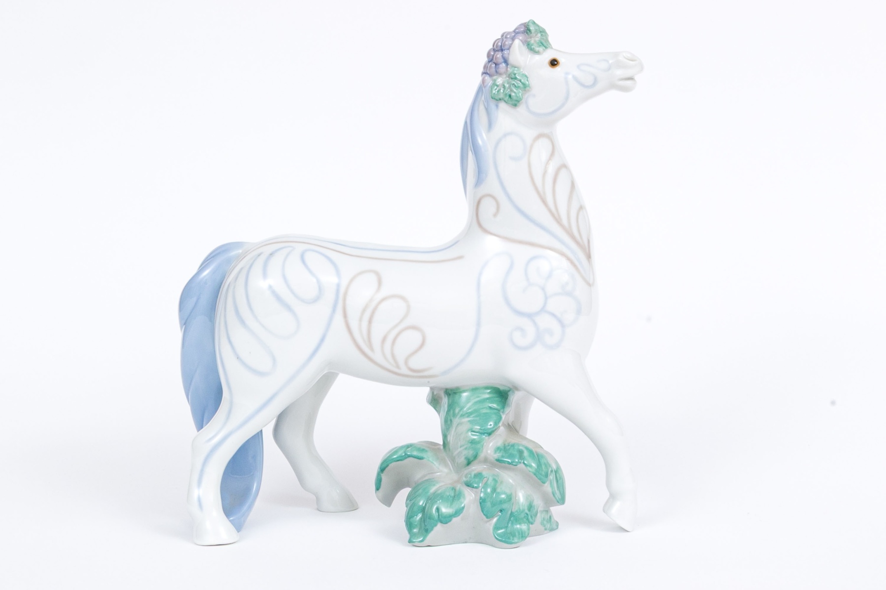 Whimsical and lavishly decorative the horse with blue mane and tail and grape cluster atop its head. The horse with white ground having decorative patterns to the body with foliate underfoot.