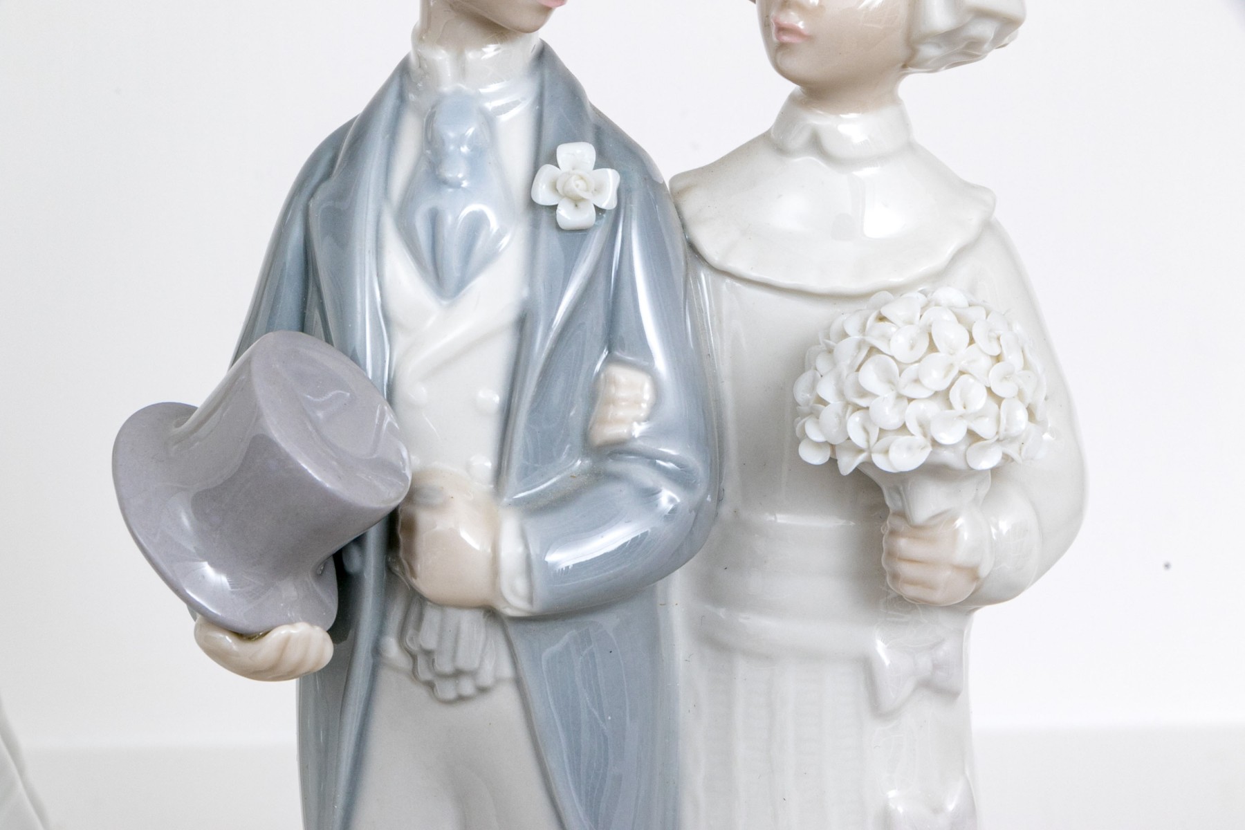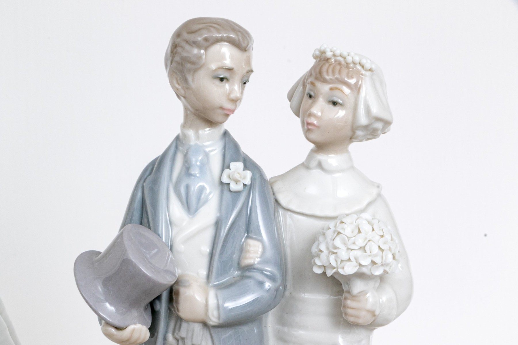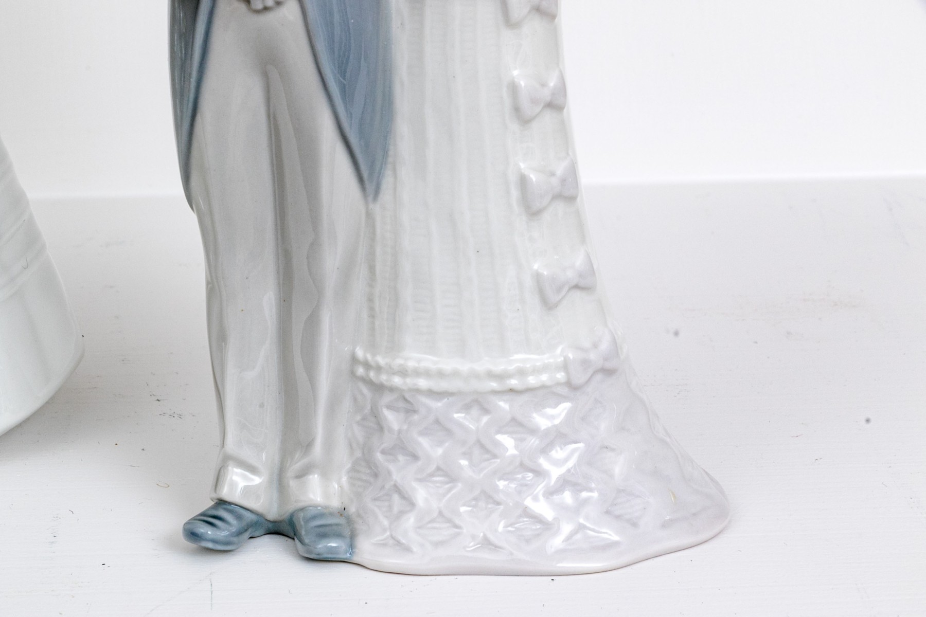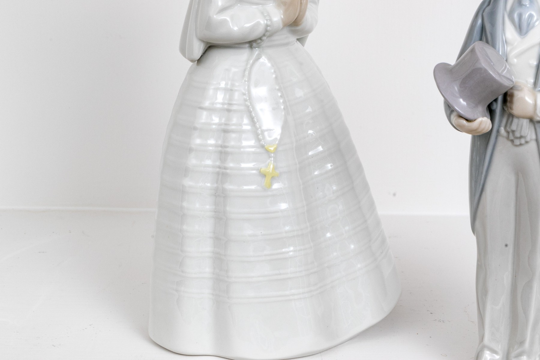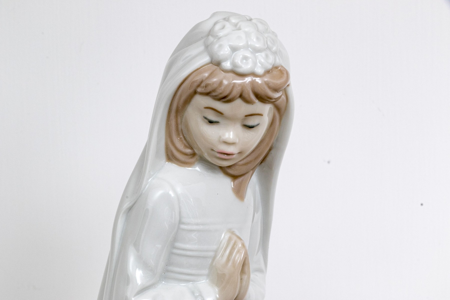 A lovely duo of Lladro and Nao porcelain figures including "Girl Praying" depicting a girl's first communion attire and "Bride & Groom" depicting a couple in white and light blue. Marked underfoot.