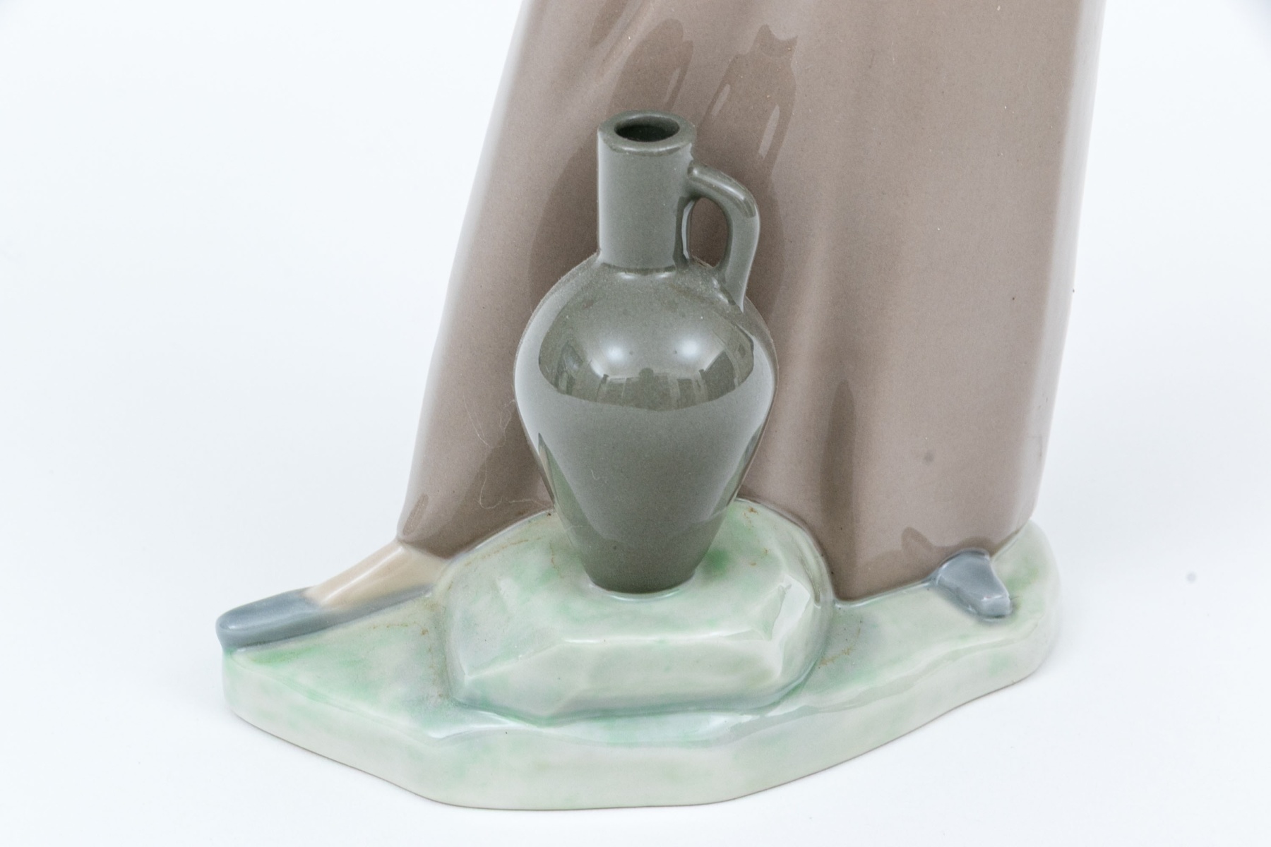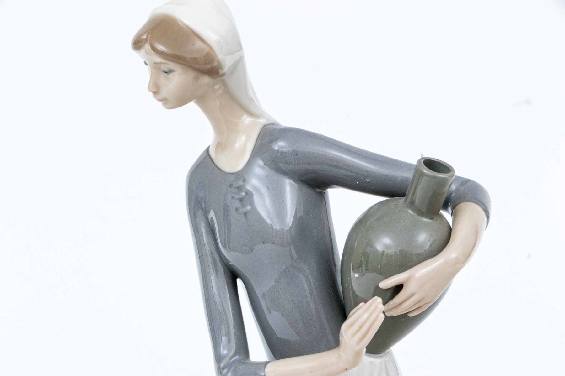 A women in maids attire with headdress holding a vase, with pitcher at her feet. Marked underfoot.