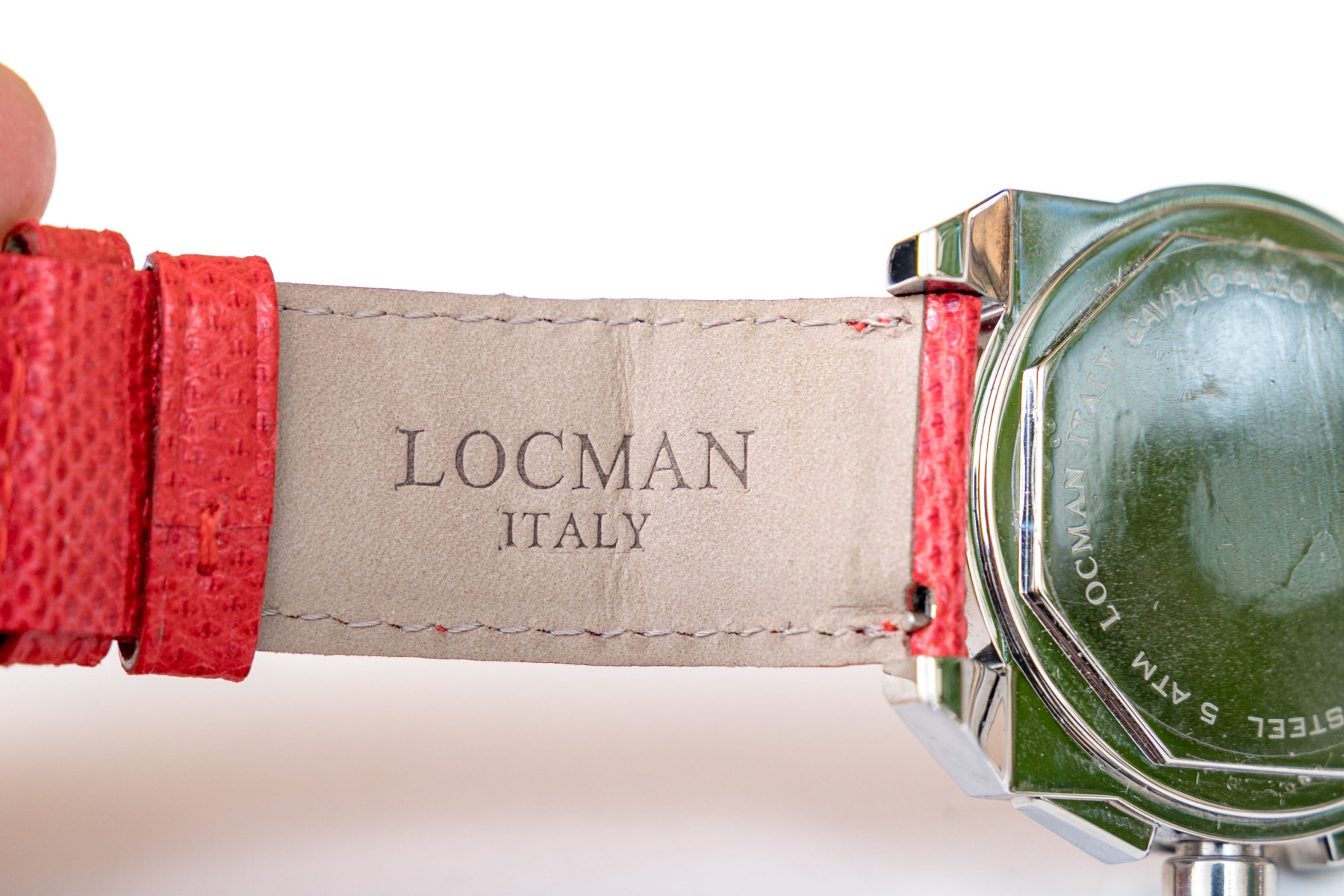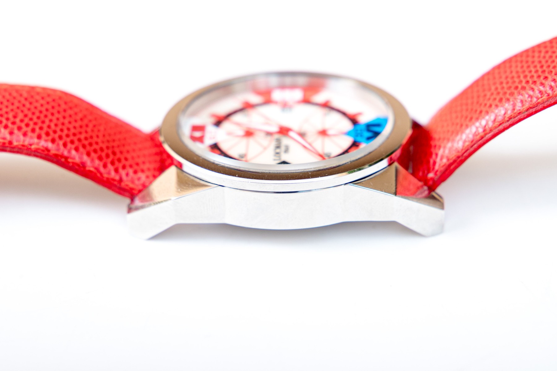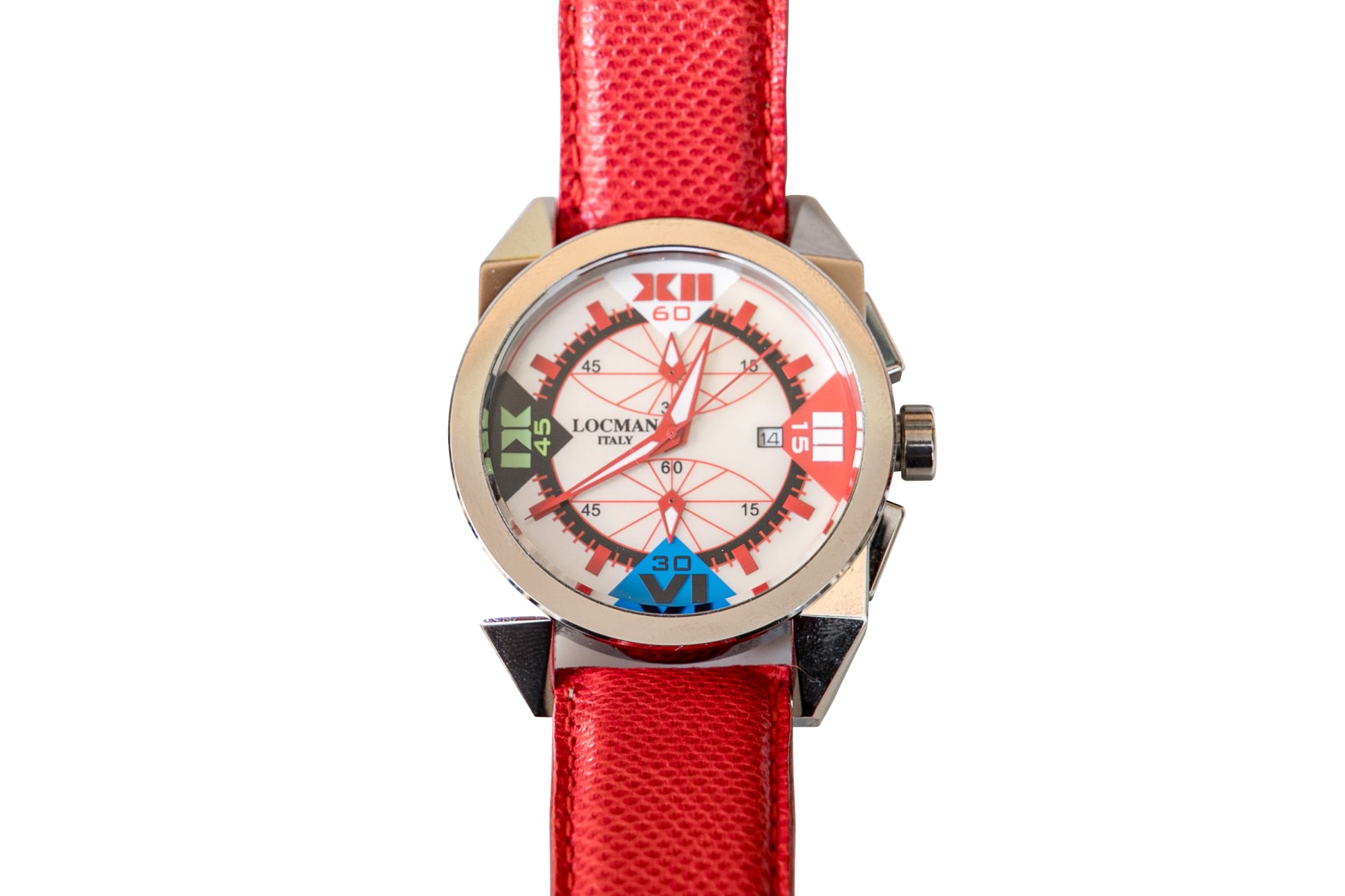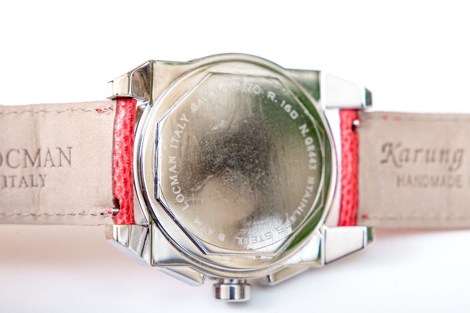 Locman Cavallo Pazo Crazy Horse wristwatch displaying a stainless steel bezel around a white dial with sporty, minimalist hour markers and demilune subdials with fine-lined red markers that complement a red karung snake Locman strap.
