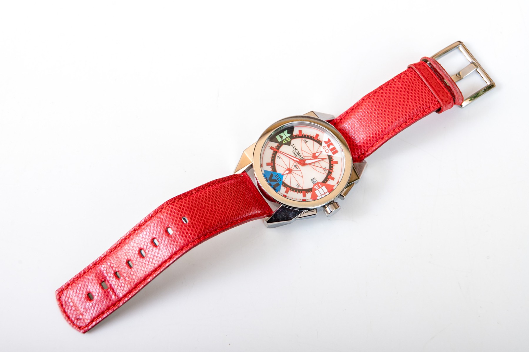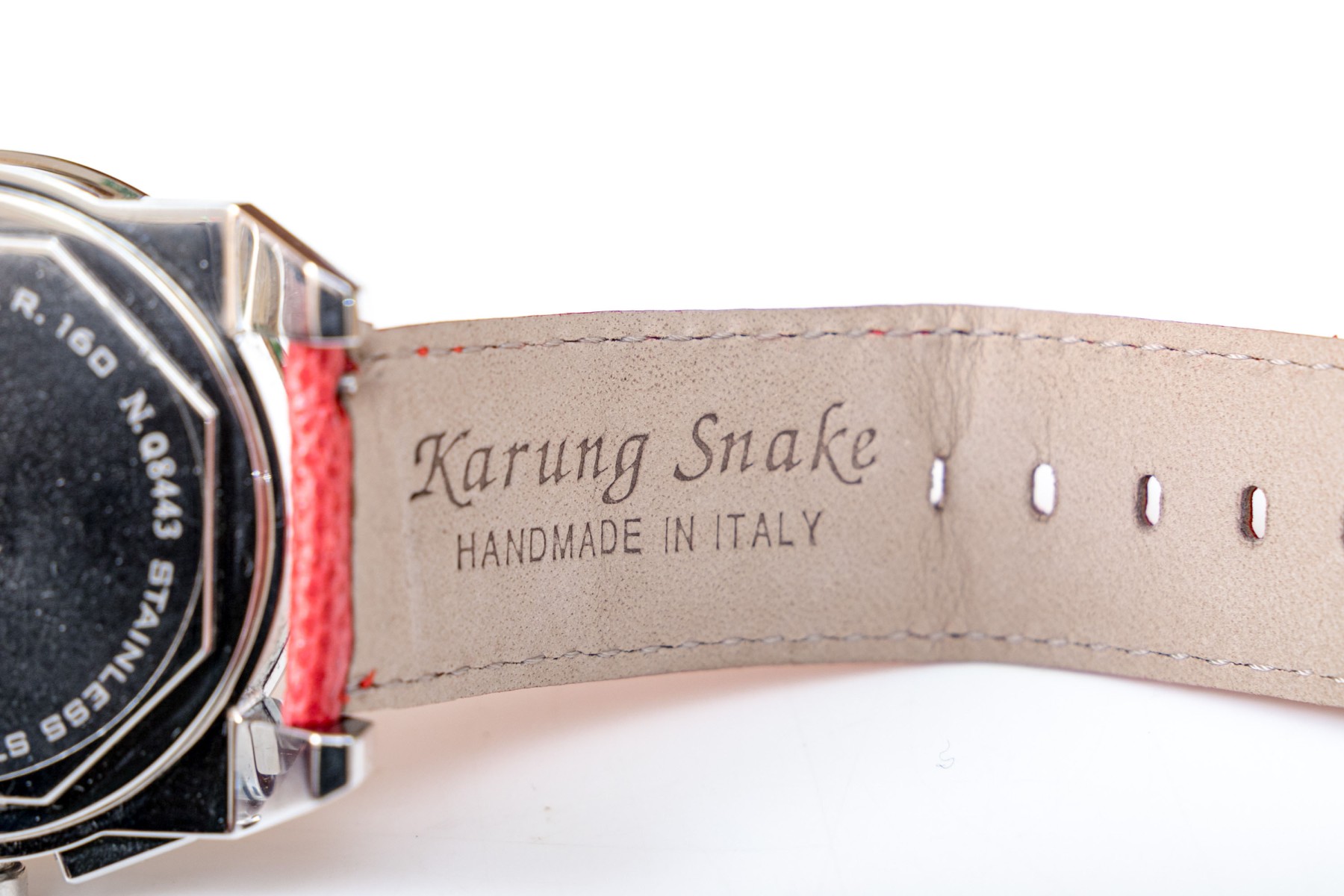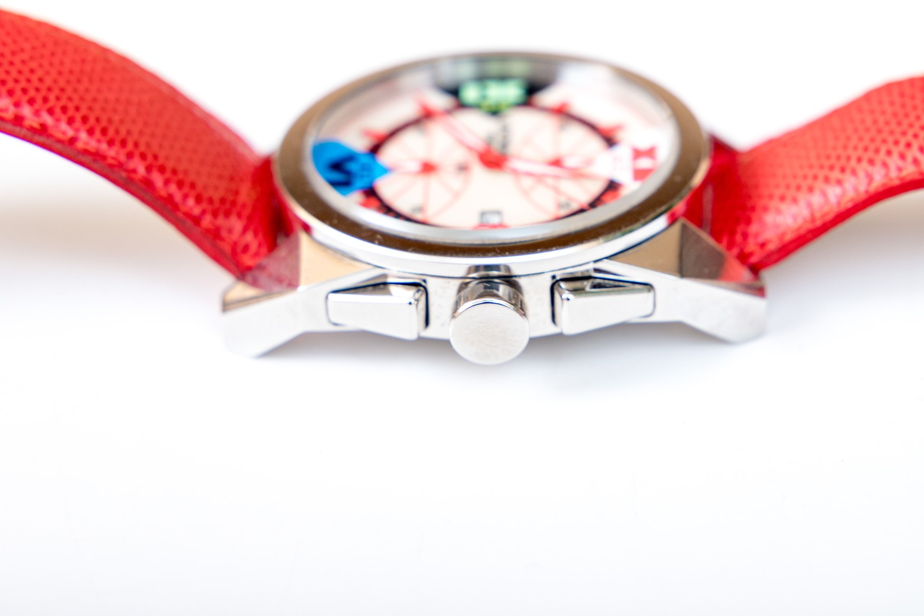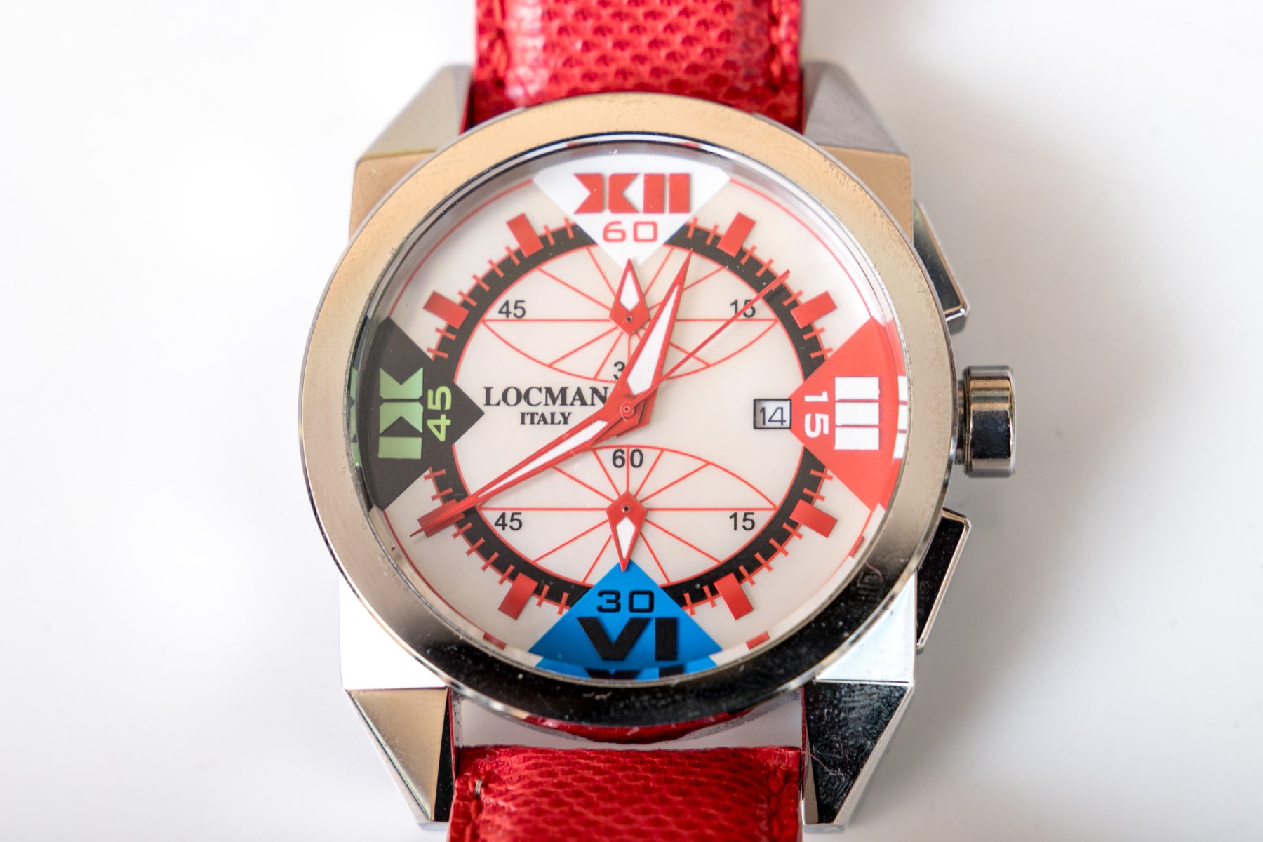 Locman Cavallo Pazo Crazy Horse wristwatch displaying a stainless steel bezel around a white dial with sporty, minimalist hour markers and demilune subdials with fine-lined red markers that complement a red karung snake Locman strap.