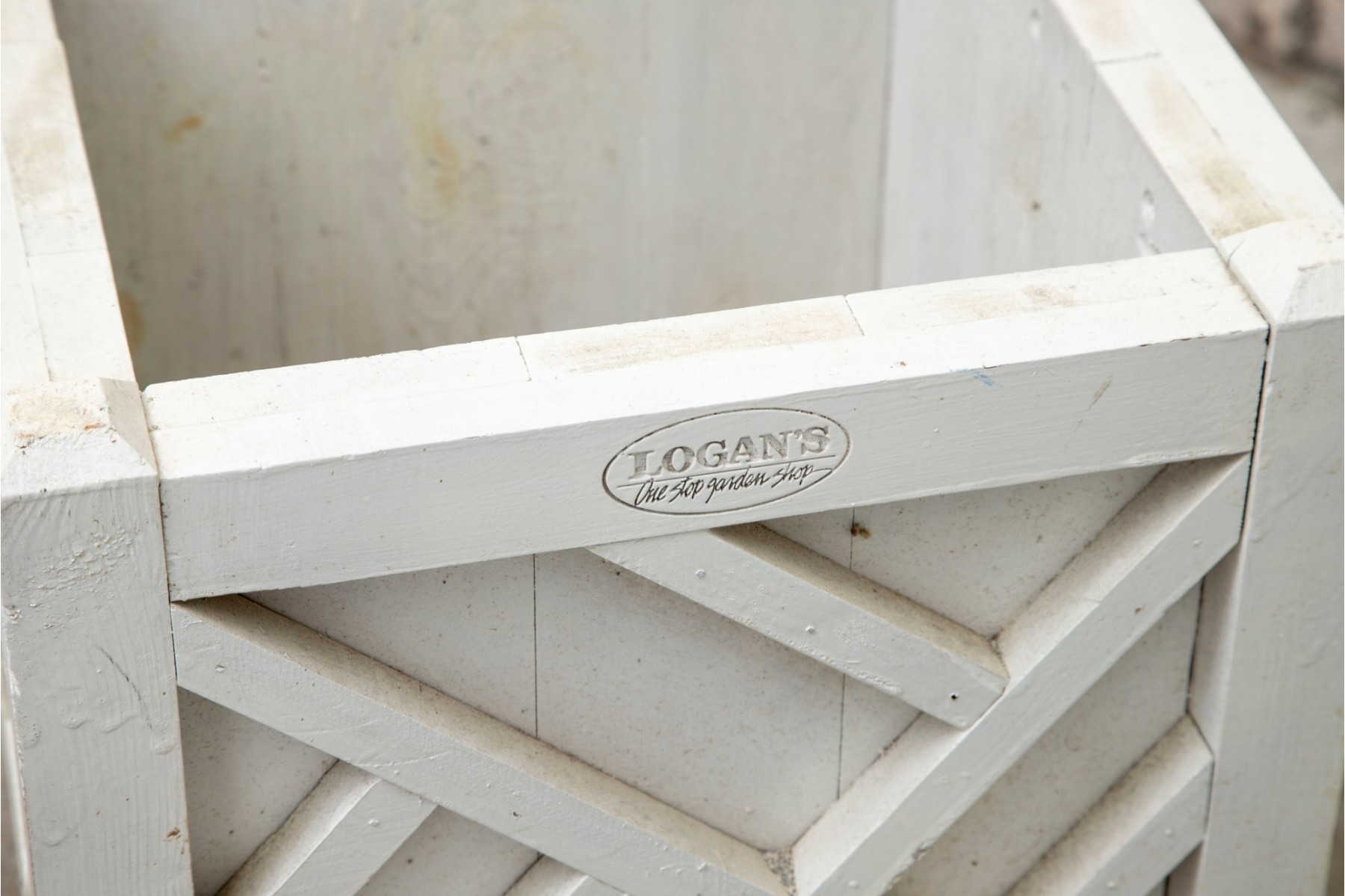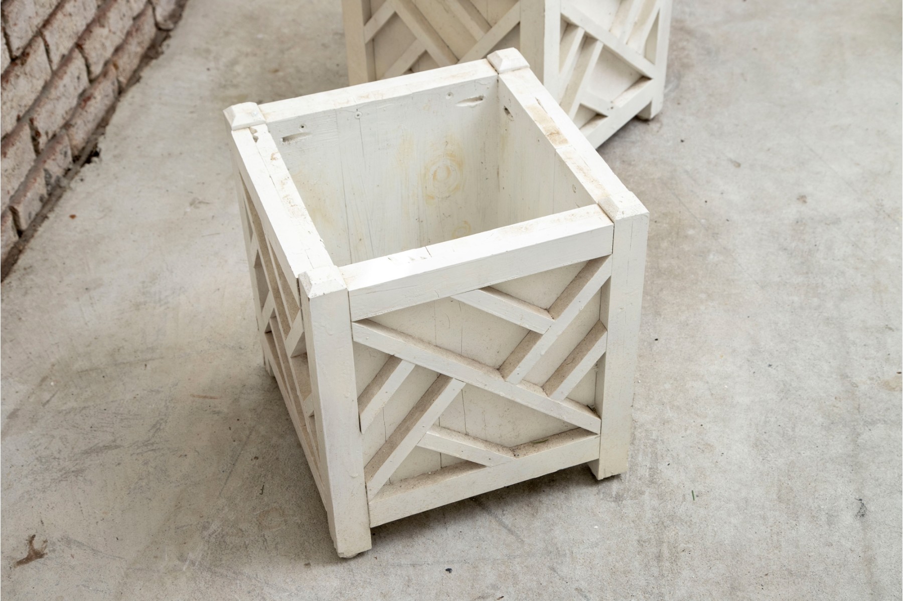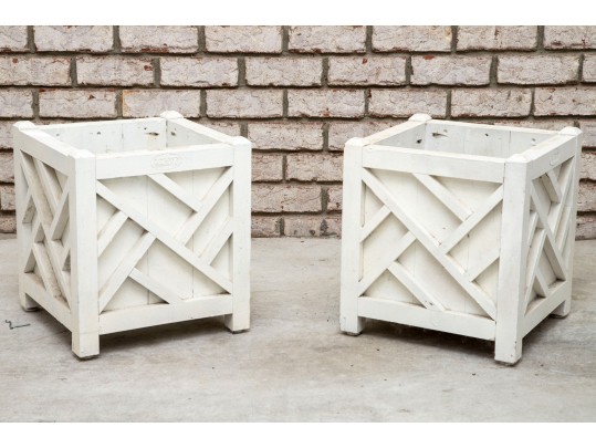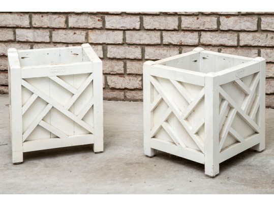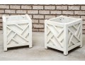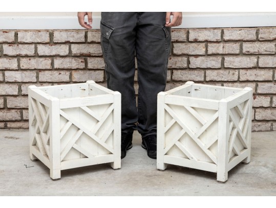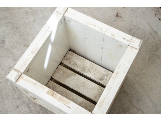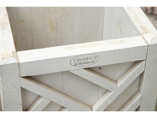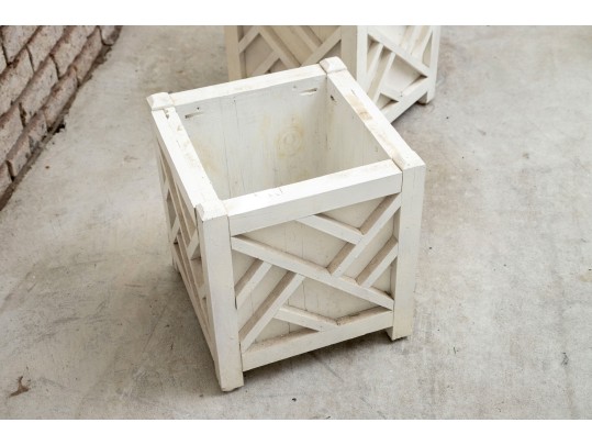 Two hand-crafted 14x14" wood planters in white, produced by Logan's One Stop Garden Shop of Raleigh, North Carolina
