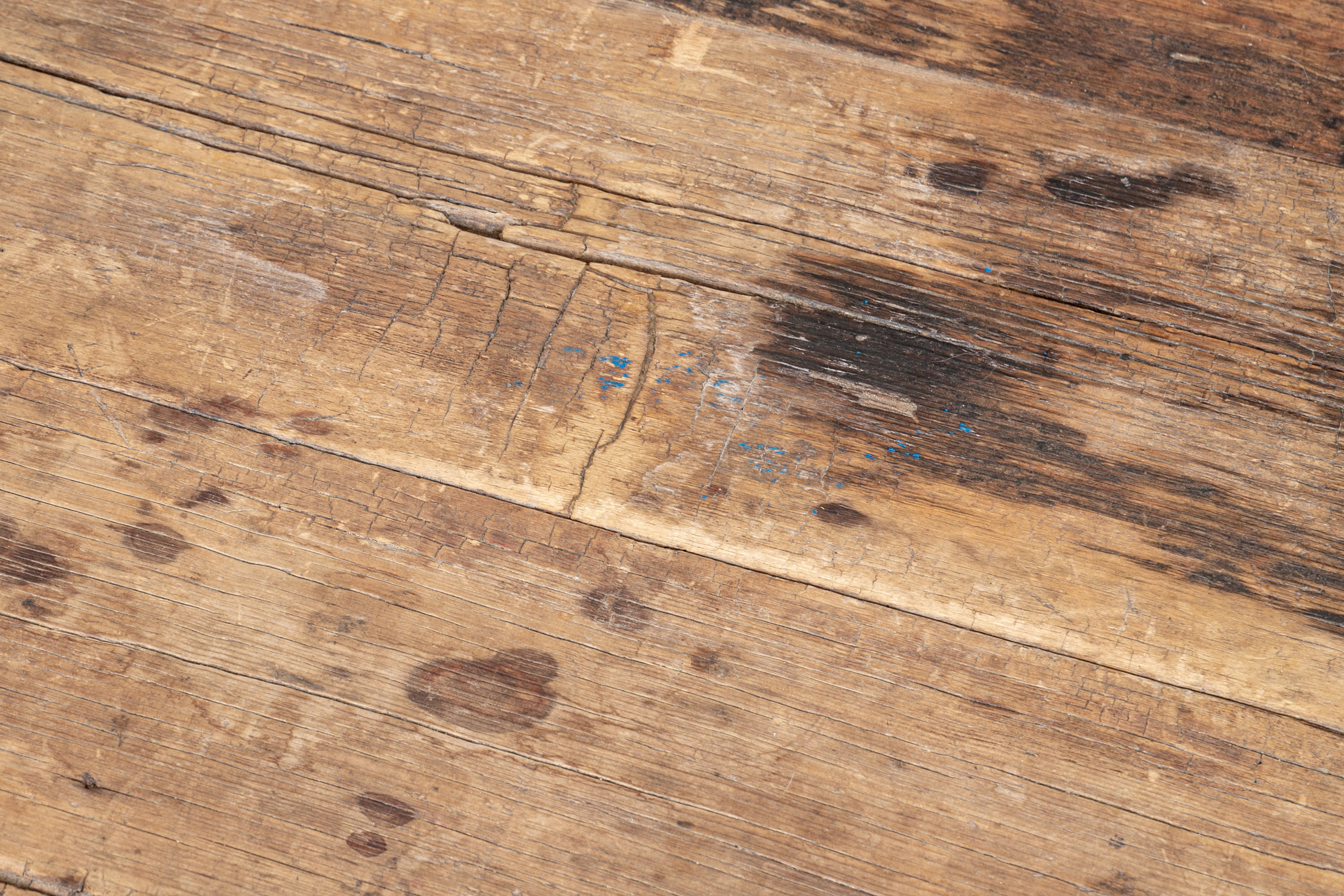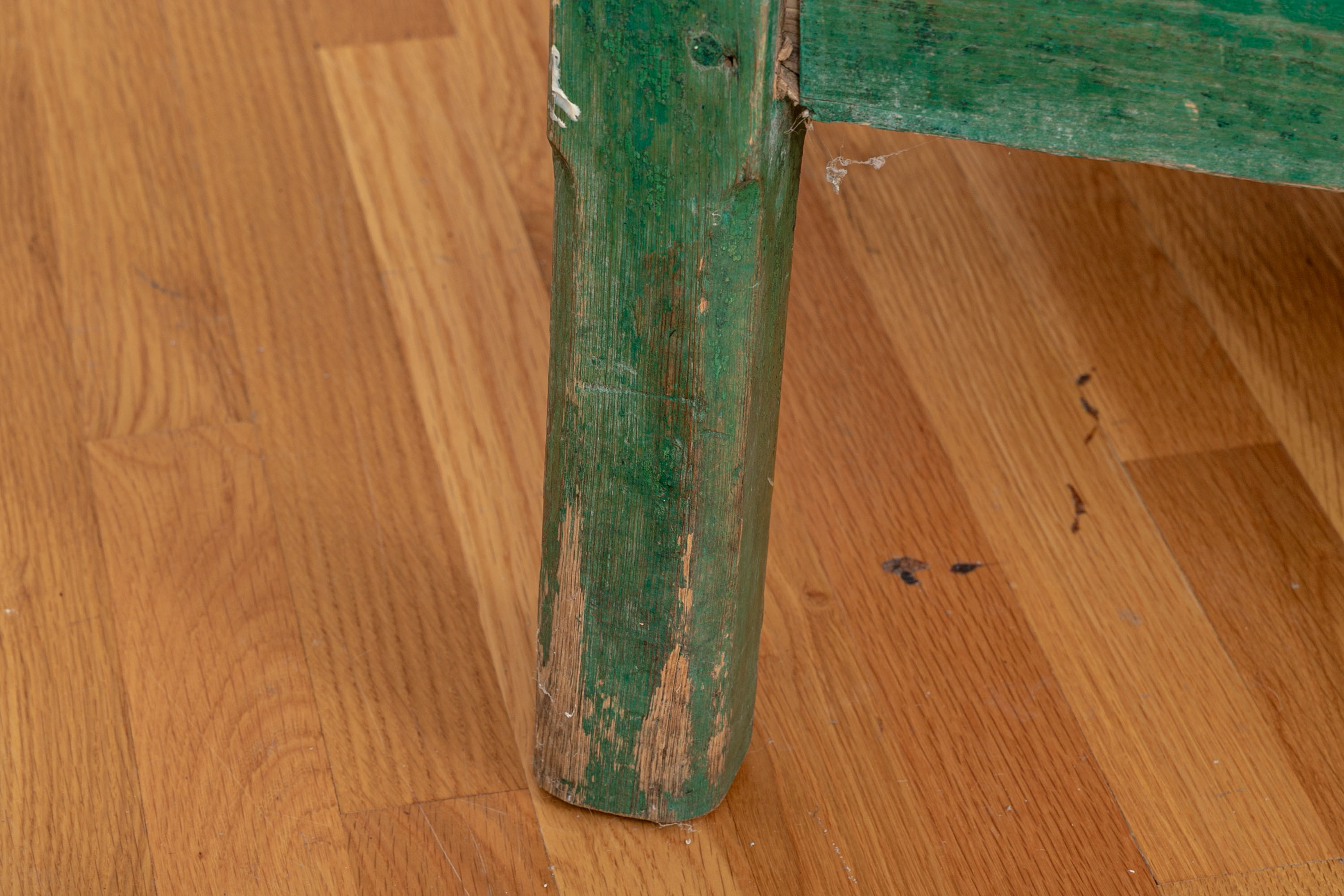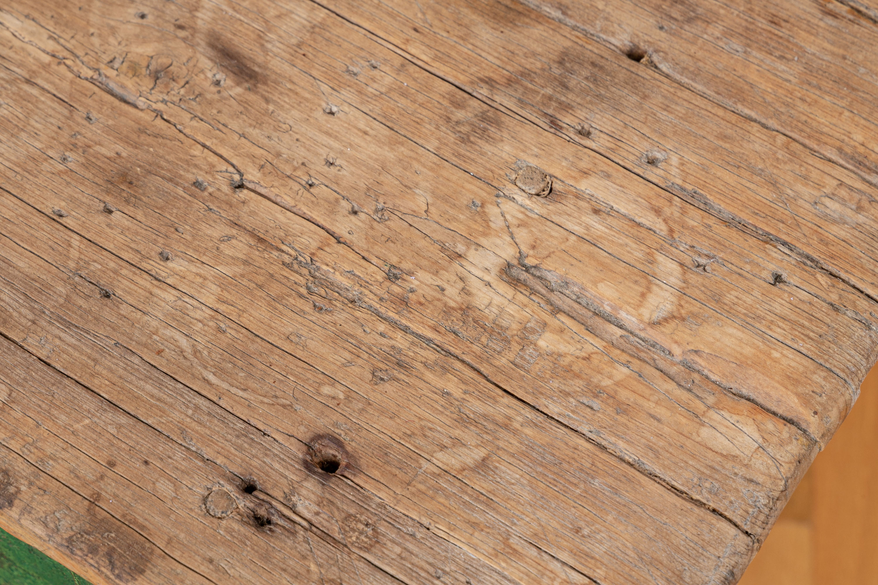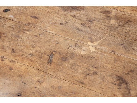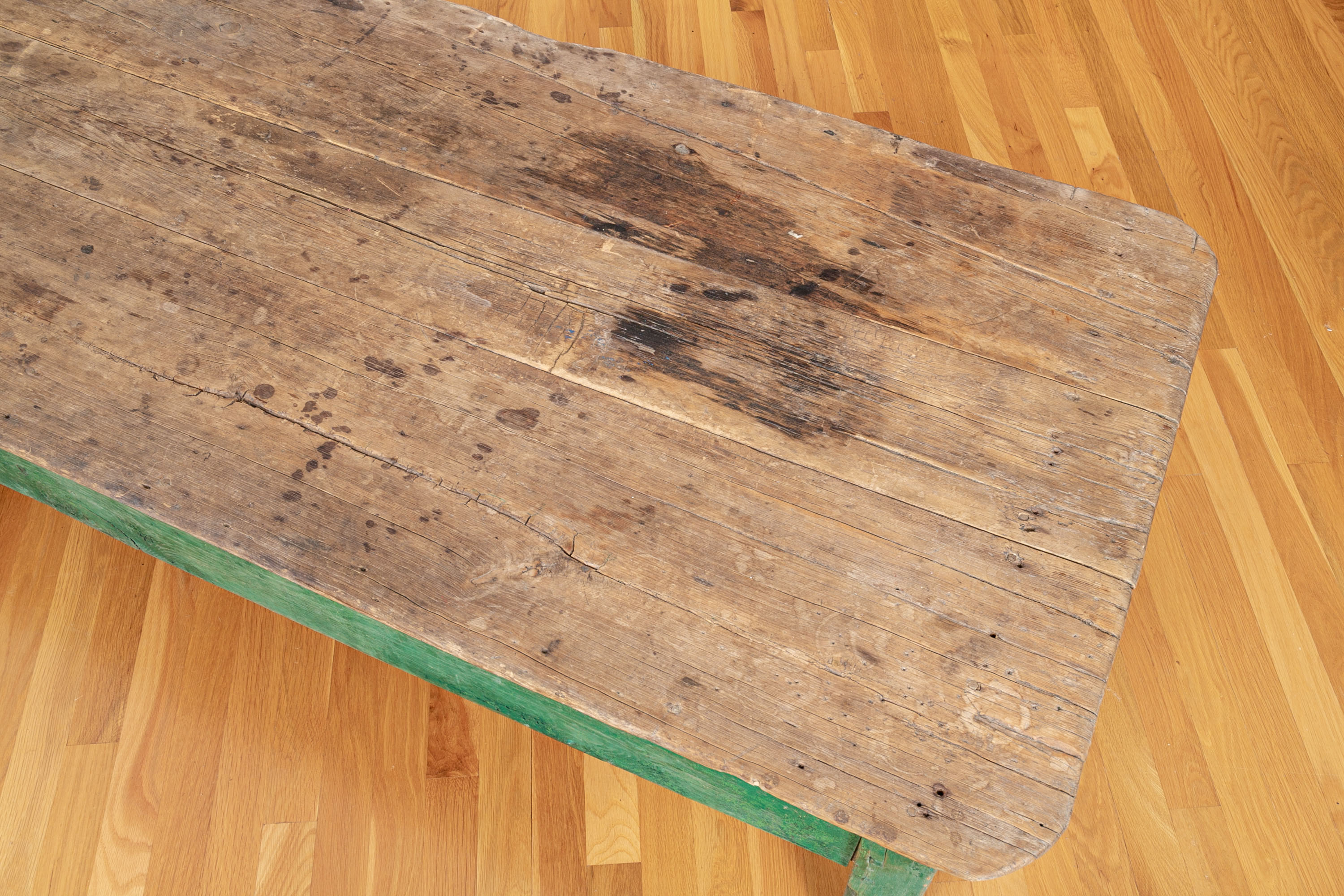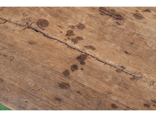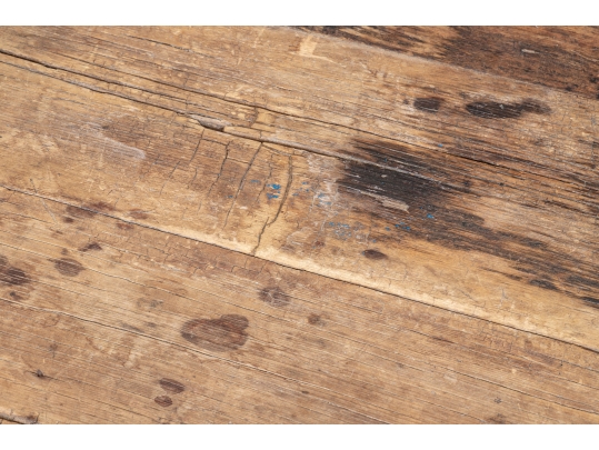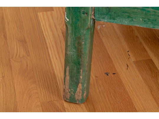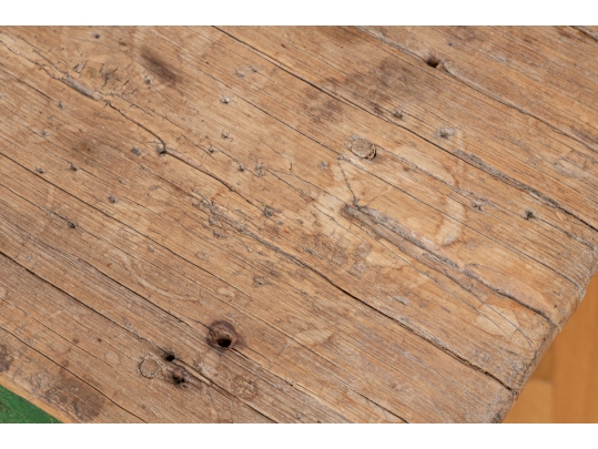 Condition: Please see all detail photos. The entire Table bears Many desirable signs of its age with time-worn surface, age-related areas of paint loss, old stains and an old triangular wood loss to the top, all which add to the authentic look and feel of this great piece.