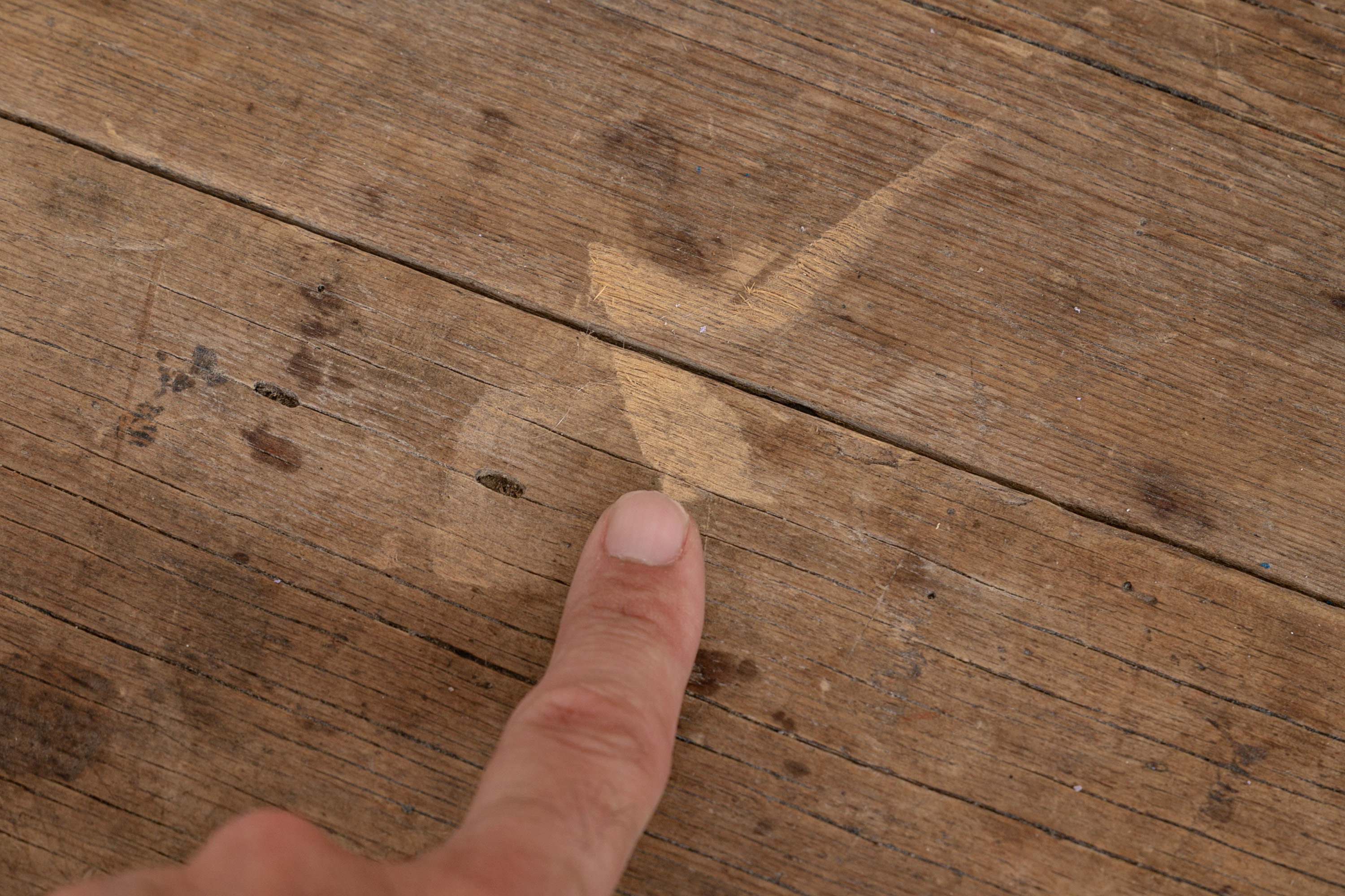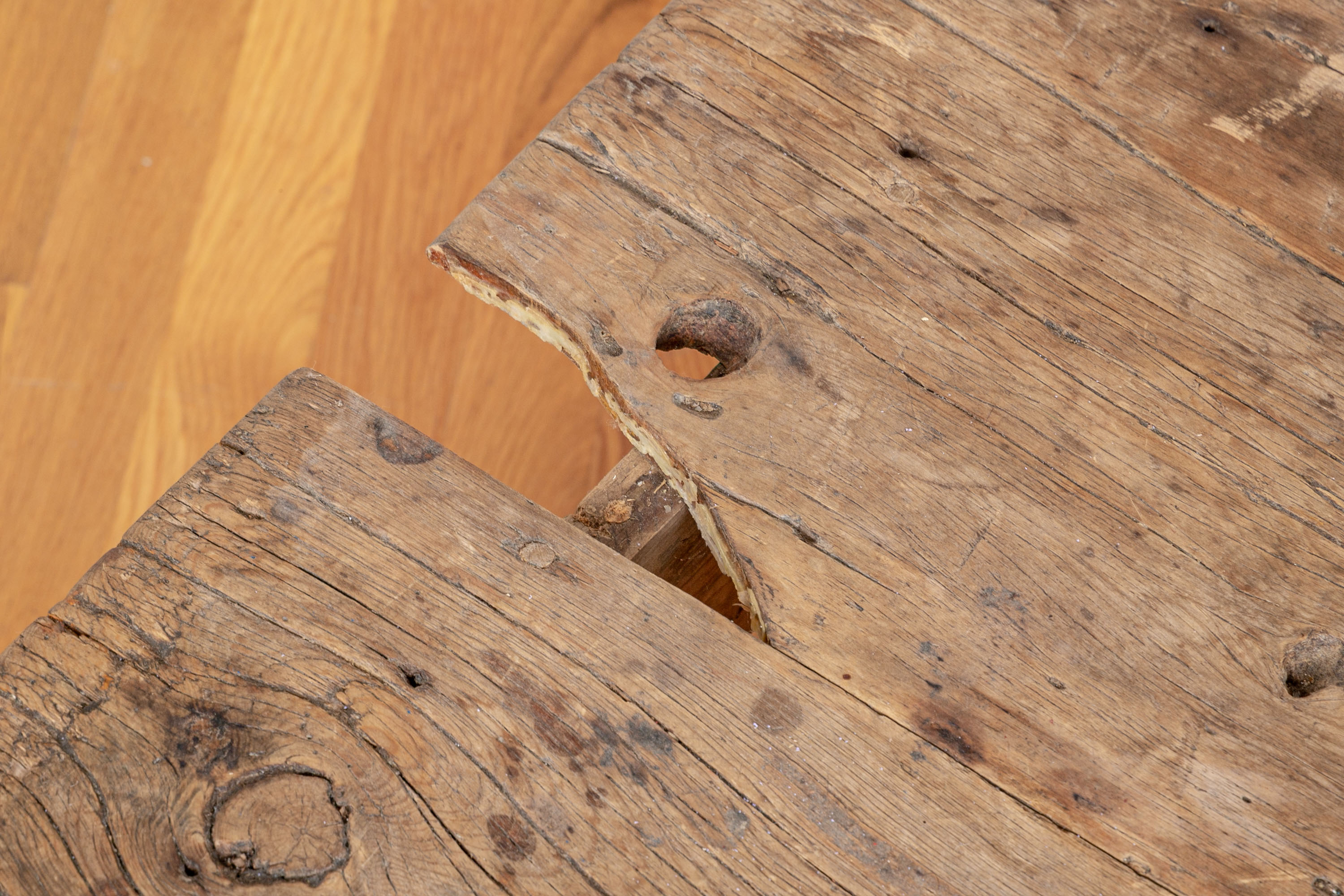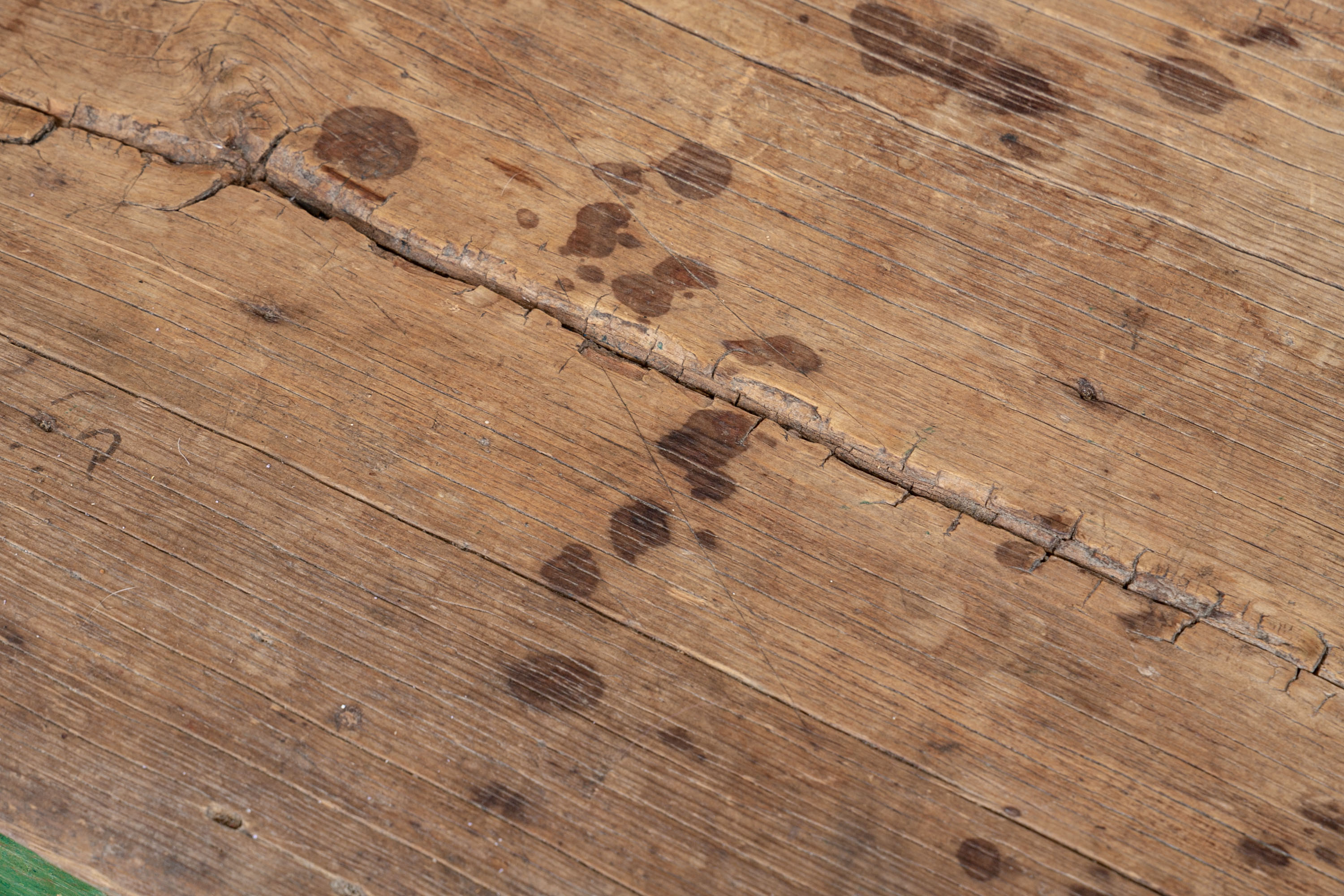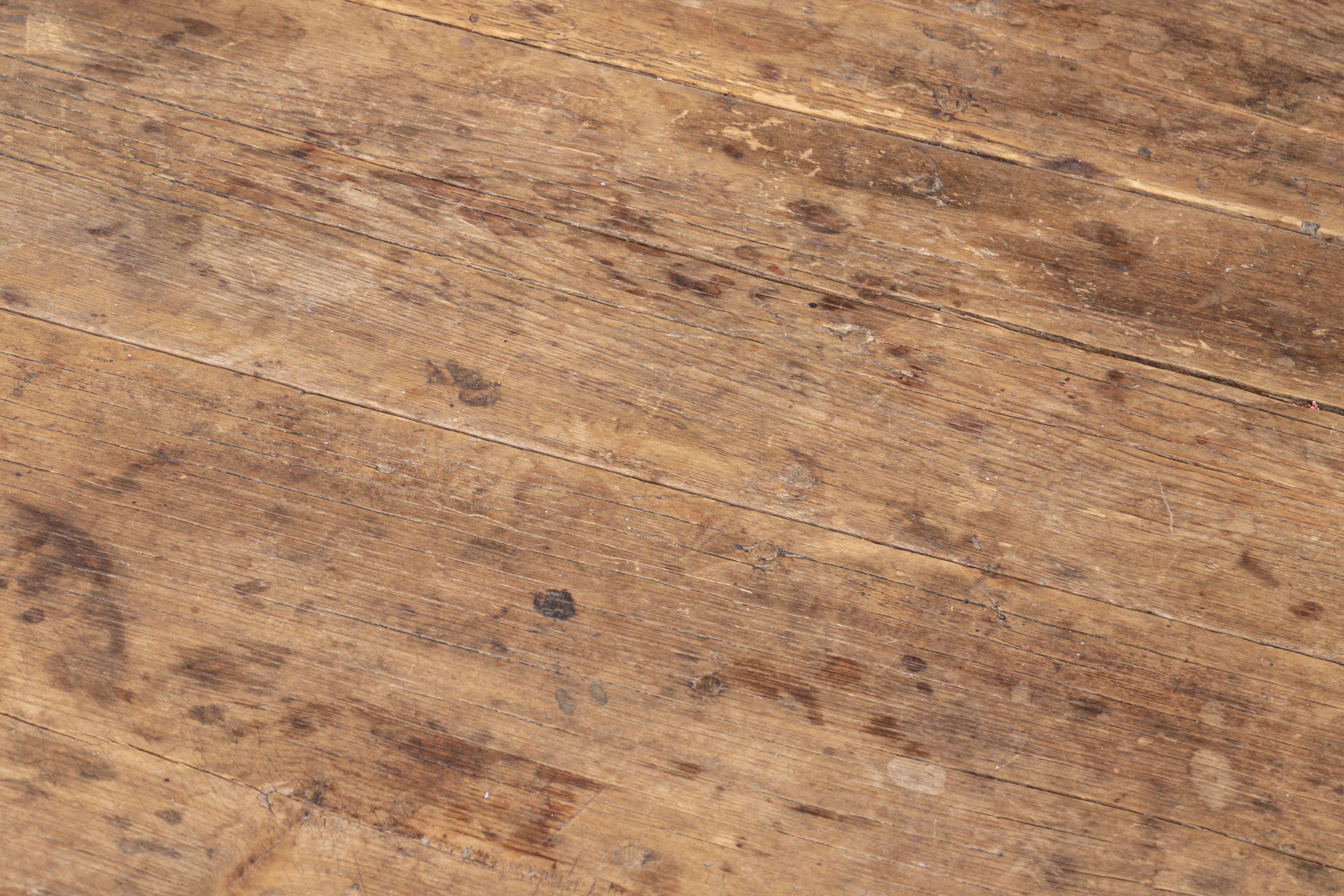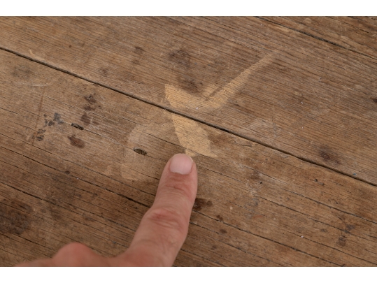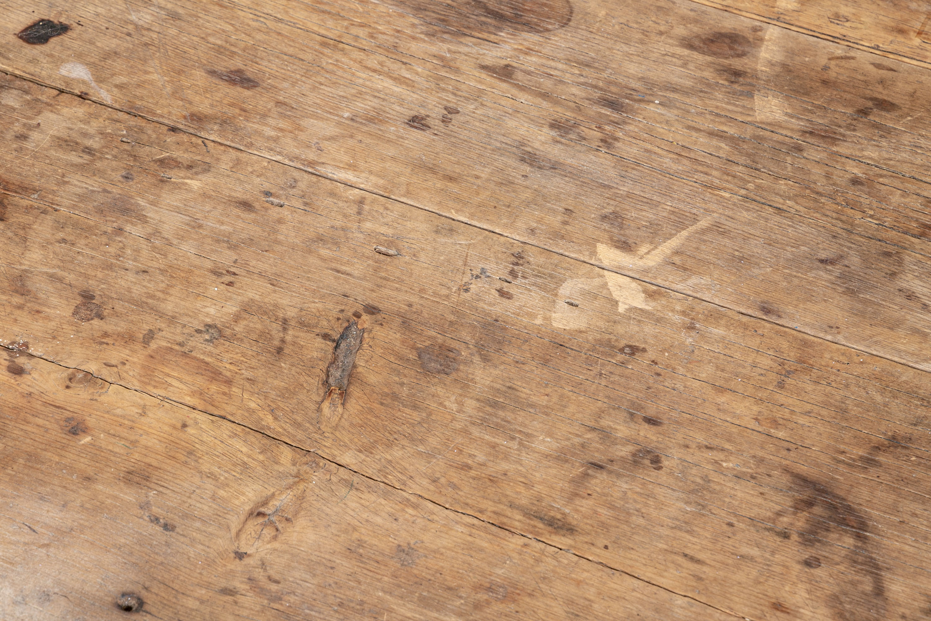 Condition: Please see all detail photos. The entire Table bears Many desirable signs of its age with time-worn surface, age-related areas of paint loss, old stains and an old triangular wood loss to the top, all which add to the authentic look and feel of this great piece.