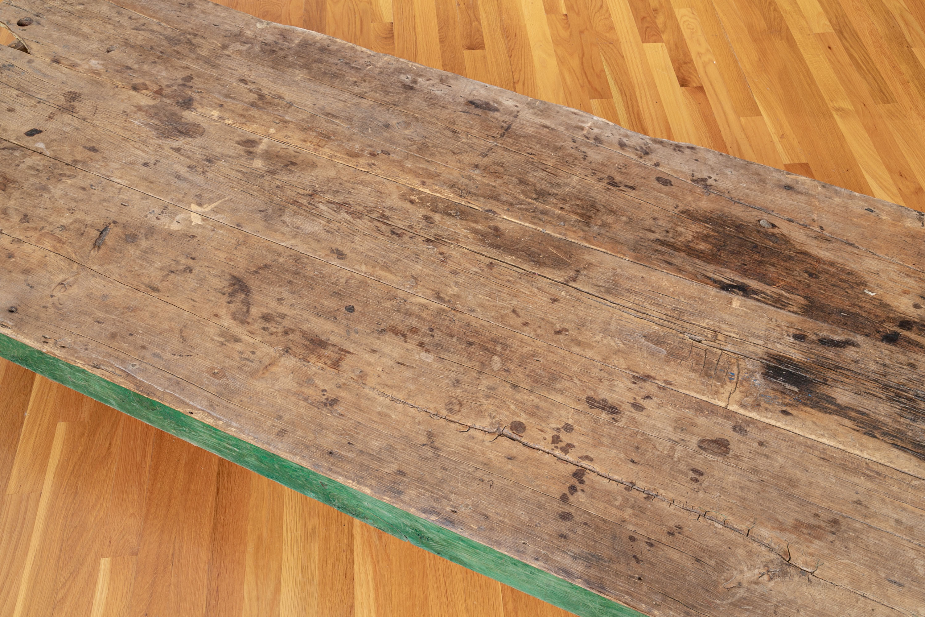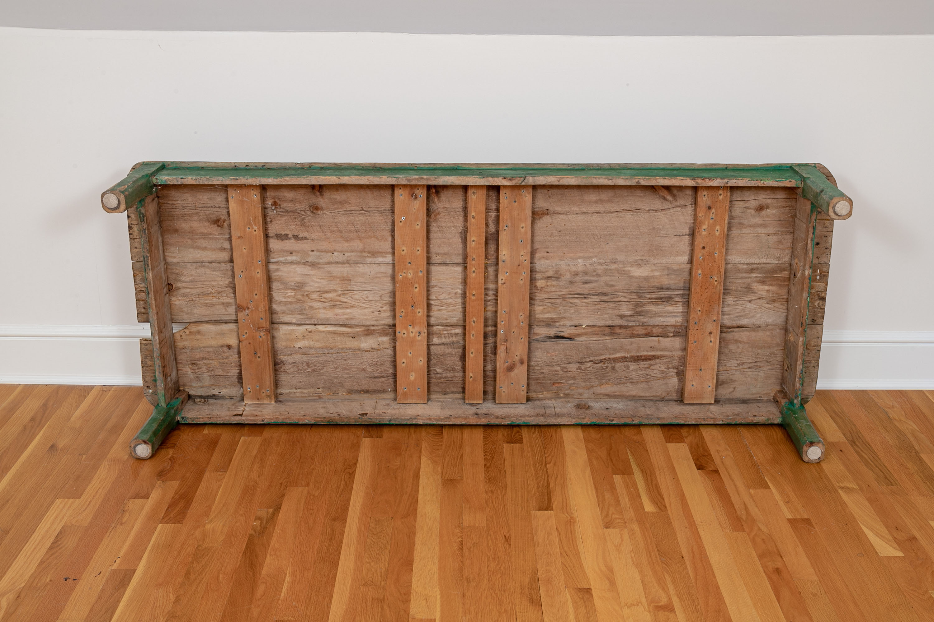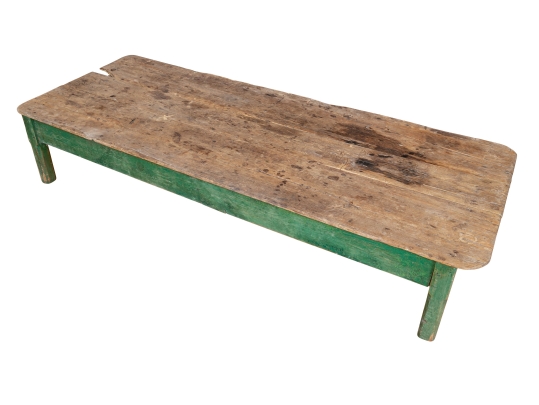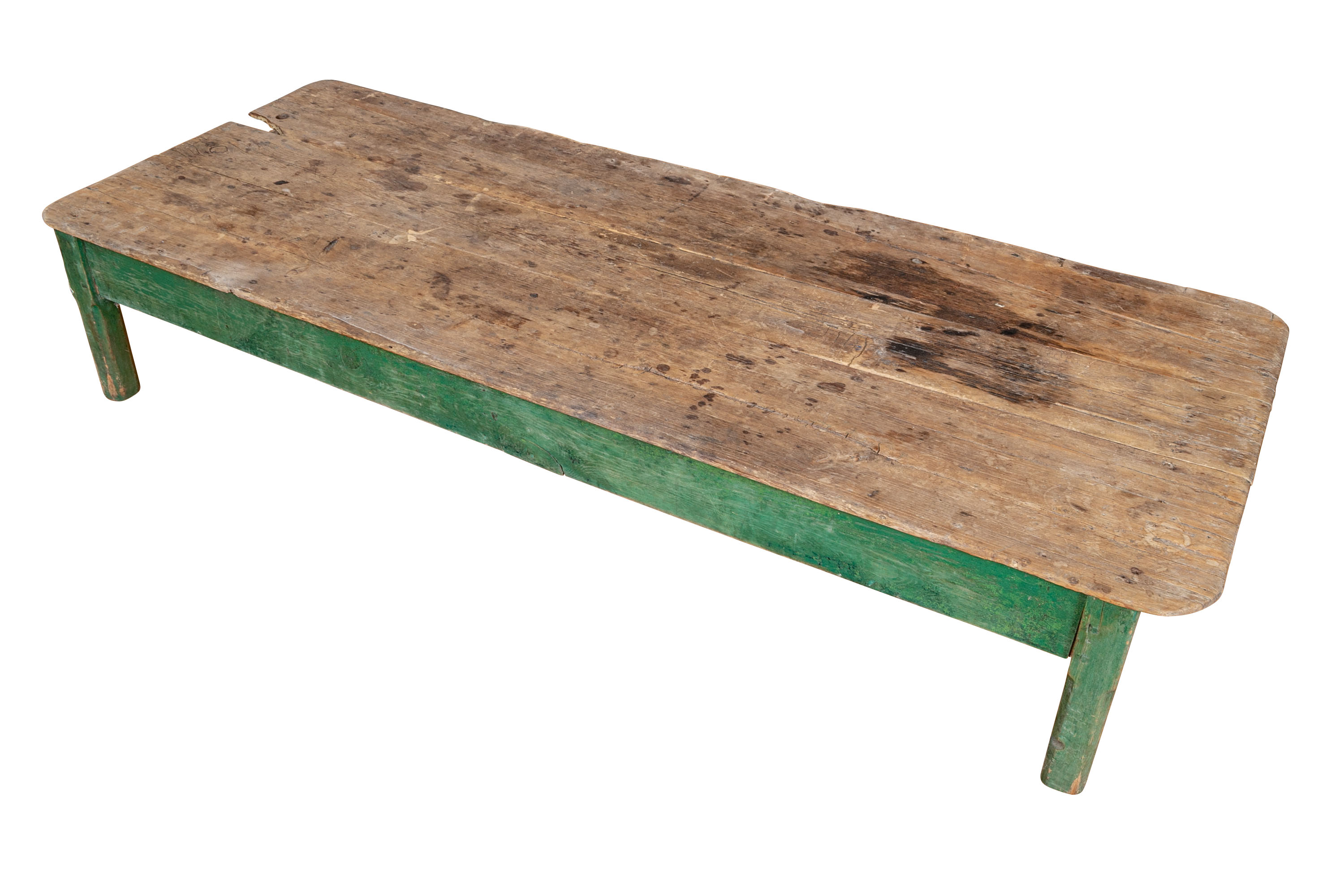 Originally acquired at the iconic New Preston, Connecticut design shop J. Seitz. A Fantastic and very solid feeling 19th Century Table from New Mexico with its original Deep Green painted Legs and Apron. Once used as a Dining Table and now re-purposed as a vey long Low Cocktail Table.