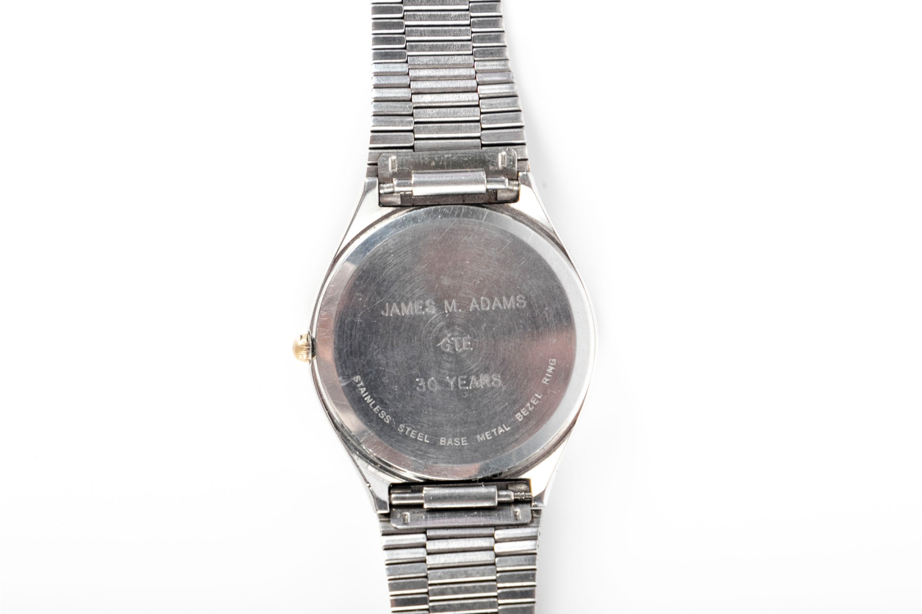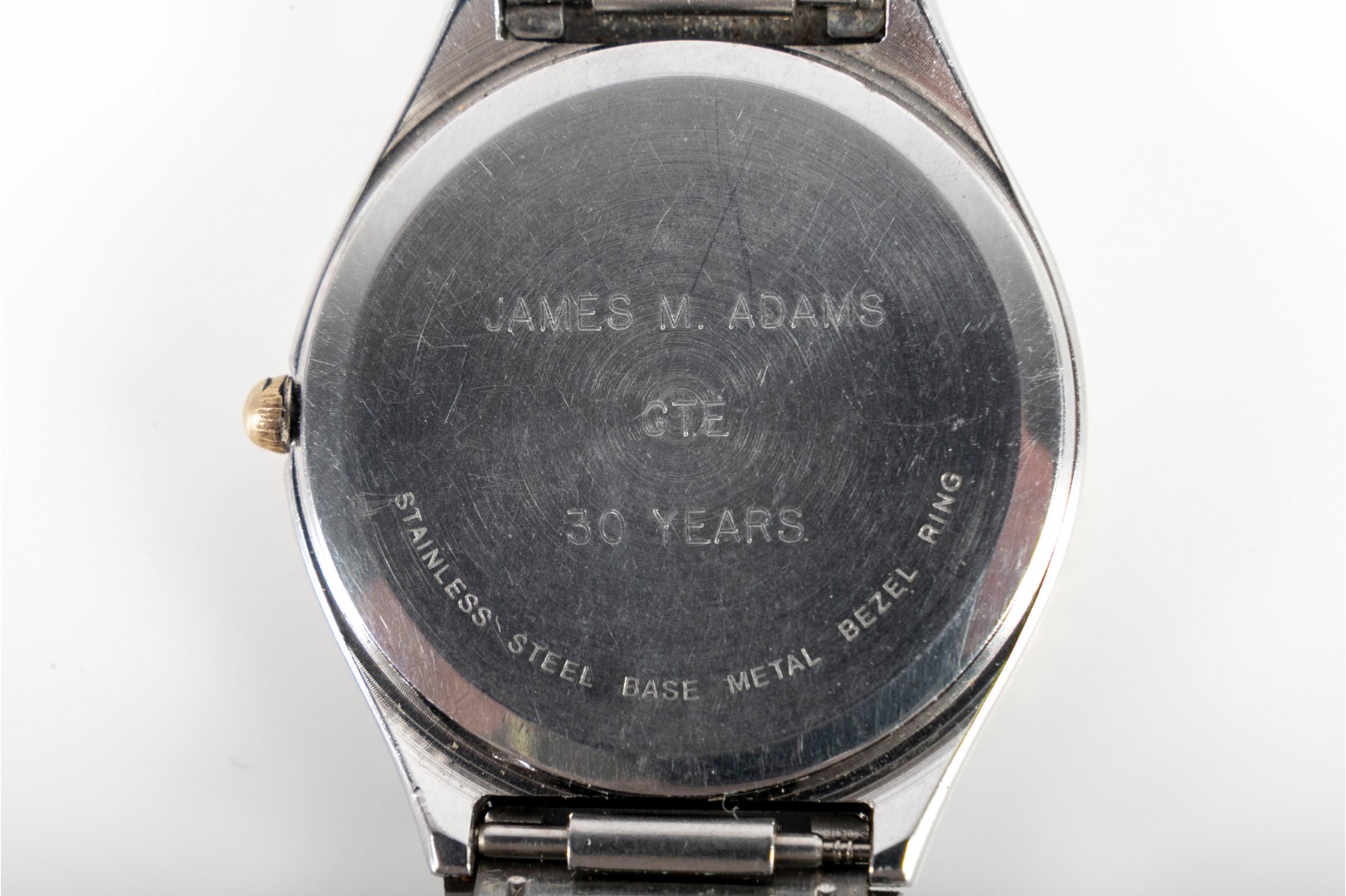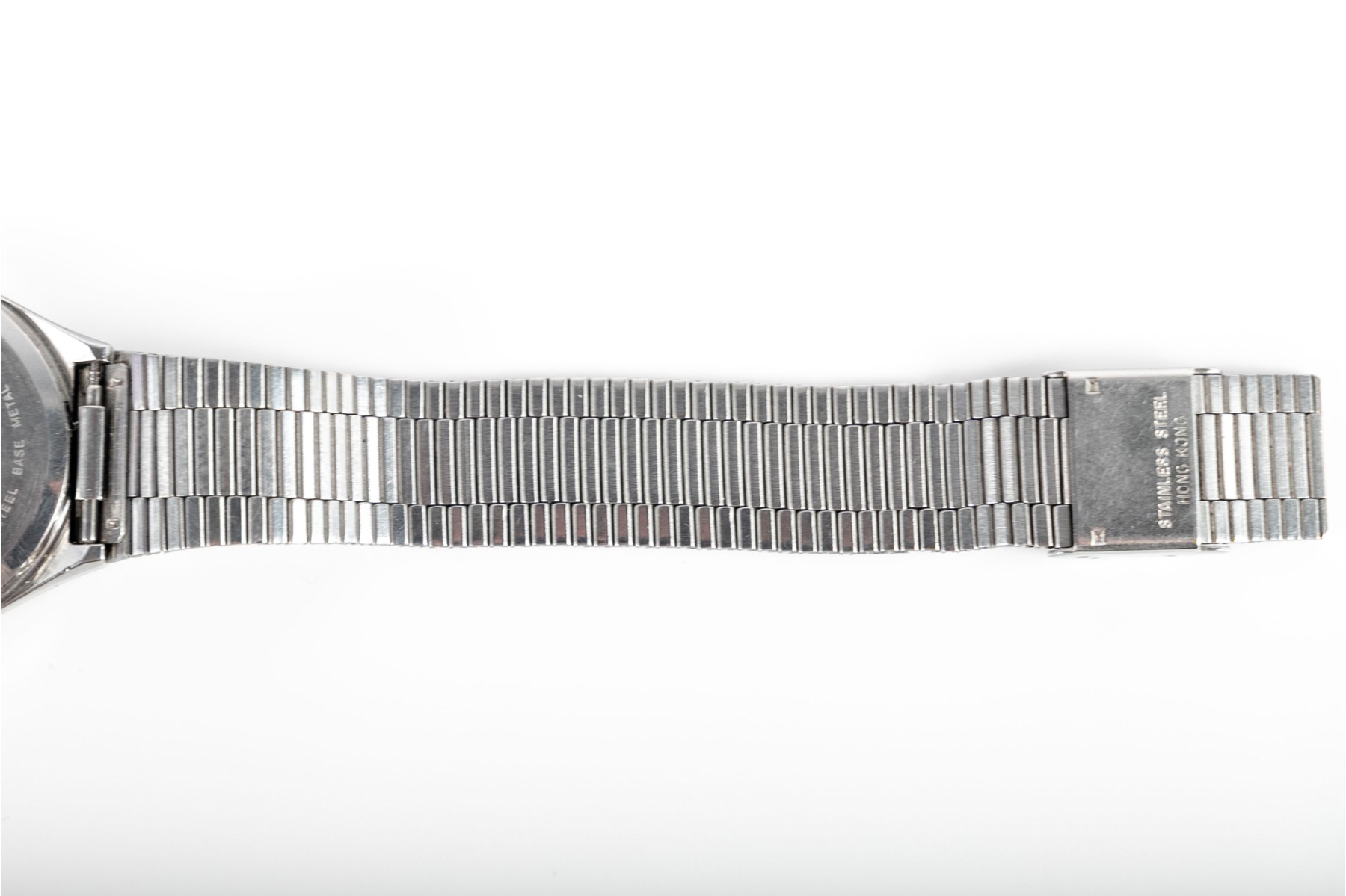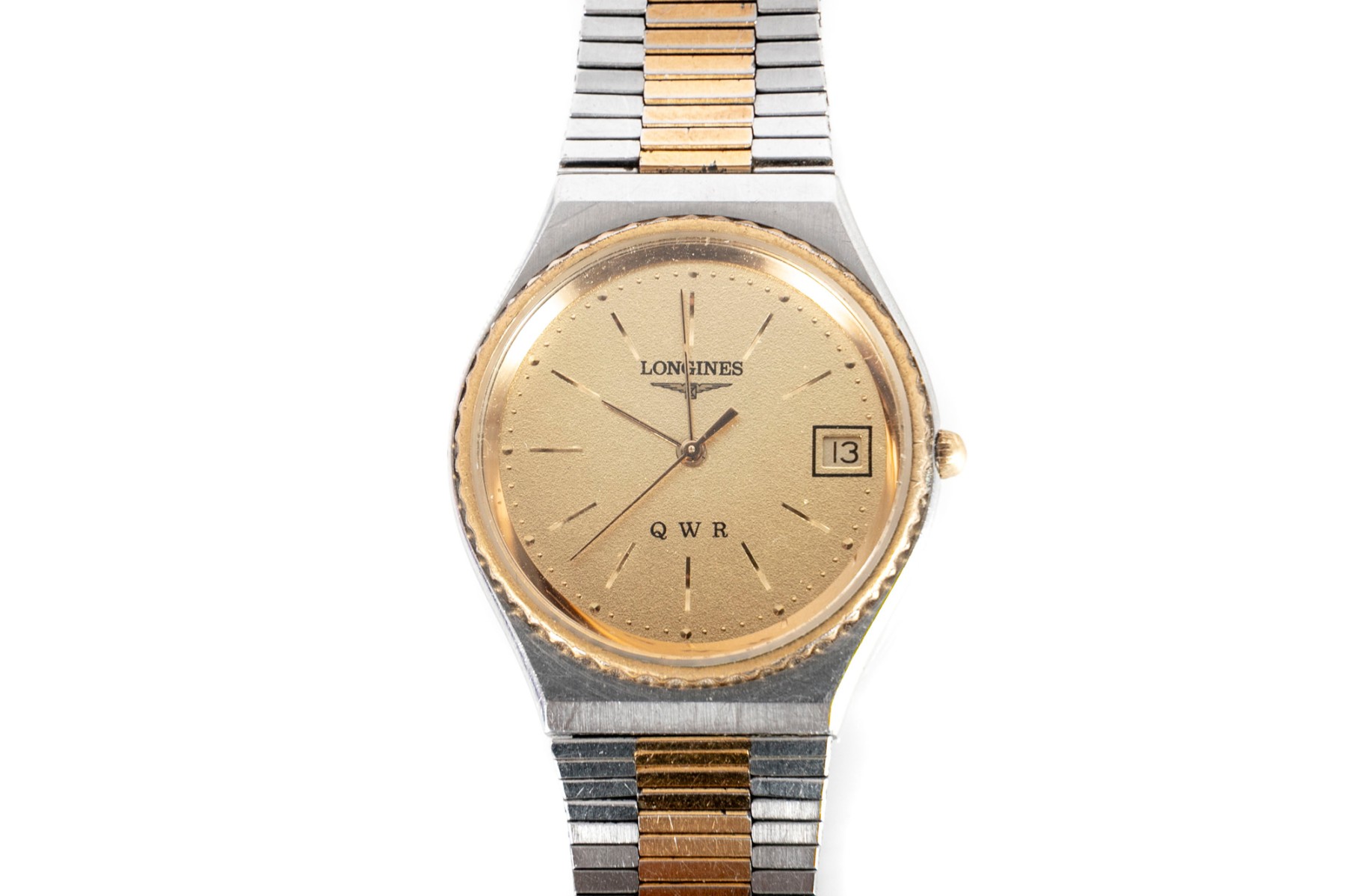 A handsome Longines QWR stainless steel wristwatch with gilt accents, including a textured dial with monochromatic hands and hour markers. Features a date sub dial. Stout, blunt lugs lead to fine links along the band, adding a stylish flair with a contrasting center stripe.