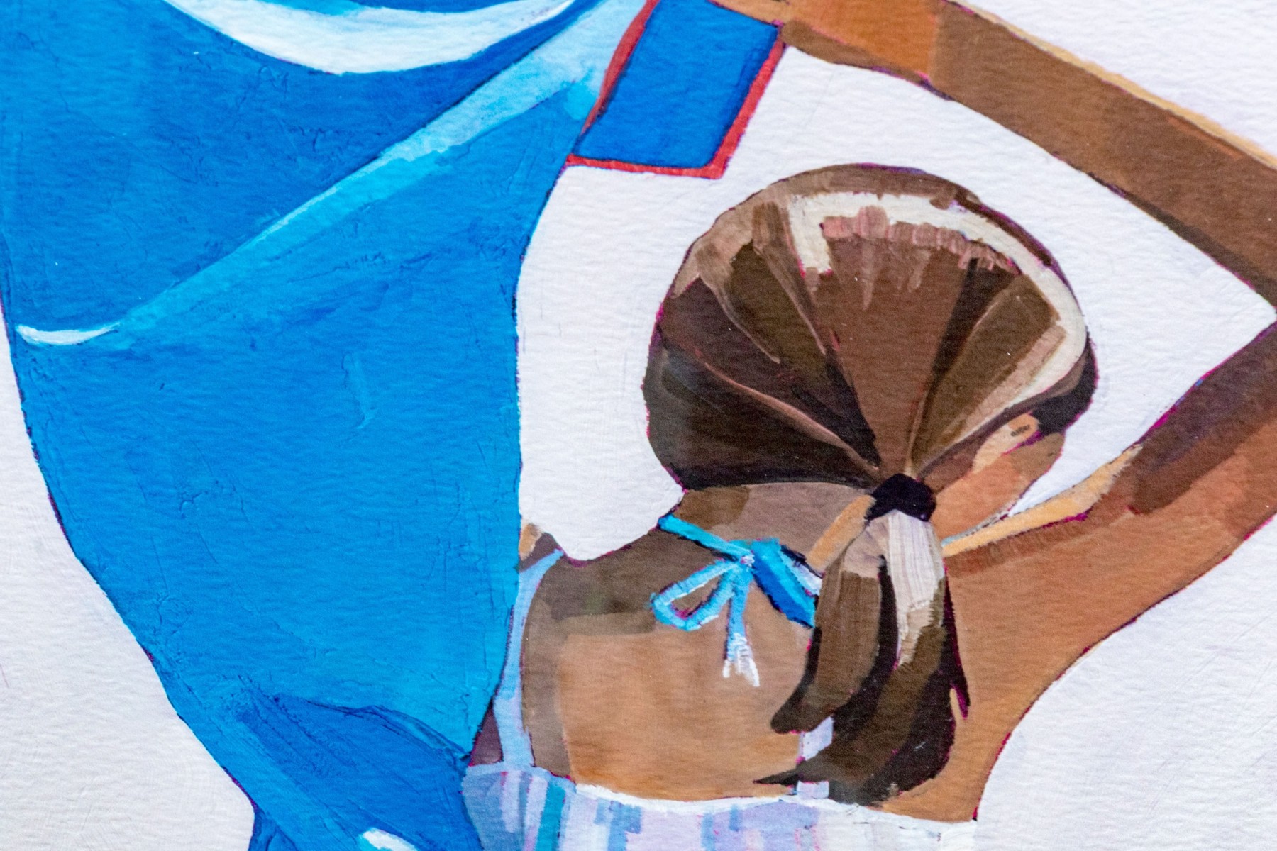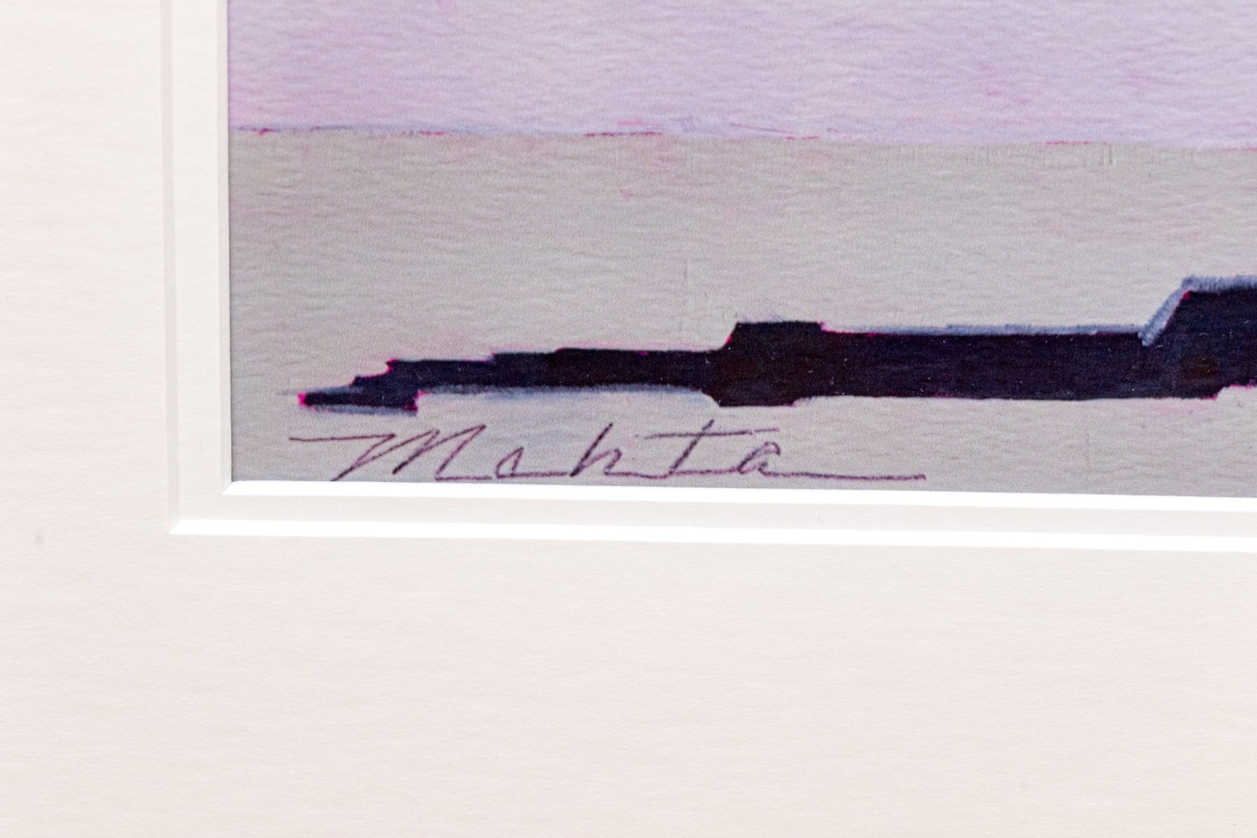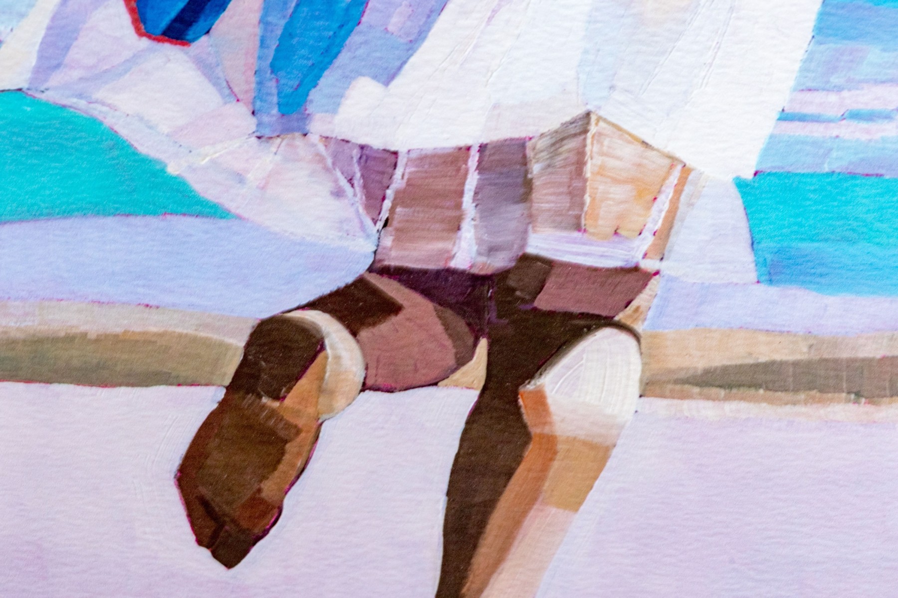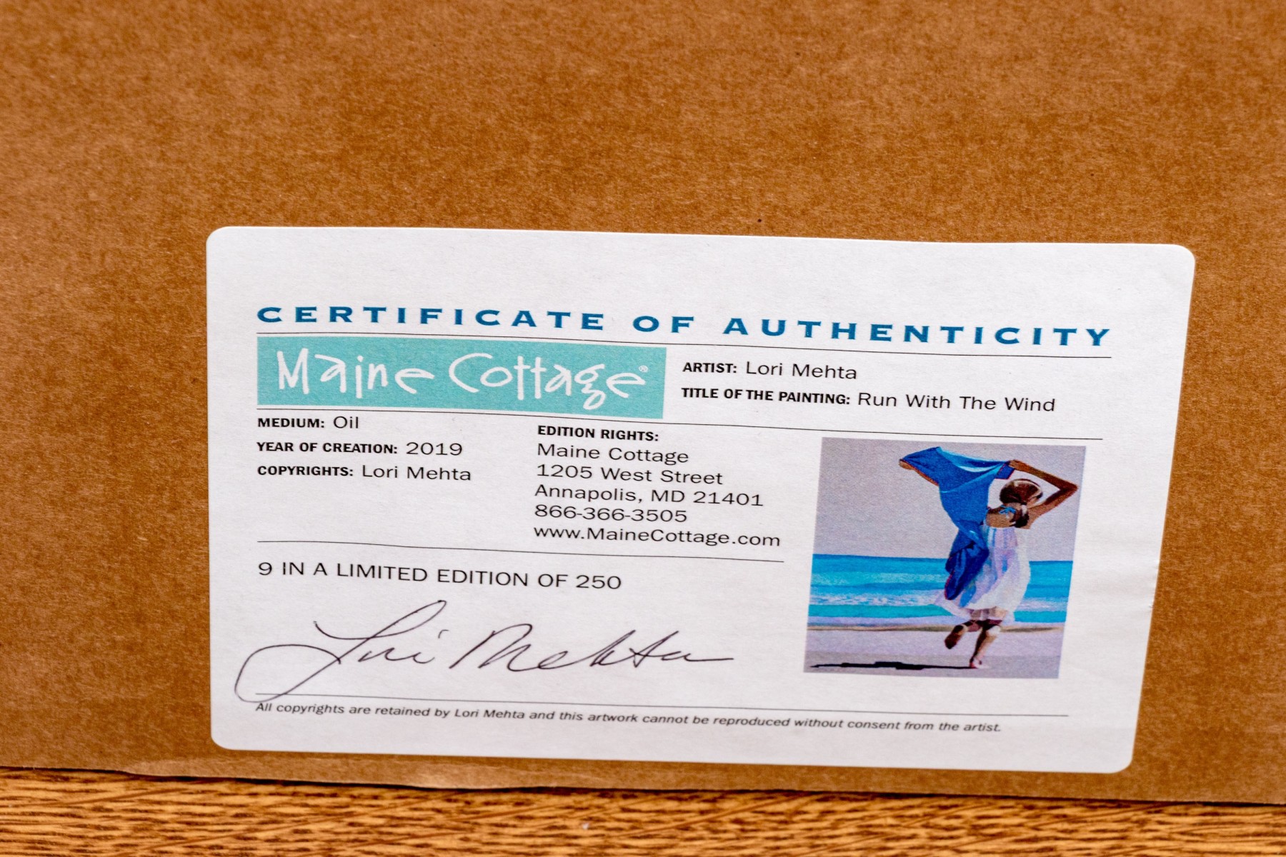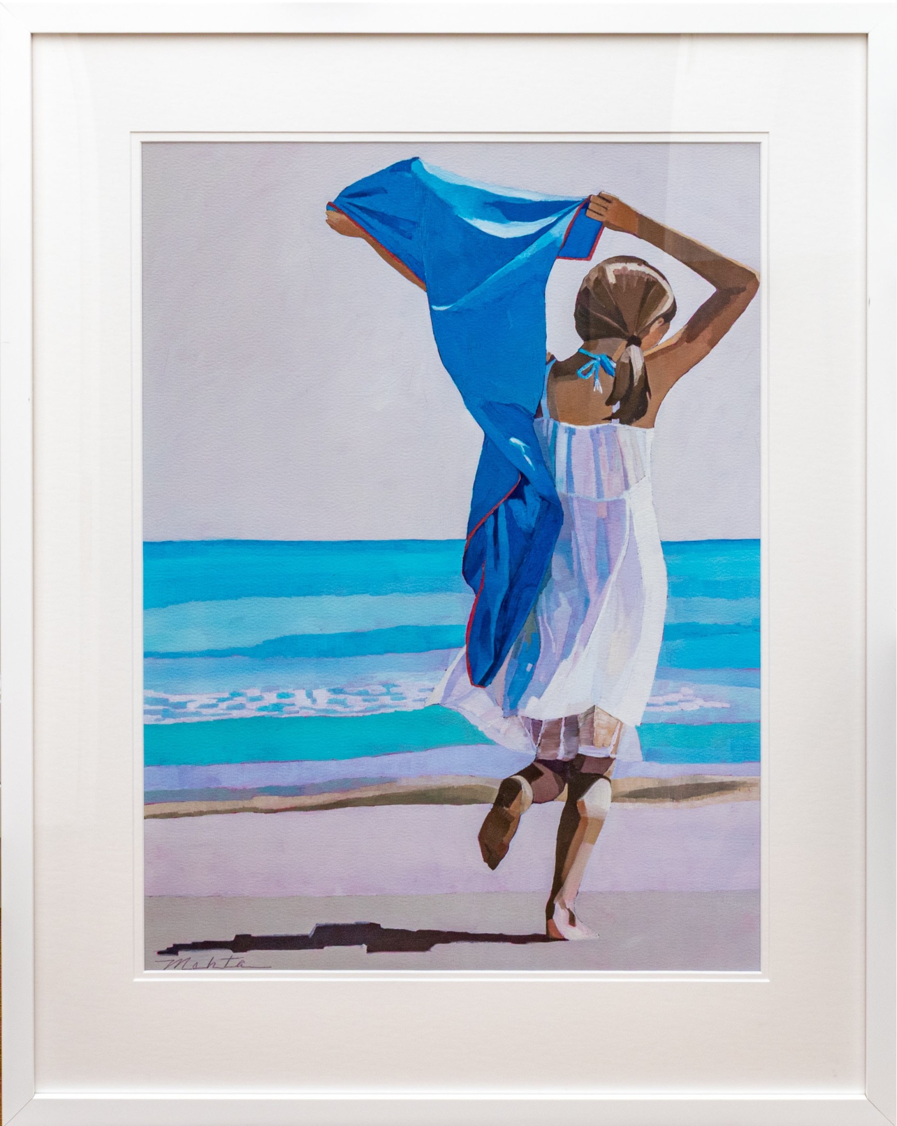 Lori Mehta (American [MA], b. 1958) "Run With The Wind" print depicting a young woman with brunette hair pulled into a ponytail wearing a white dress while holding a blue shawl over her head, running along the shore of a vibrant aqua blue ocean against a pale blue sky. Plate signature lower left. Affixed with a label to the verso denoting the edition 9/250.