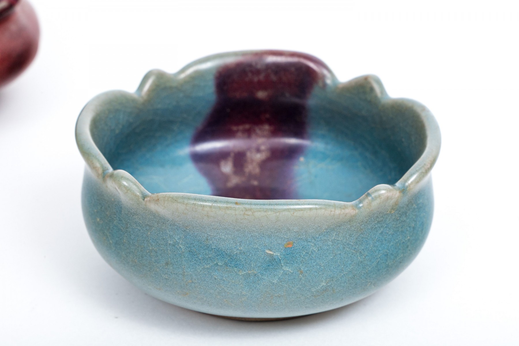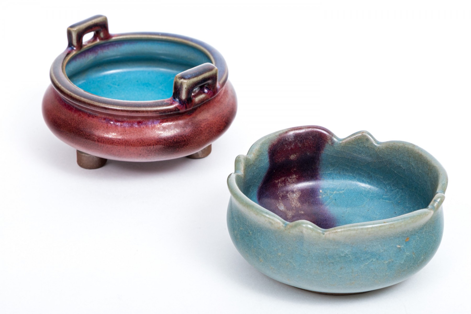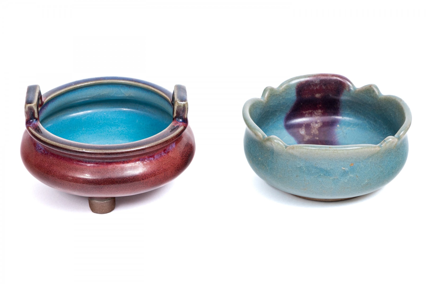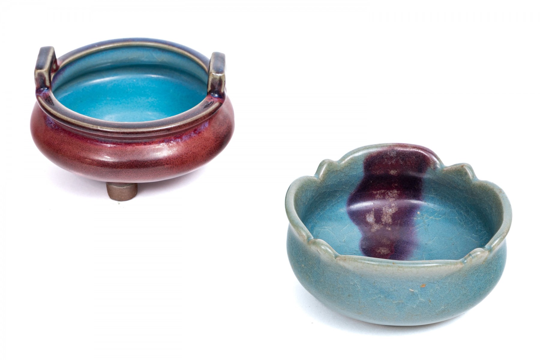 This lot includes a tripod, twin handled, Jun Yao glazed censer / incense burner and a lotus, petal form brush-washer coupe. Both with thickly applied, unctuous Jun glaze coating.