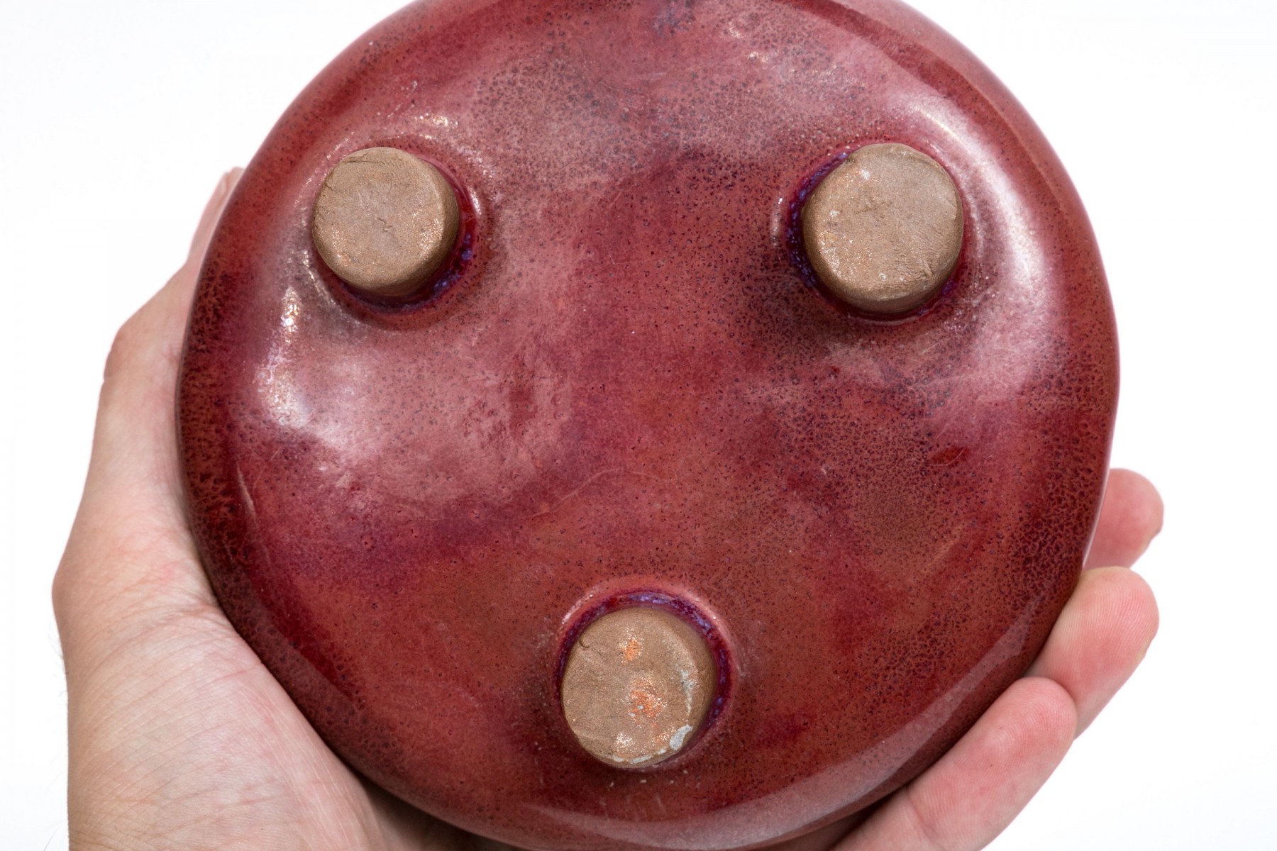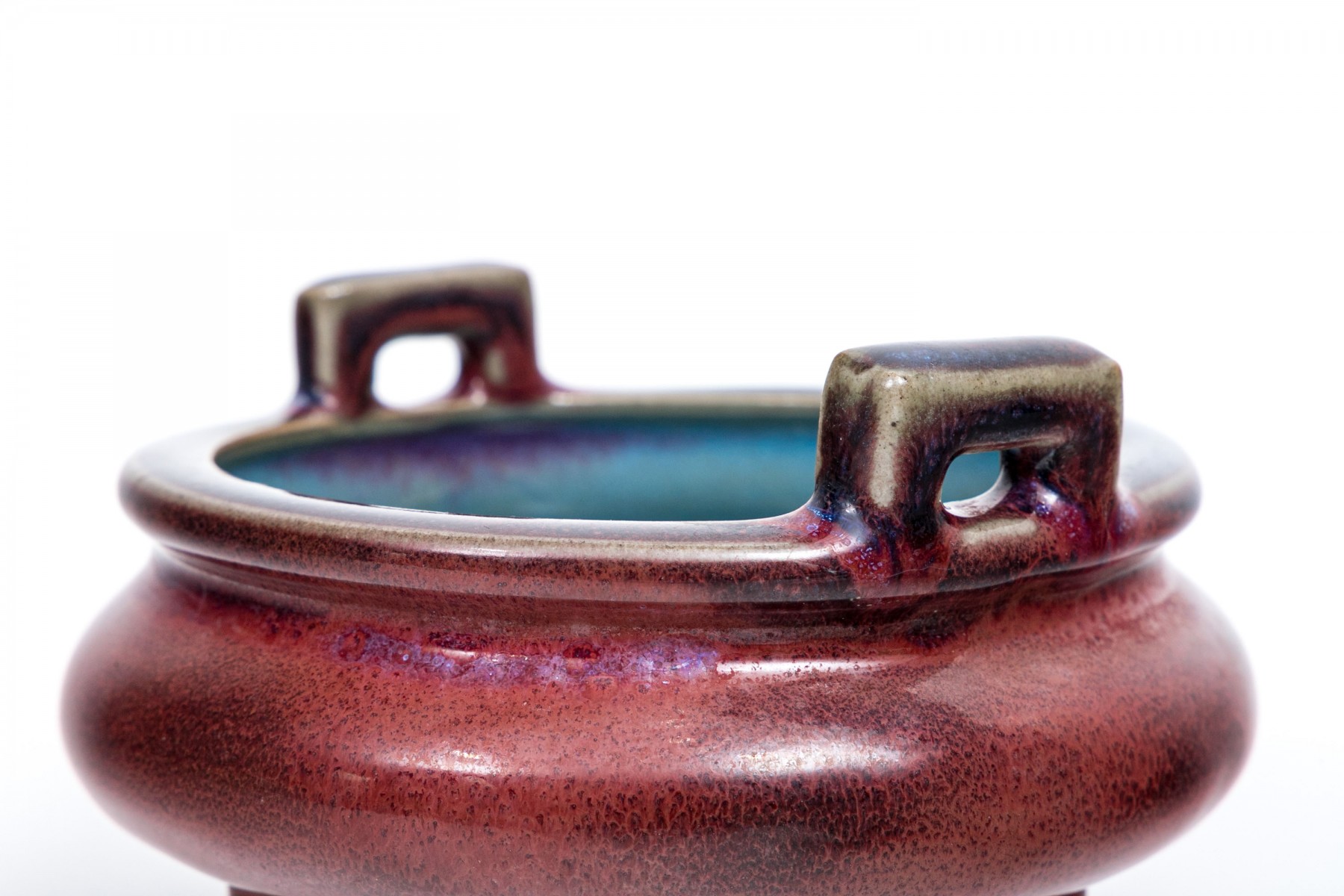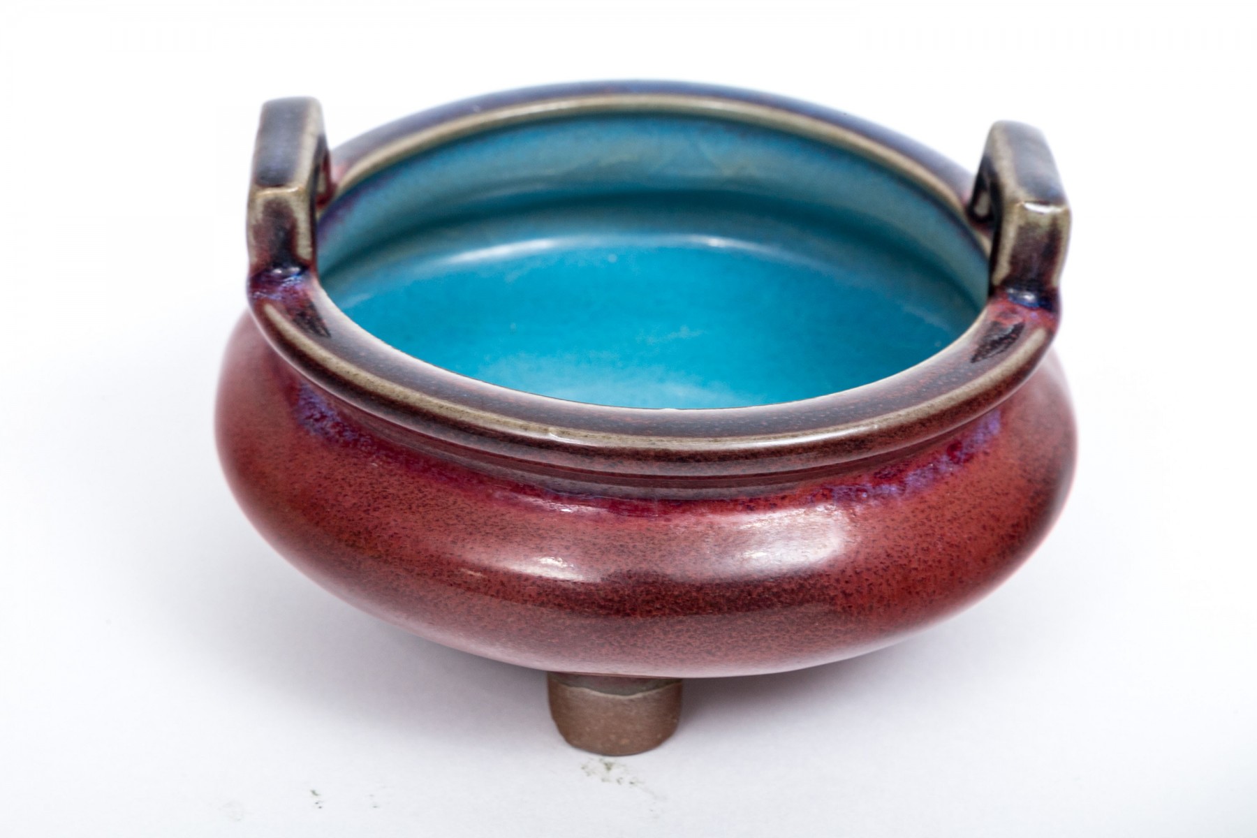 - Censer: In good form with light underglaze crackles to the interior with a small smudge to the interior which is underneath the glaze and in fact along with the crackles lends depth to the otherwise monochrome glaze. The depth lends wonderful virtuosity and overall the item is fantastic. One can gaze at the thick, dreamy glaze as it stops just sho of the three feet tips which display the red earthen stoneware body. Presents fantastically overall.