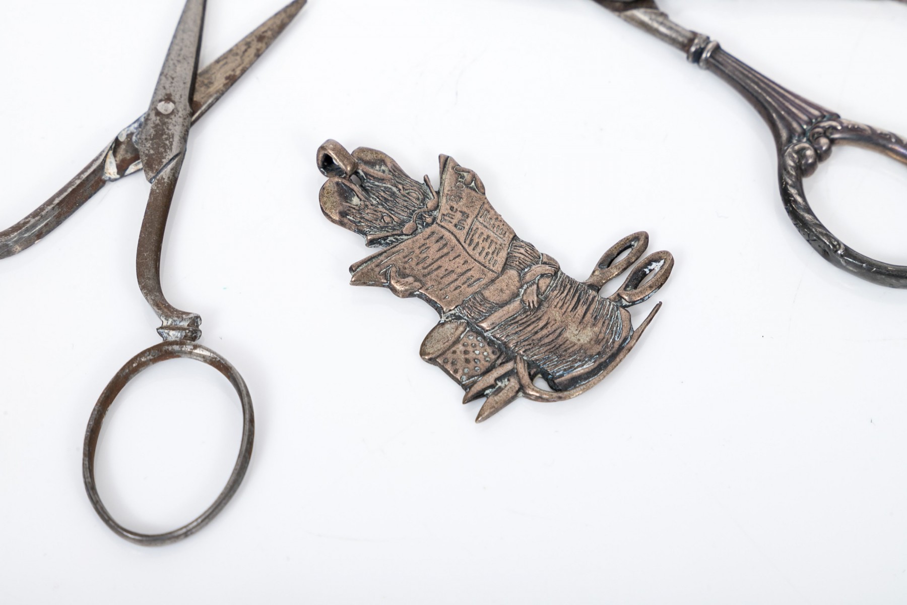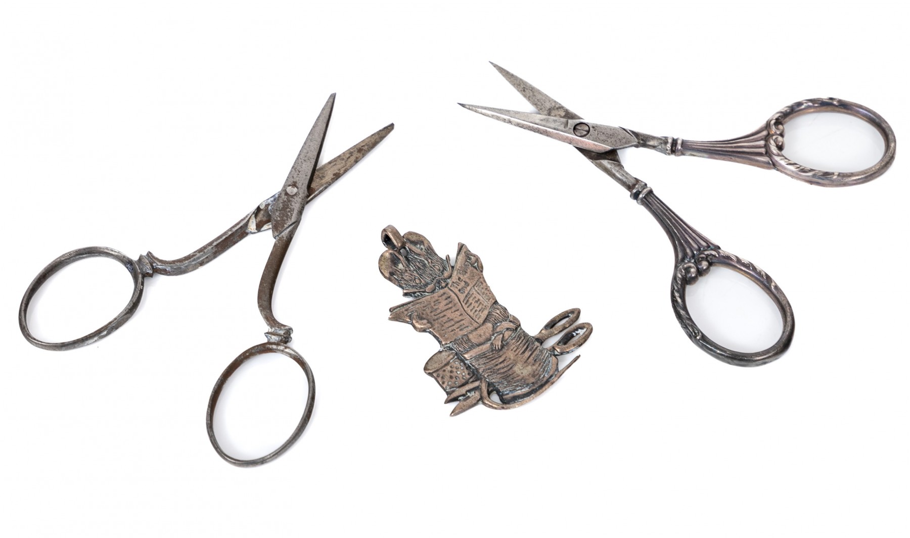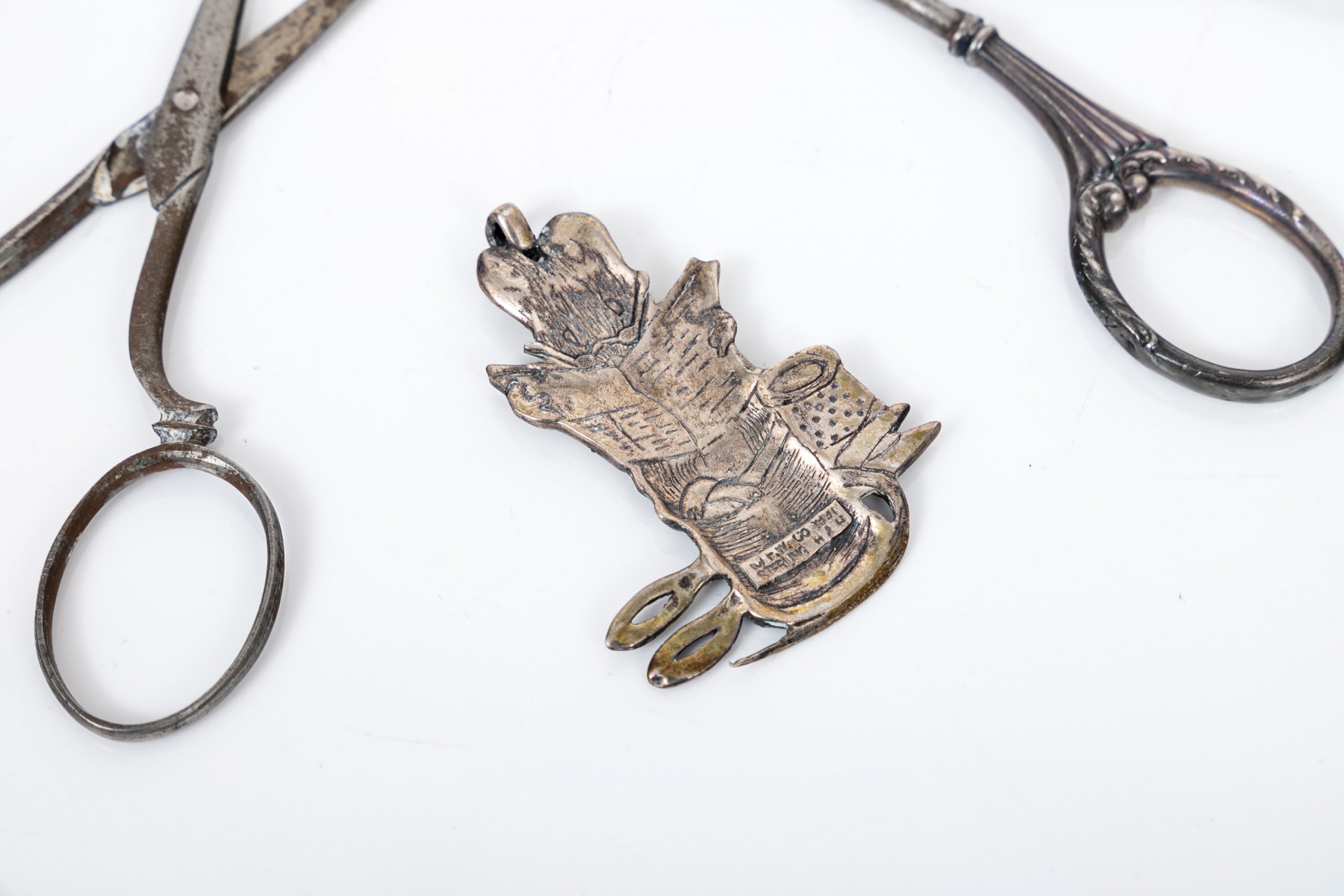 Lot of antique sewing items including a sterling thread cutter and two pairs of sewing scissors