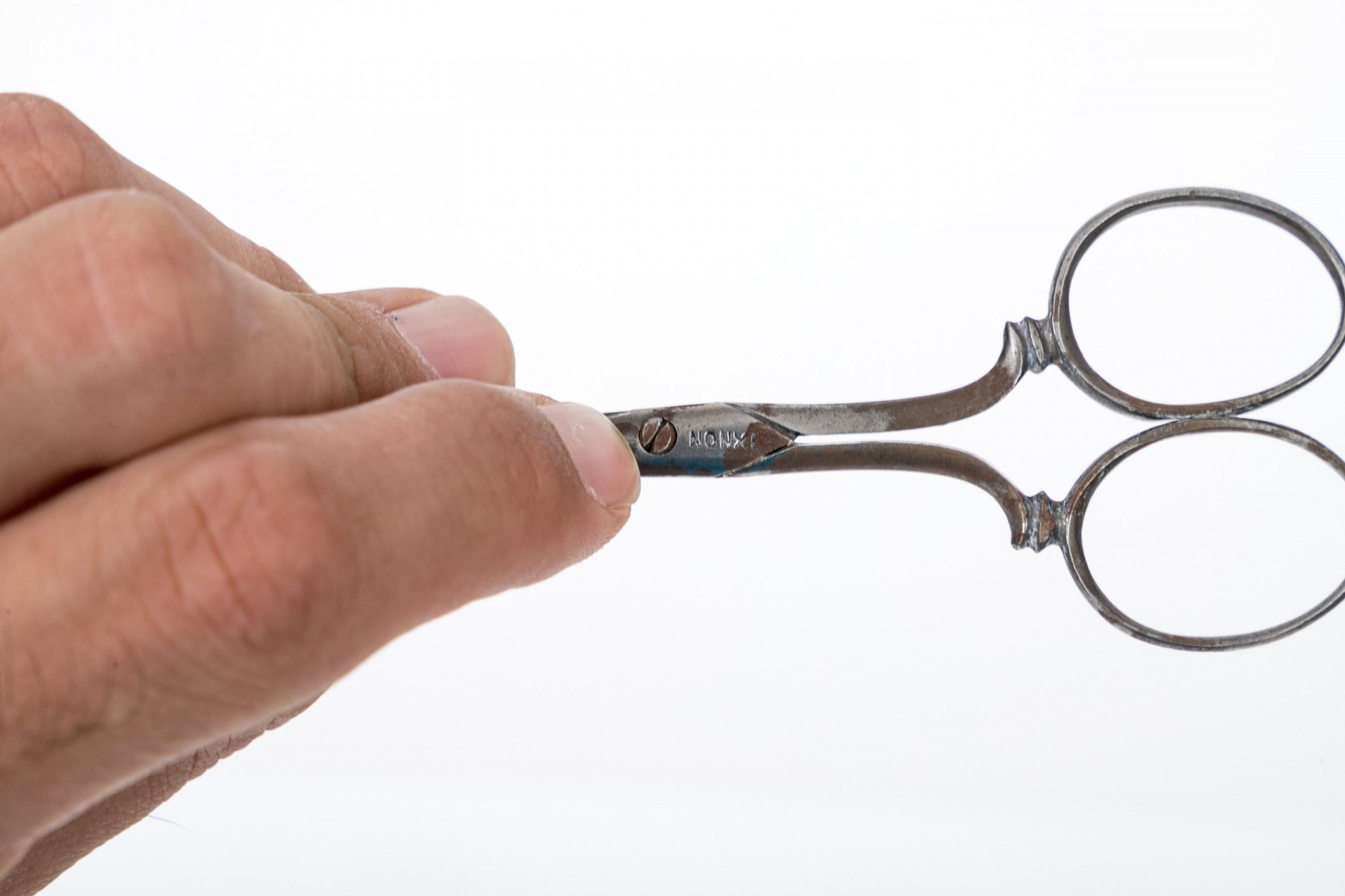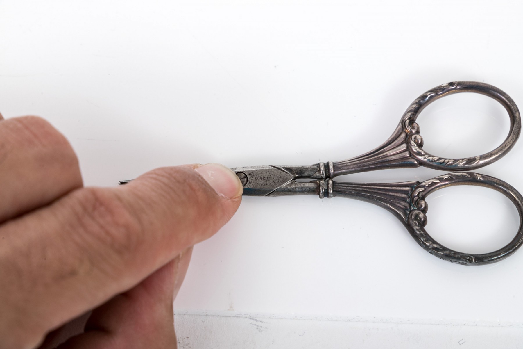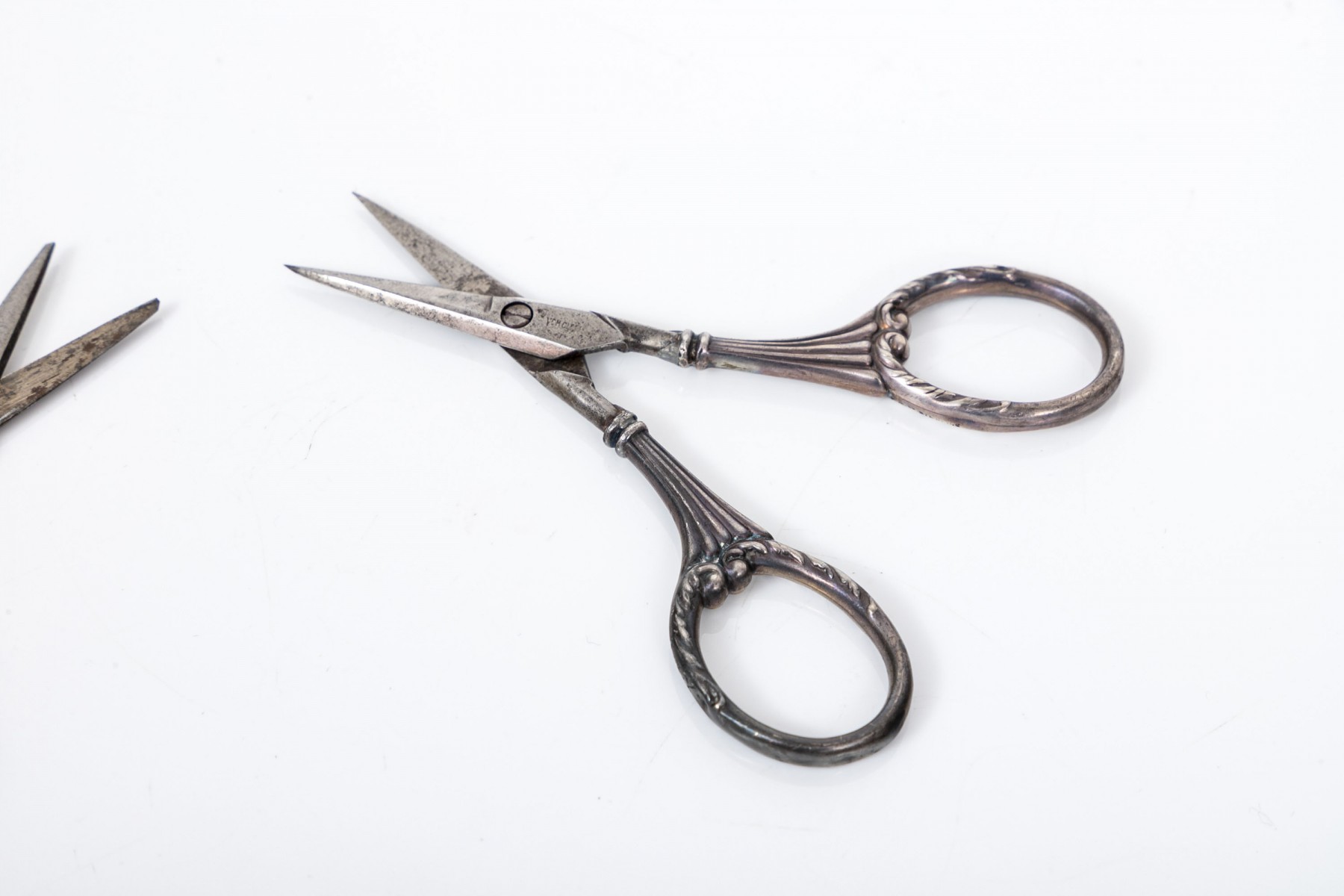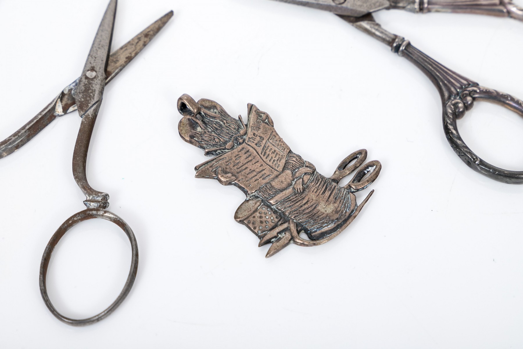 Lot of antique sewing items including a sterling thread cutter and two pairs of sewing scissors