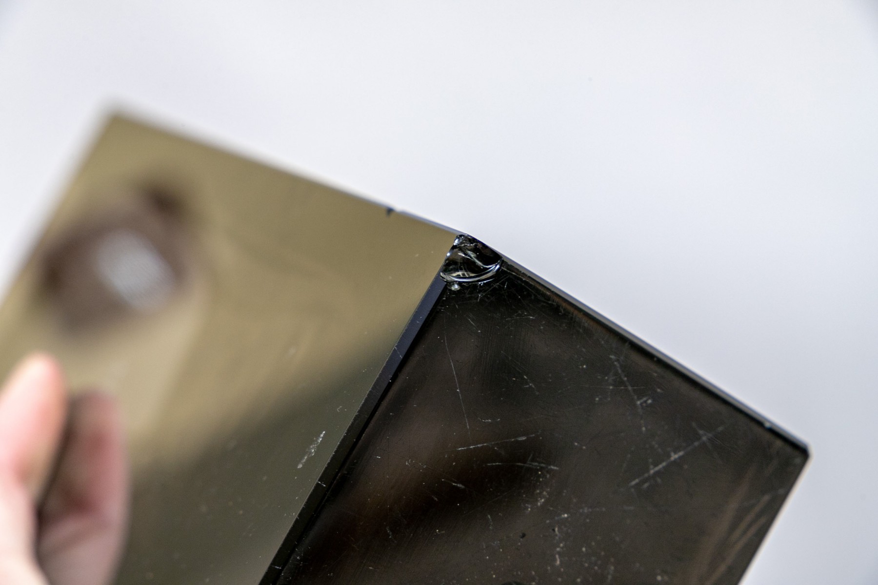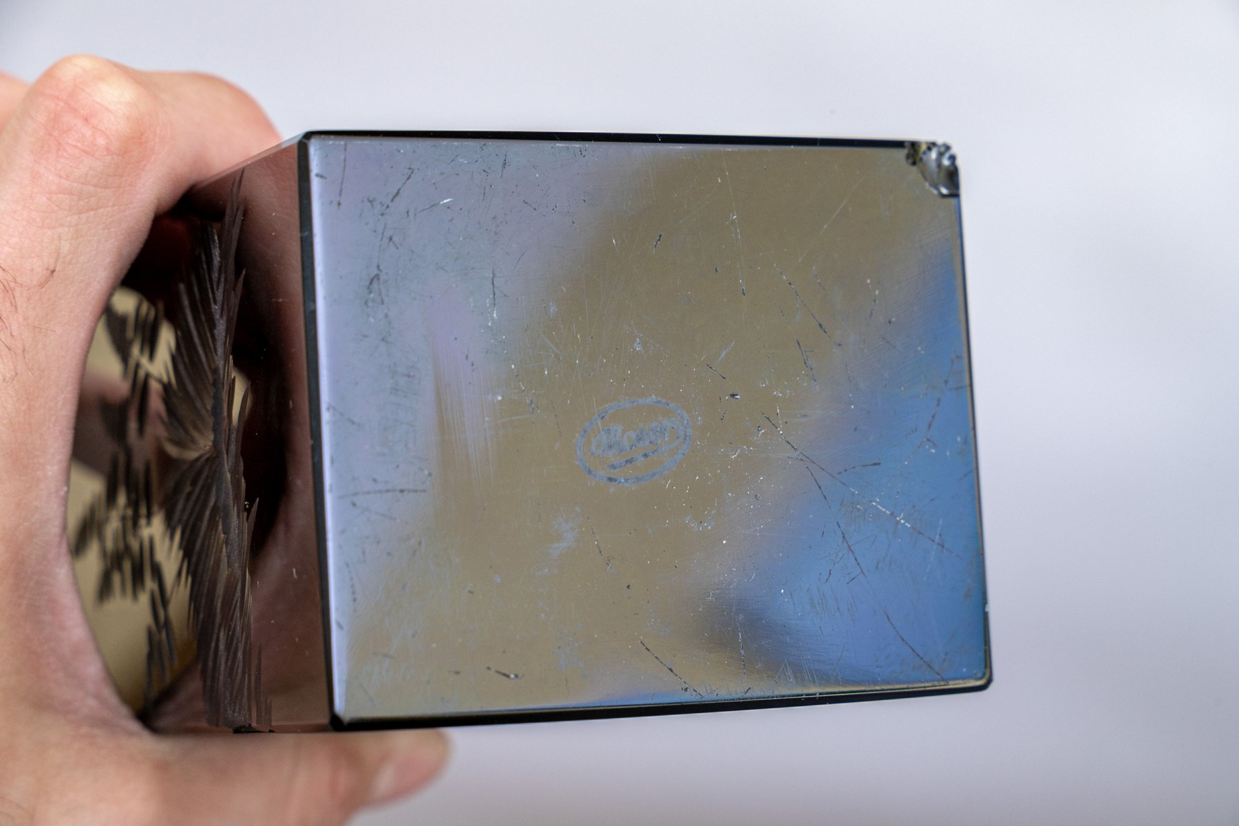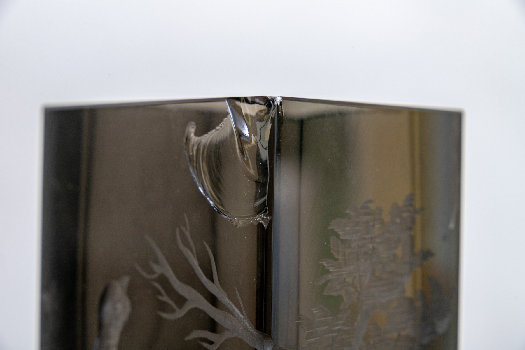 Condition: The Moser smoky crystal vase has a chip to the upper mouth rim in one corner. Exterior layer of the glass chipped off and that corner is sharp with chipping. The chip could either be finished and sanded down or enjoyed as is for the overall impressiveness of the vase.