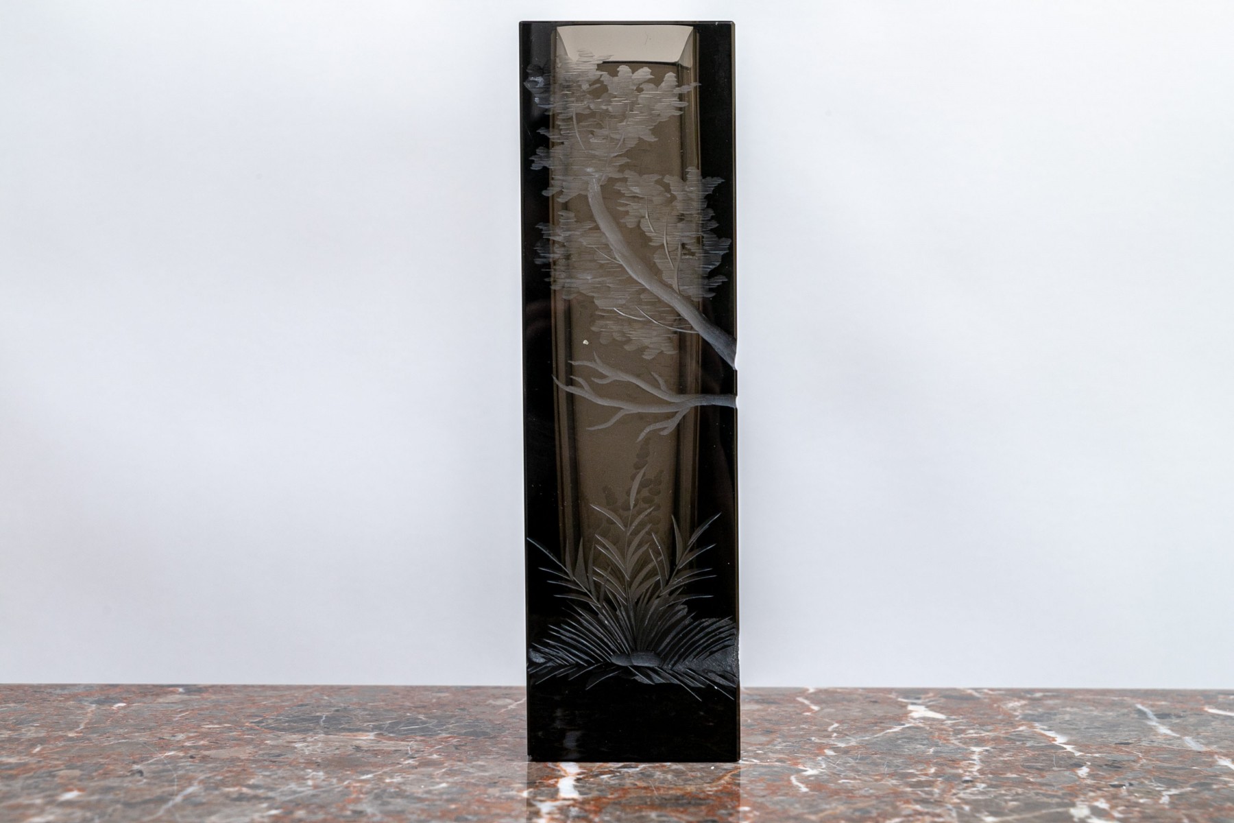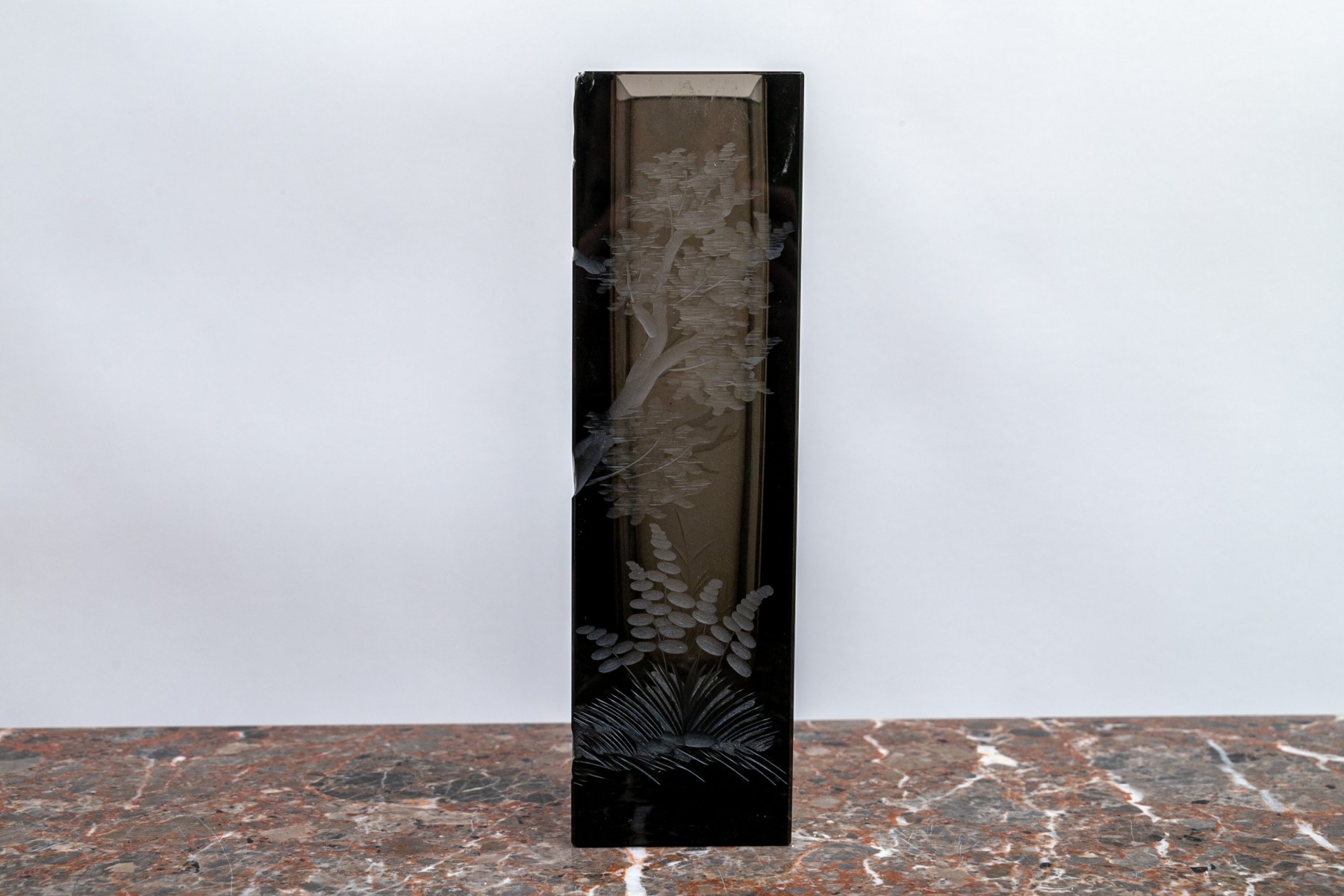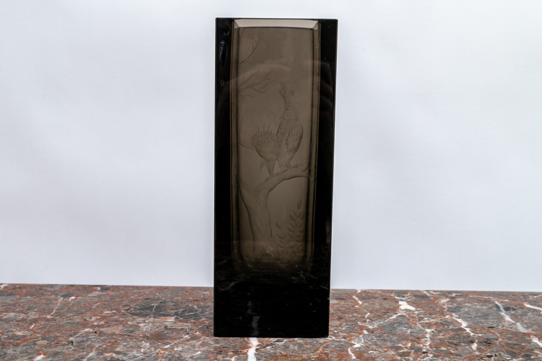 - Vintage Moser, Moulded smoky crystal, rectangular vase with relieved textural decoration of a bird with fan tail elevated and perched on a tree with fauna below. Decoration to three sides.