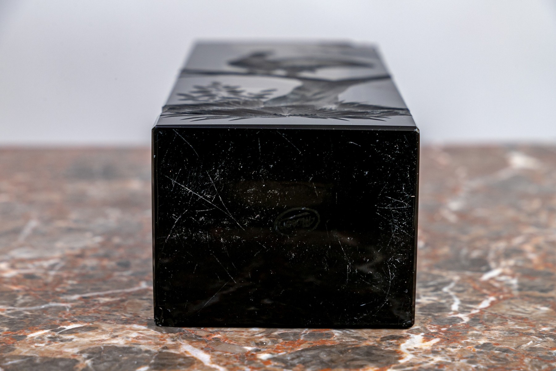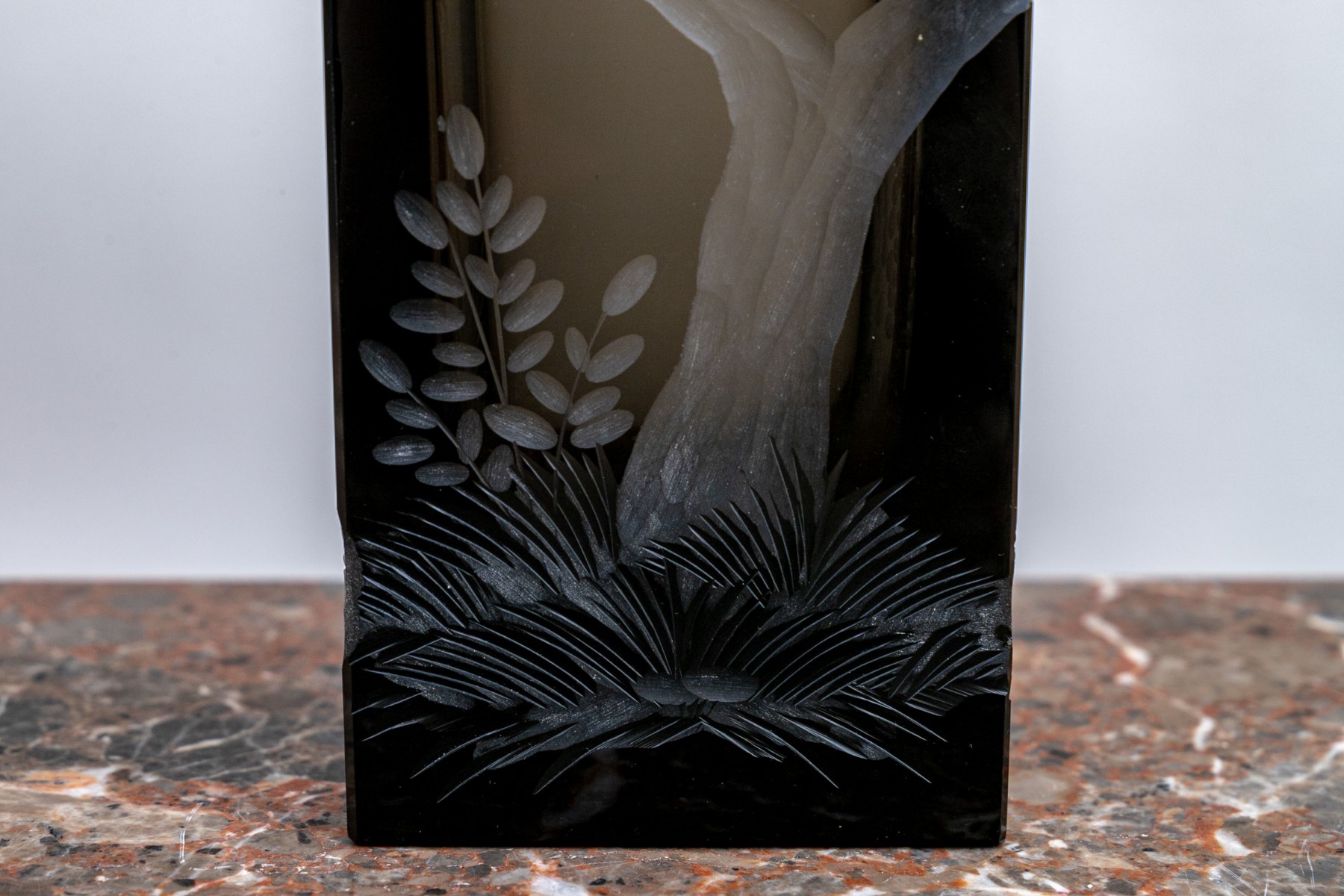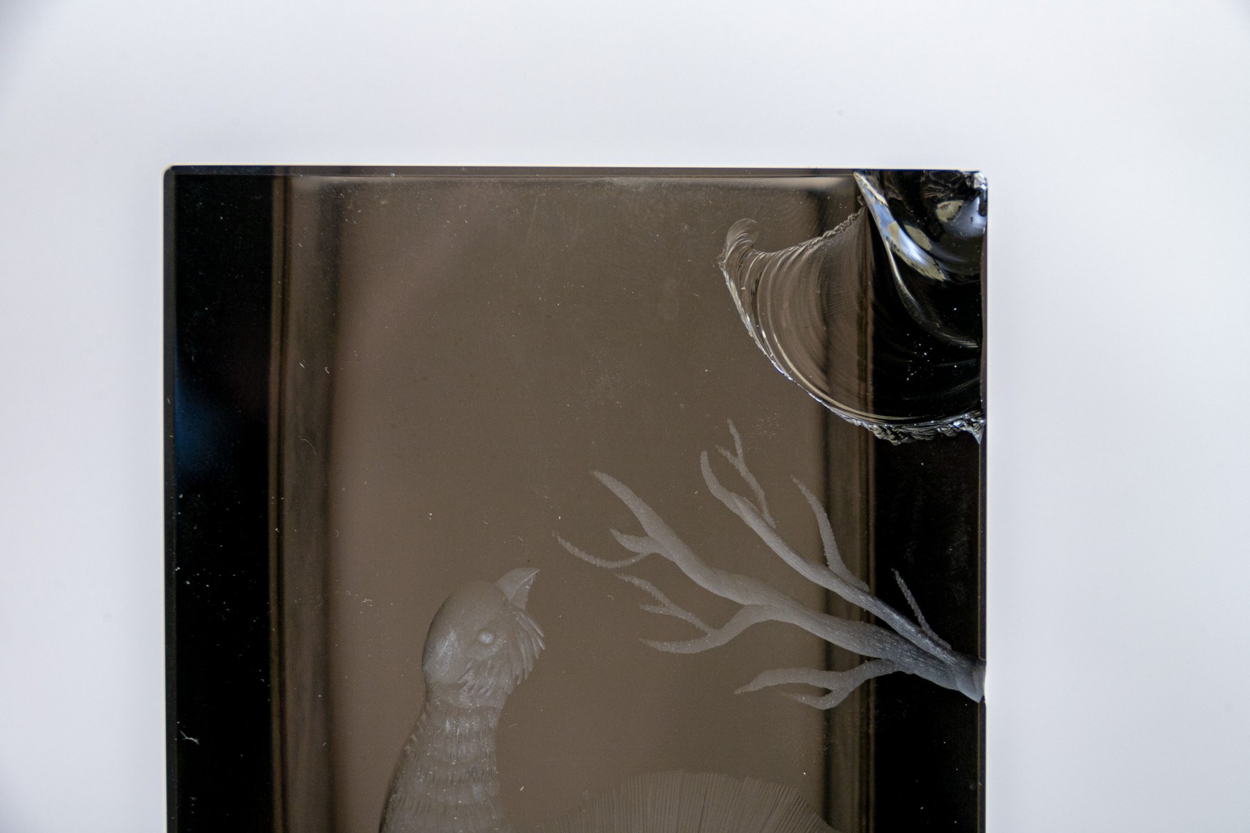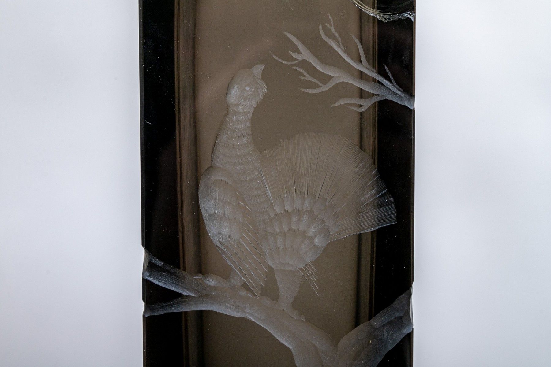 - Vintage Moser, Moulded smoky crystal, rectangular vase with relieved textural decoration of a bird with fan tail elevated and perched on a tree with fauna below. Decoration to three sides.