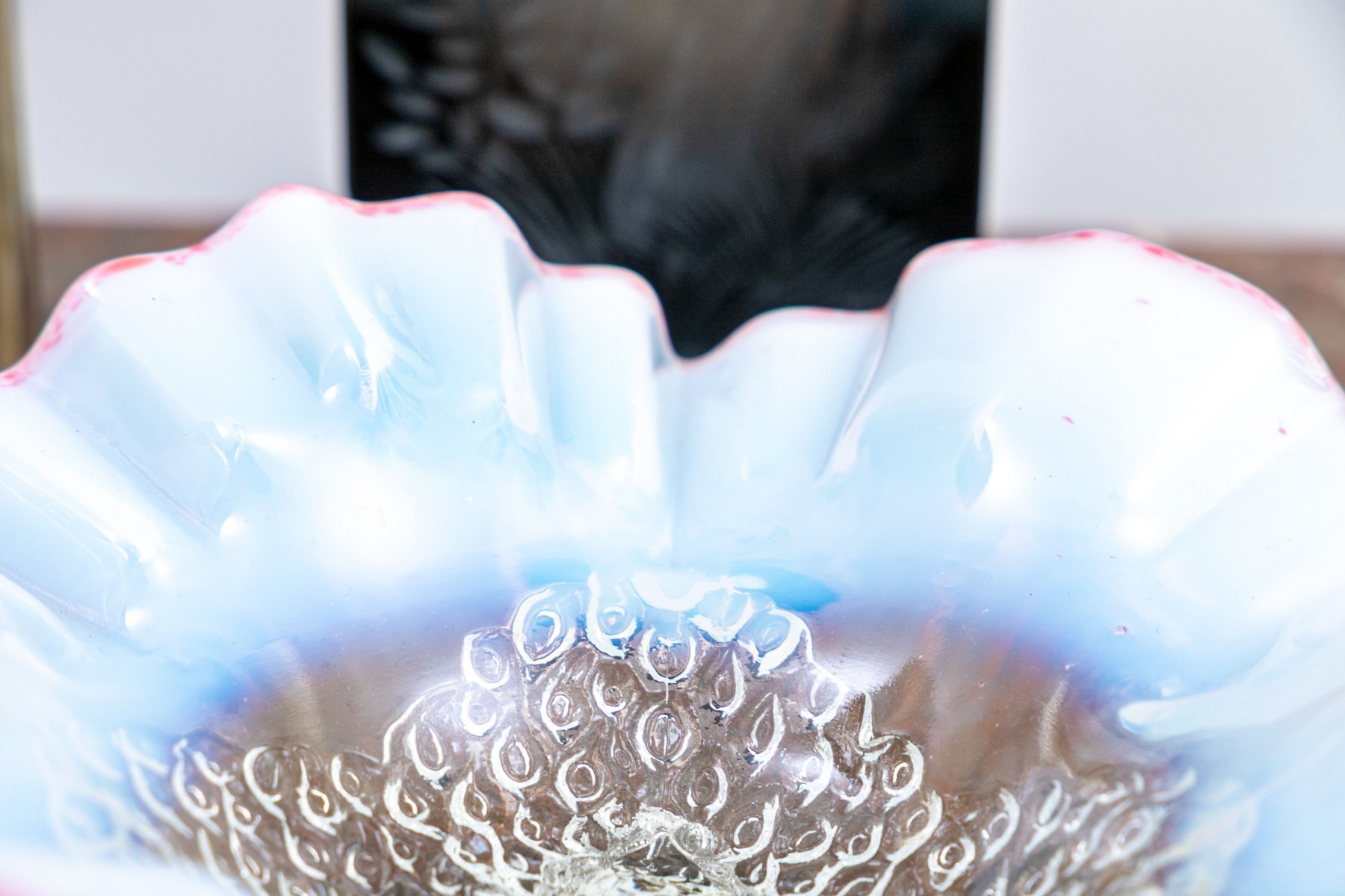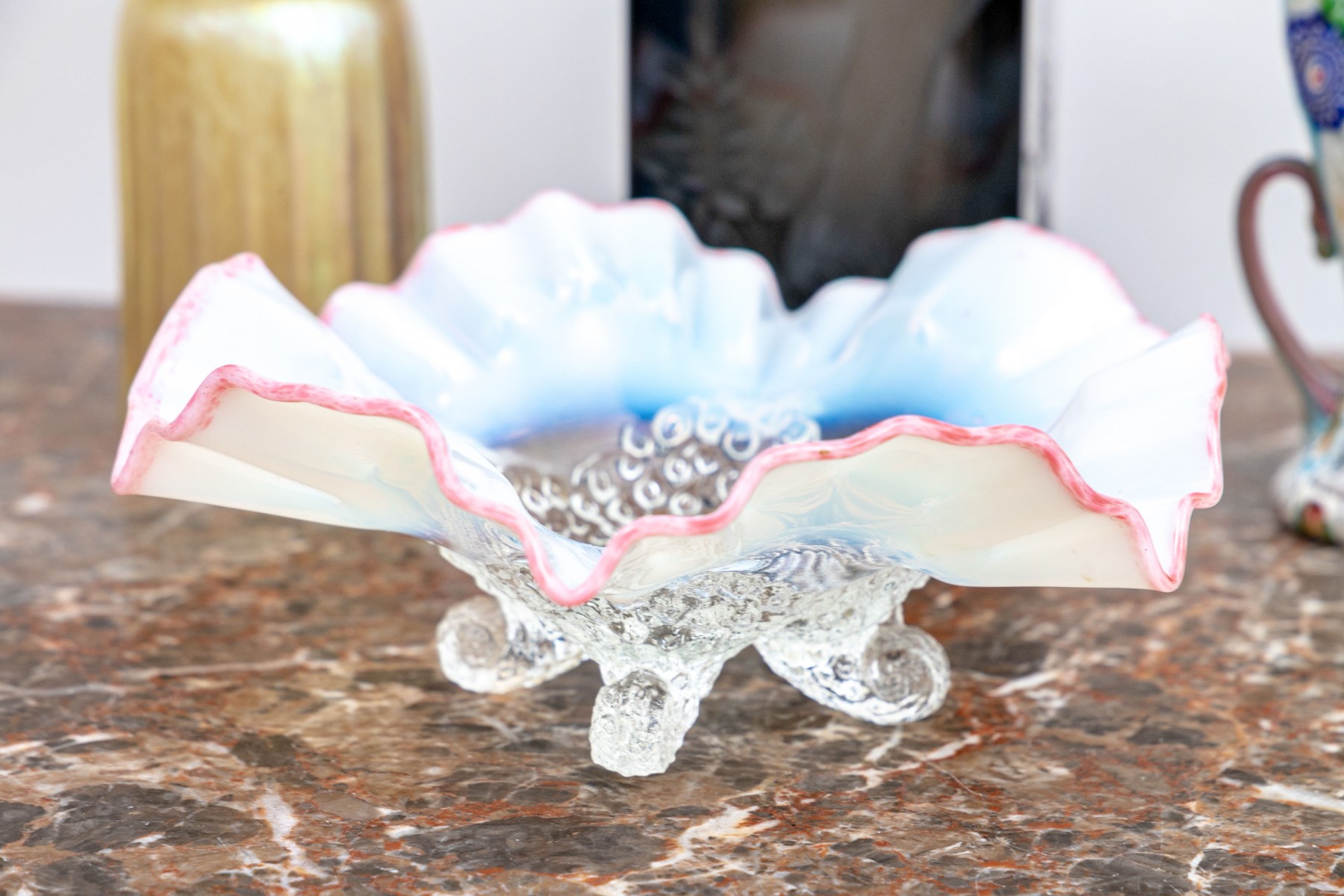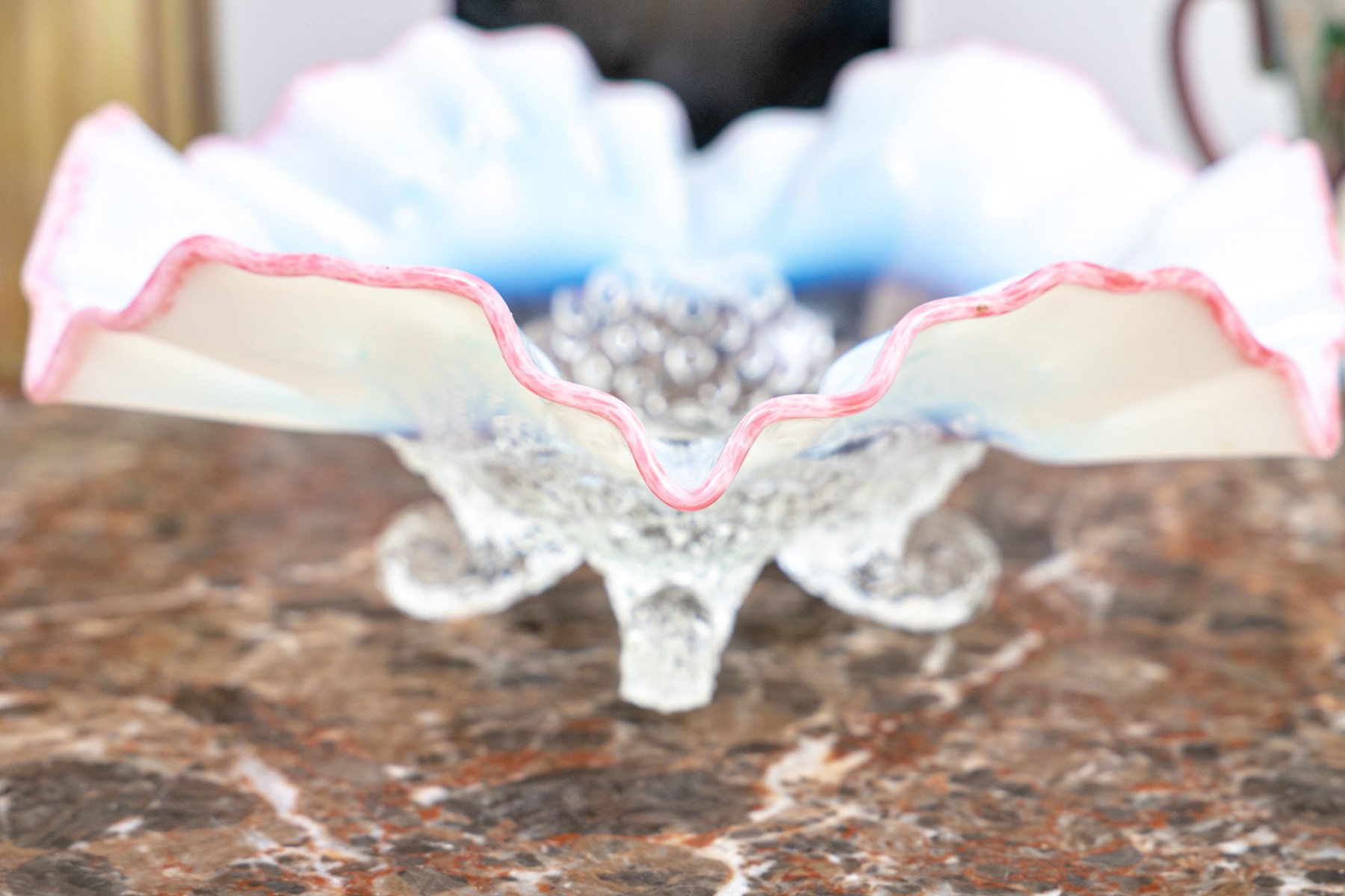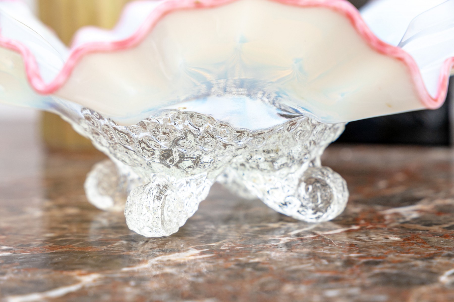 - A Murano style pink and white ribbon form, footed bowl raised on 4 nautical inspired scrolled legs in a transparent finish.