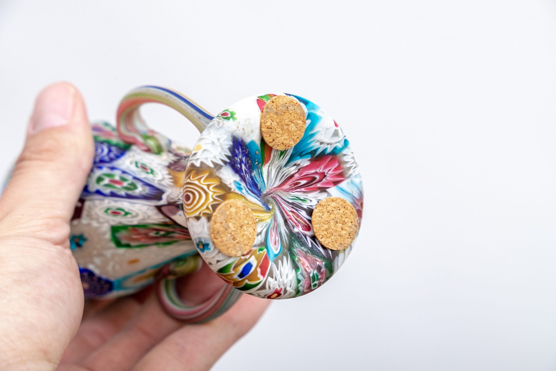 The "Millefleur", two handled vase has two spots / sections of color with white finish, one near the foot and one about 1" upwards, although there is no floral decoration in those two spots they appear original to the creation of the work. The vase has three tack pads on the base to protect the foot from rubbing the glass.