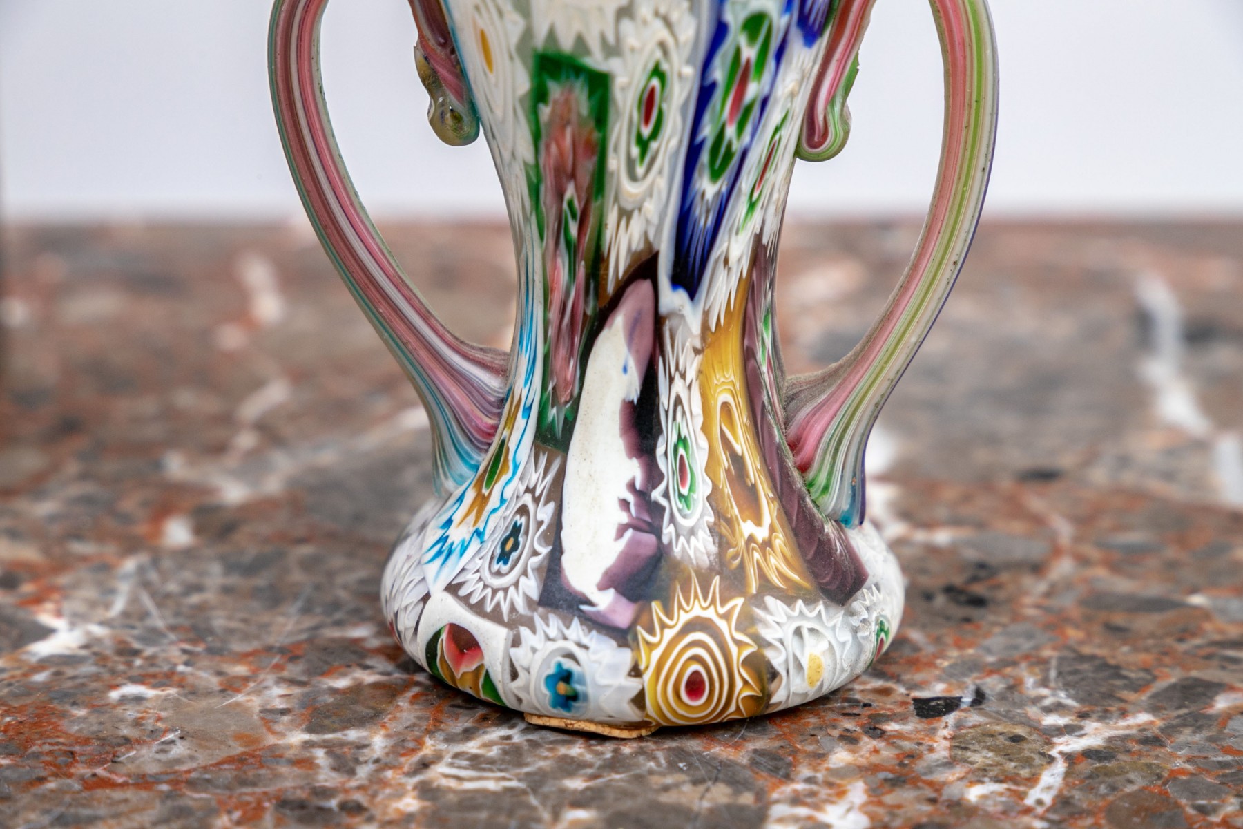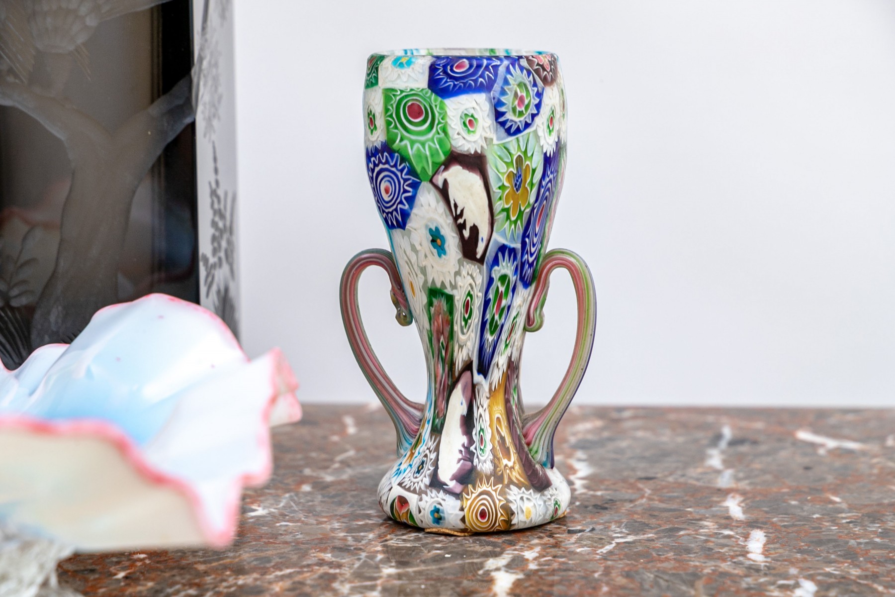 - An Italian, Murano style, two handled, "Millefleur" motif decorated glass vase. With wonderfully applied, polychrome finished scrolling handles. A wide foot and narrow waist with wider upper section and mouth rim.