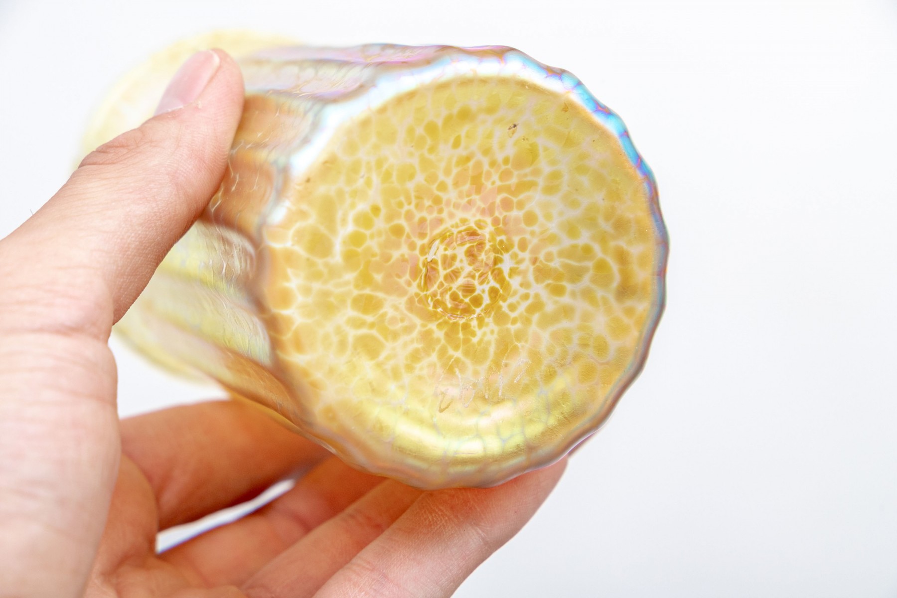 - Elaine Hyde signed and dated, handblown artisanal glass vase. Elaine Hyde was an artist whom worked and trained at the Pilchuk Glass Center under famed glass maker Dale Chihuly. The vase is of cylindrical form with flared mouth rim. The round, cylindrical body has a wonderfully scalloped body.