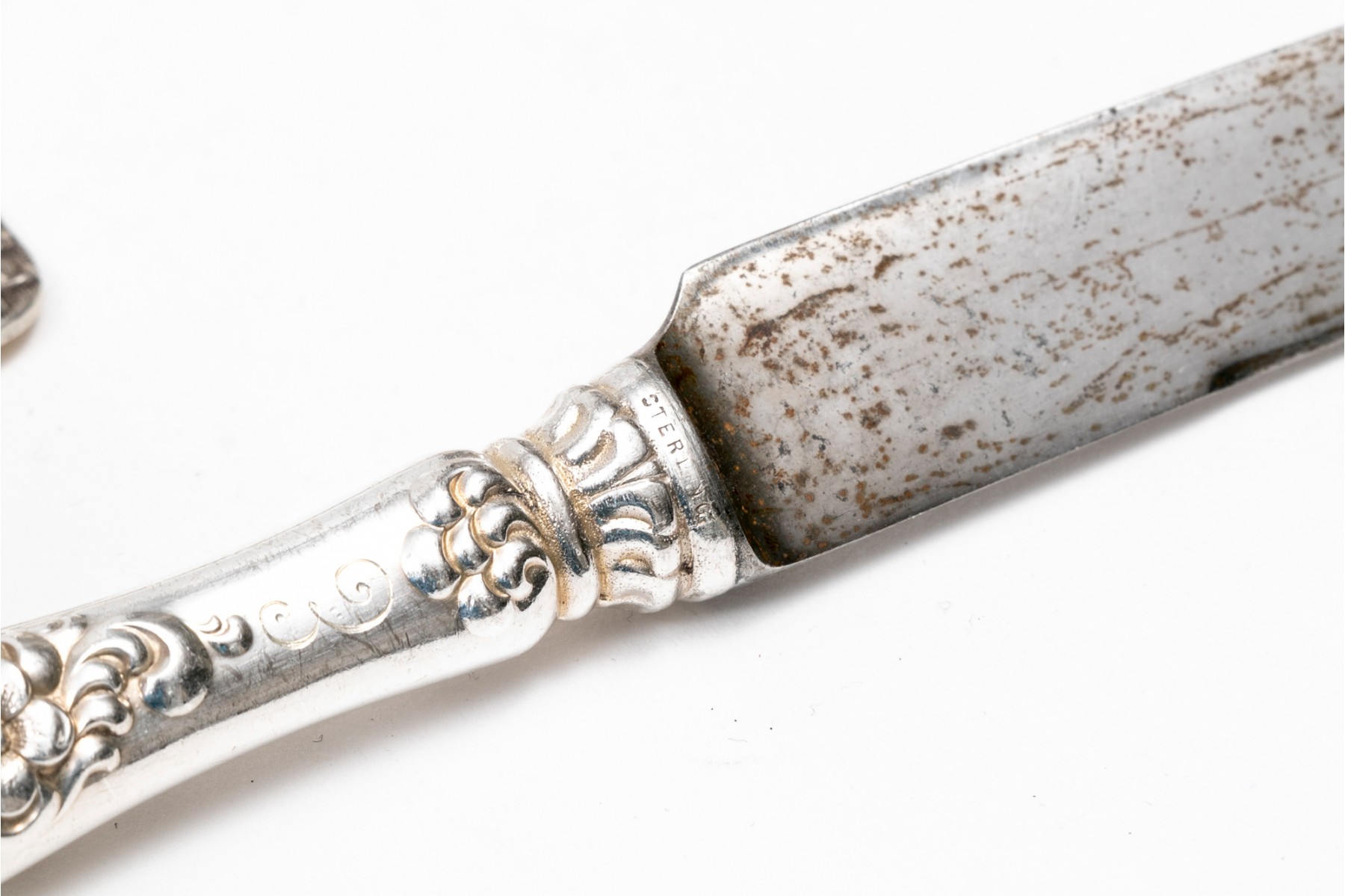 Sterling silver, no maker, floral motif handle; corroded blades: