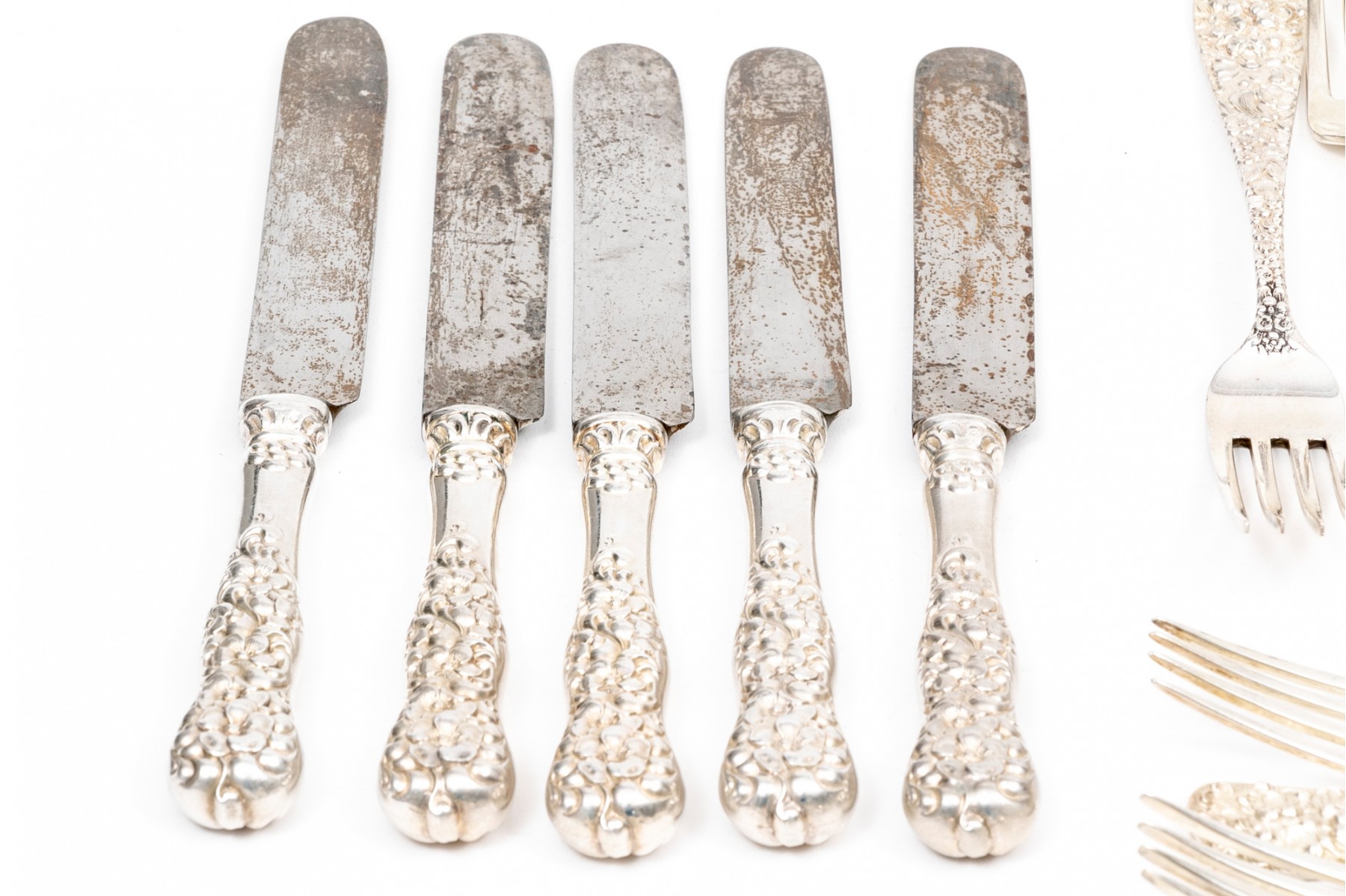 Condition: Good overall estate condition, tarnished; all knife blades have corrosion; some flatware pieces are engraved