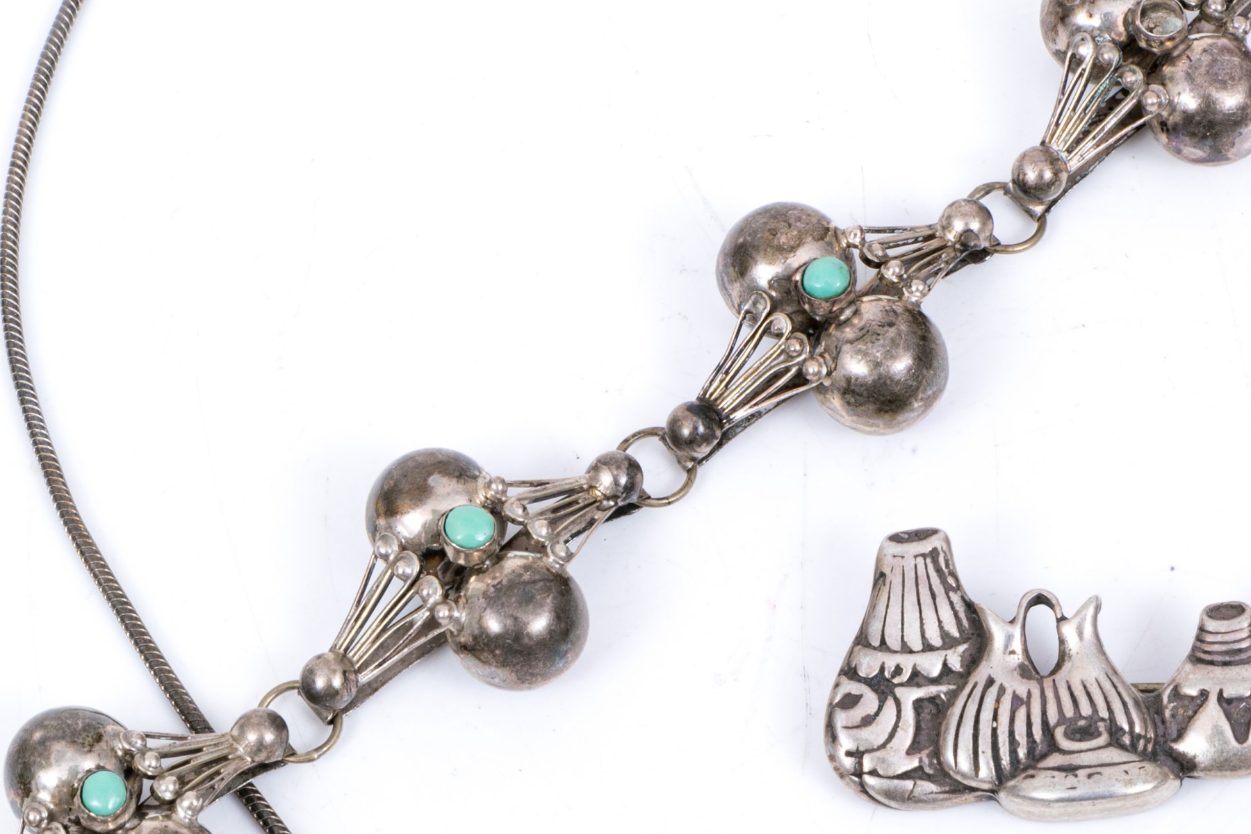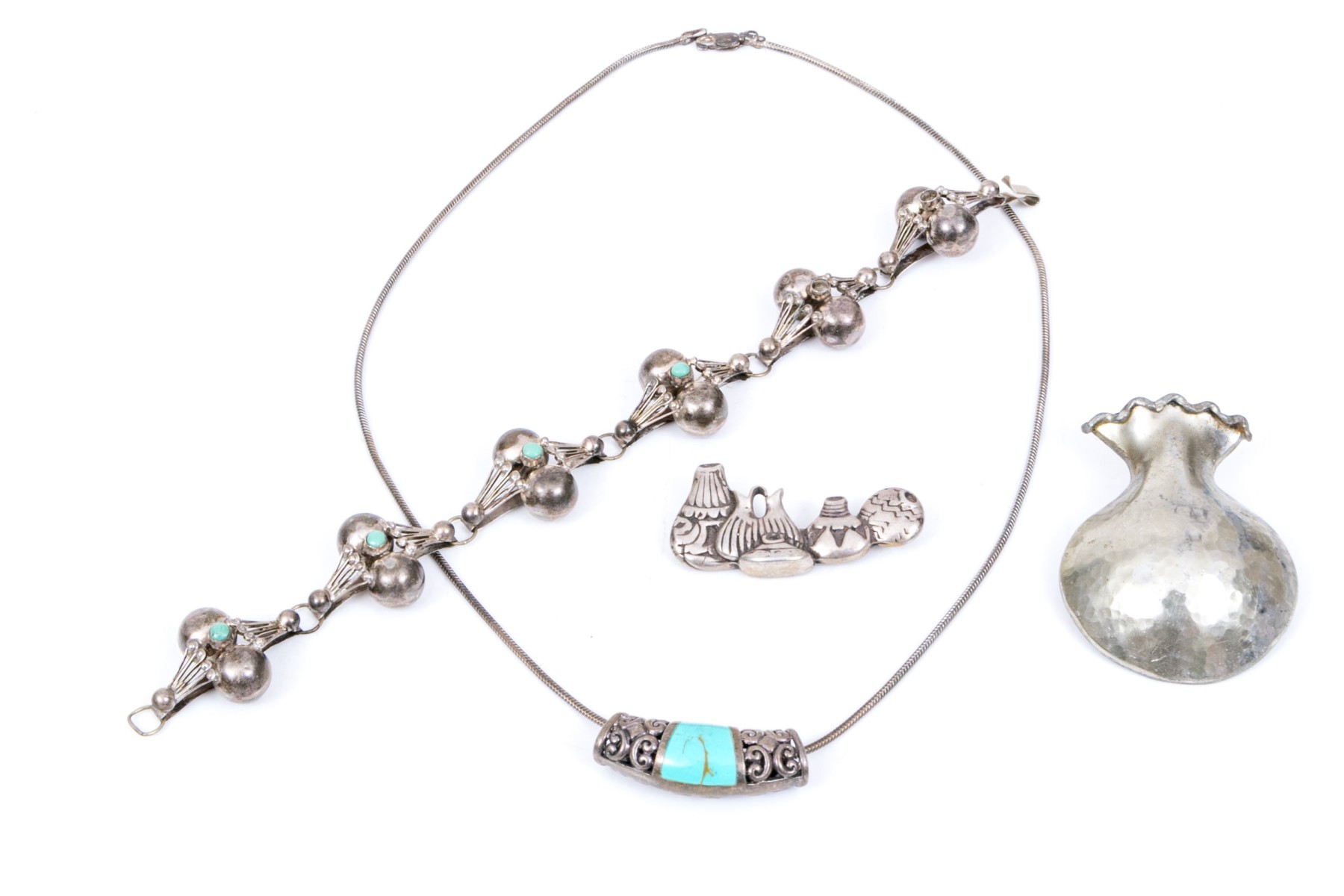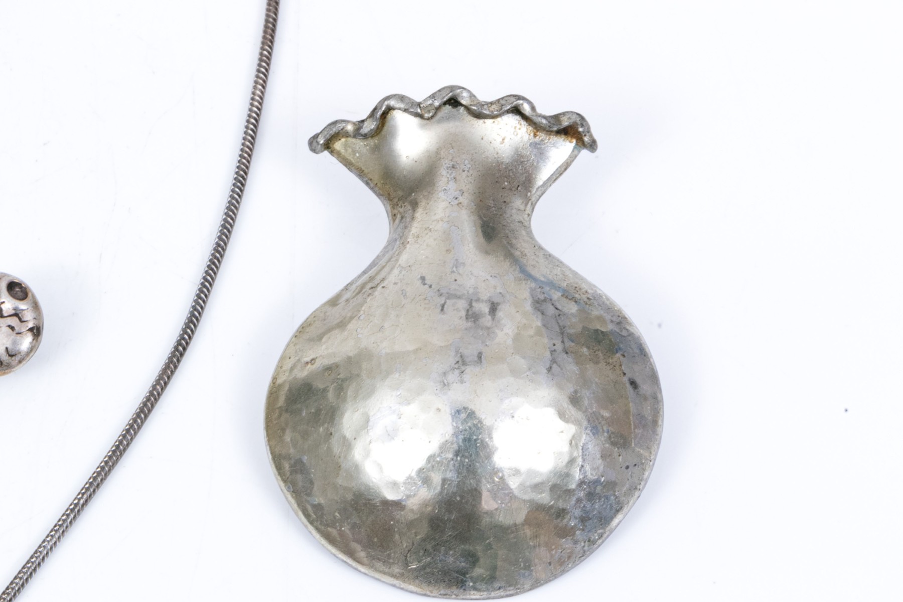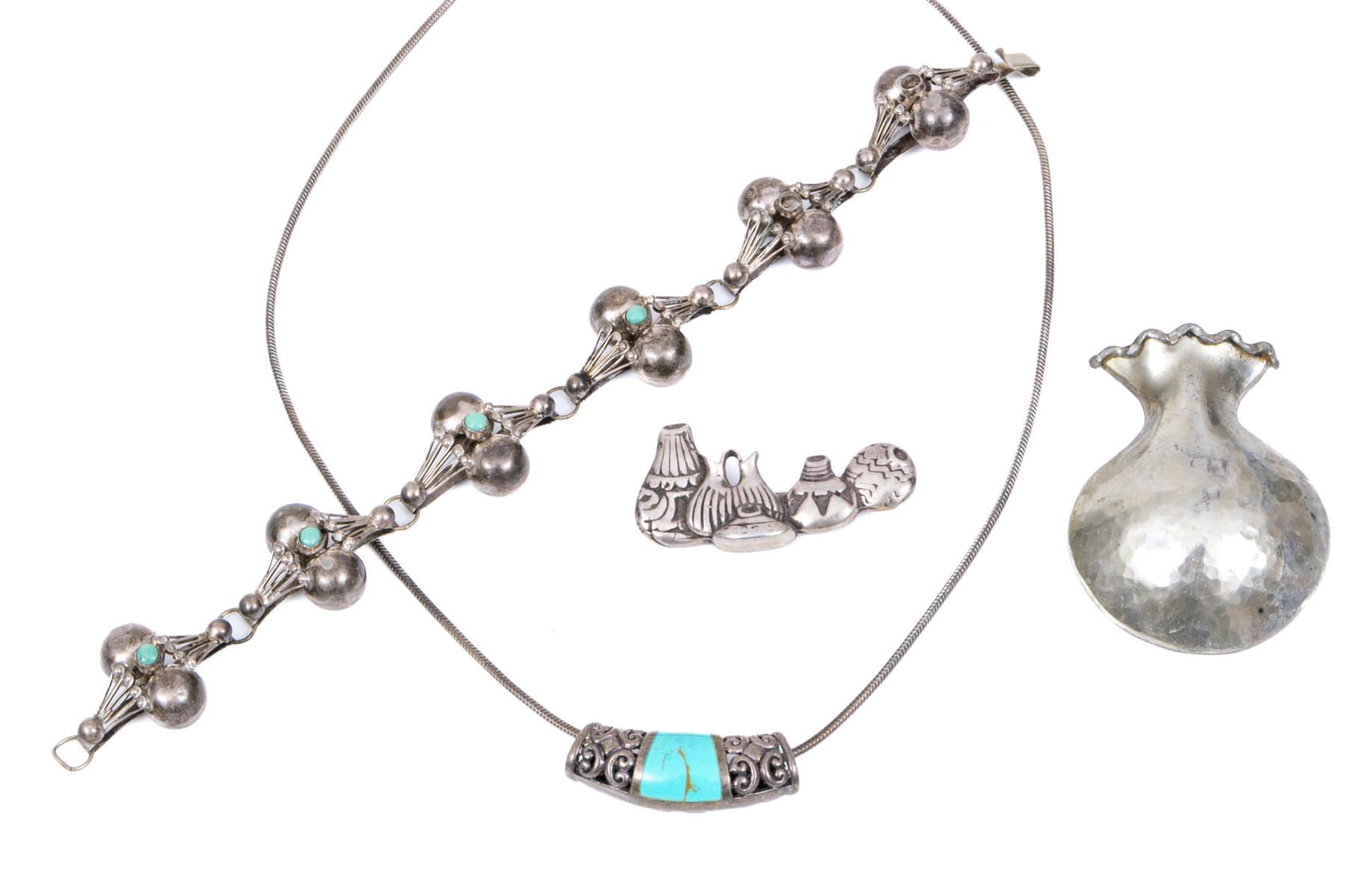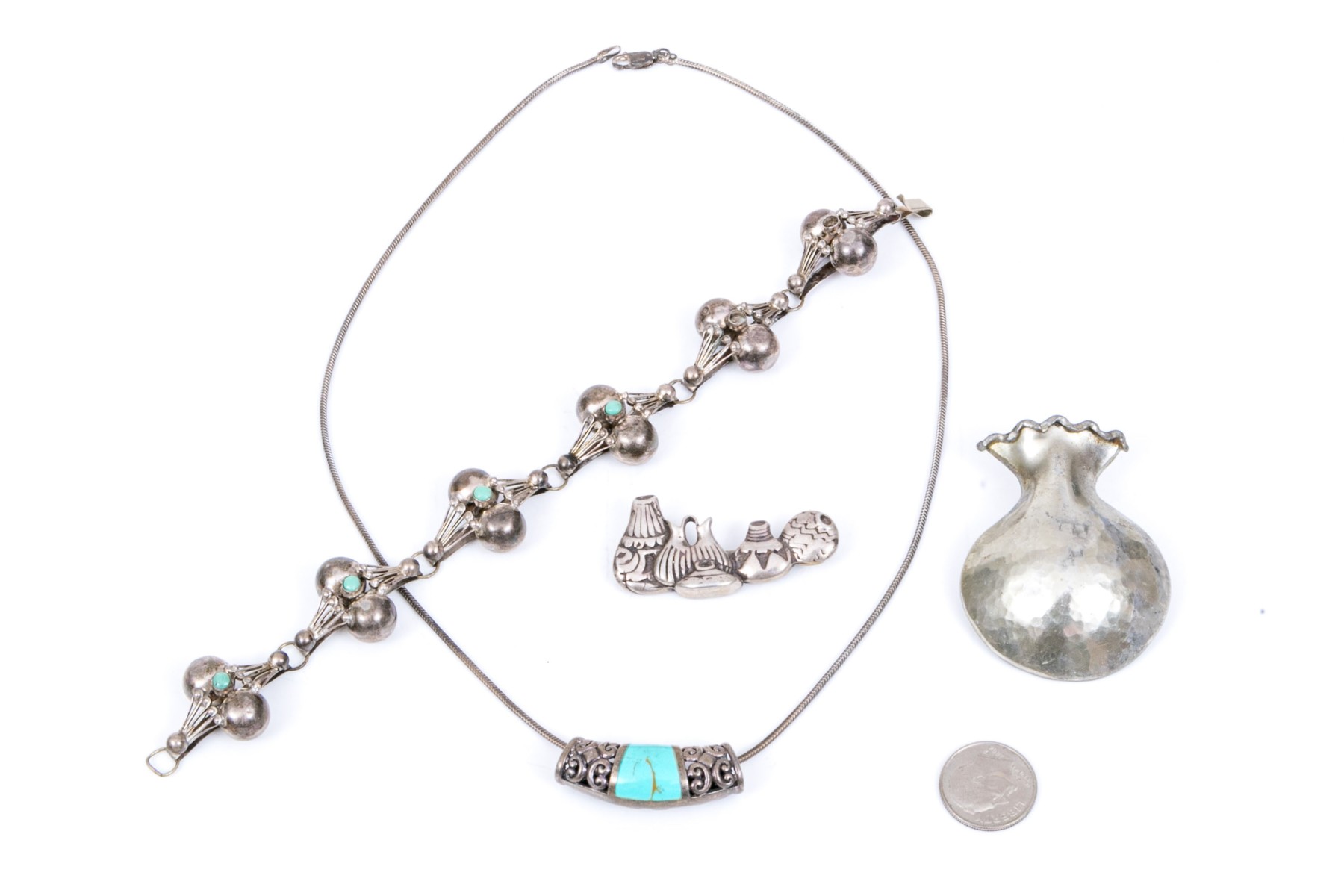 Lot of eclectic sterling silver jewelry pieces, including vessel motifs and a ball bracelet