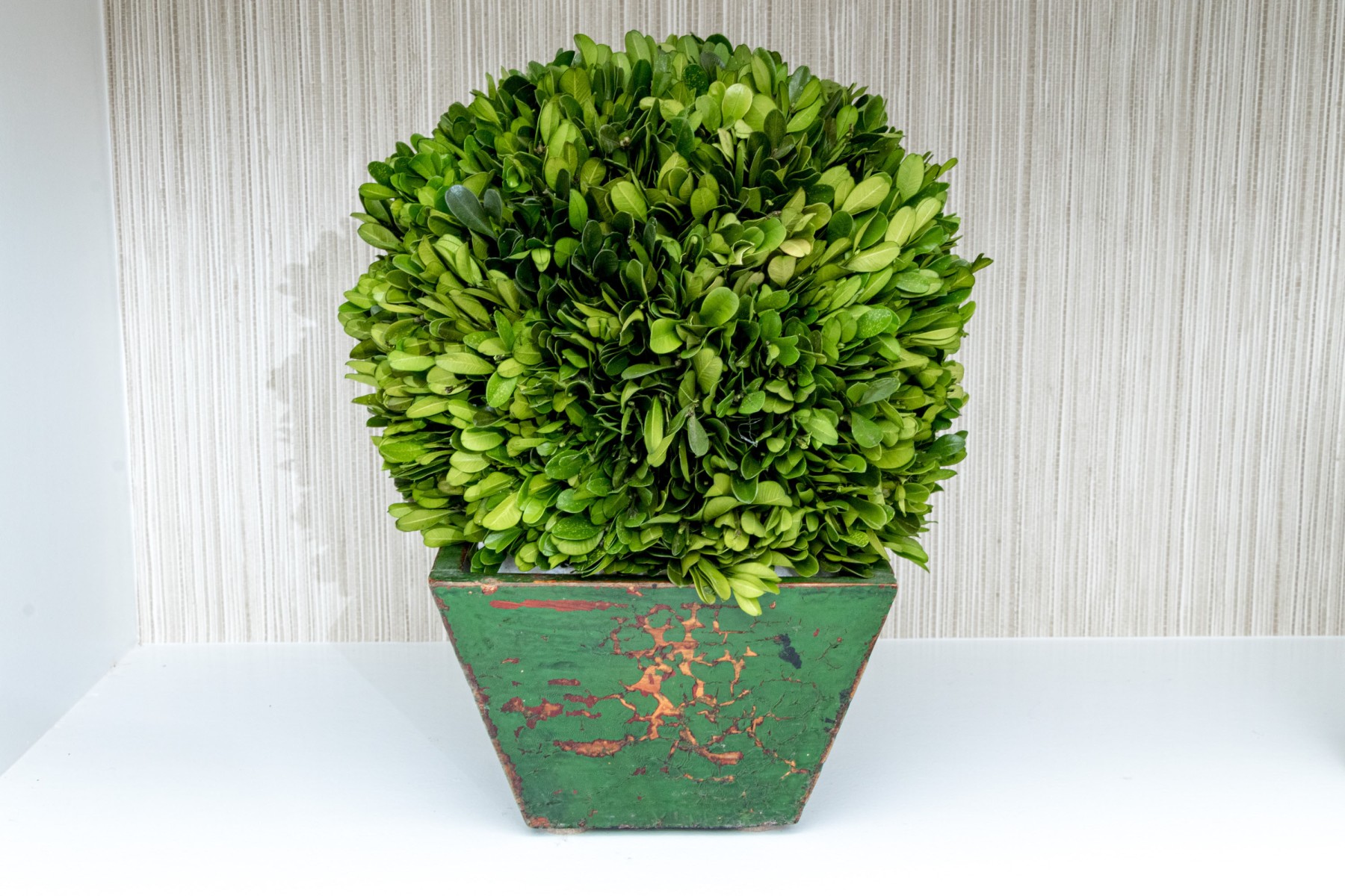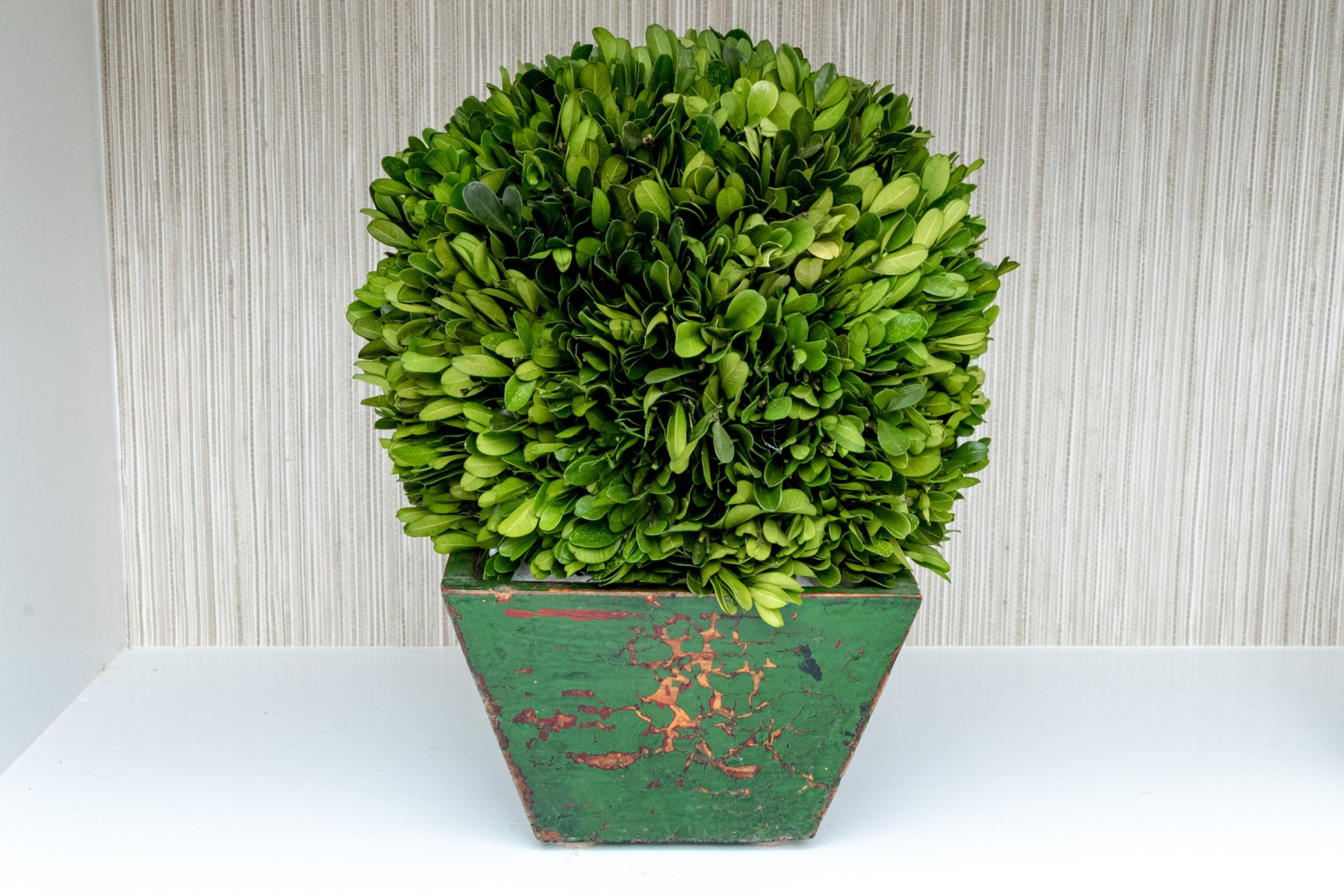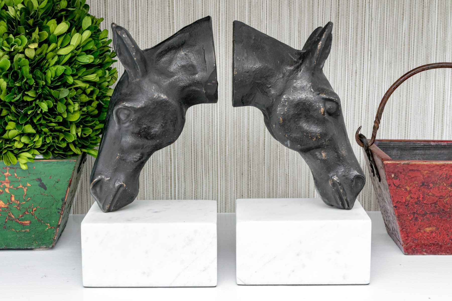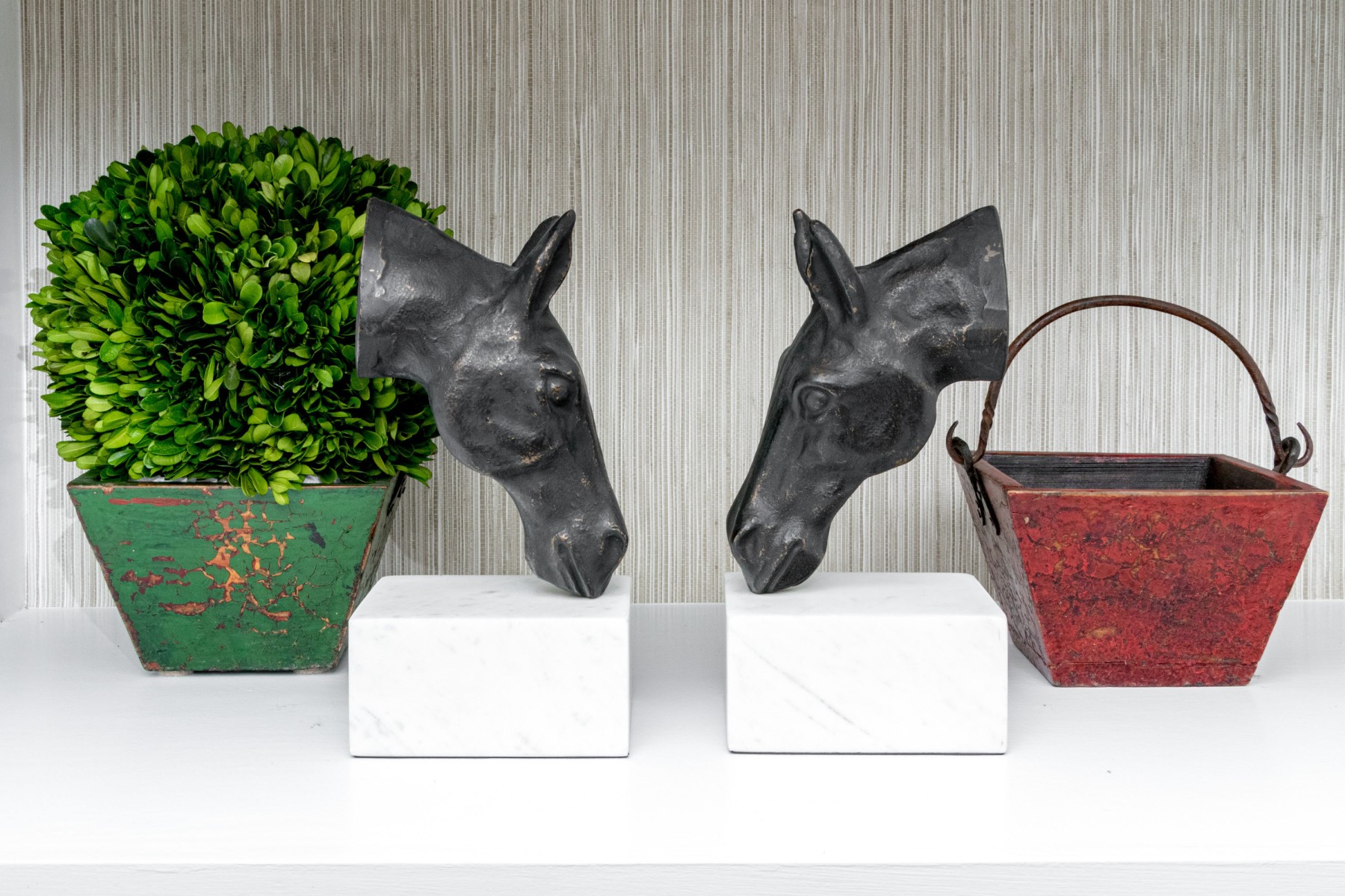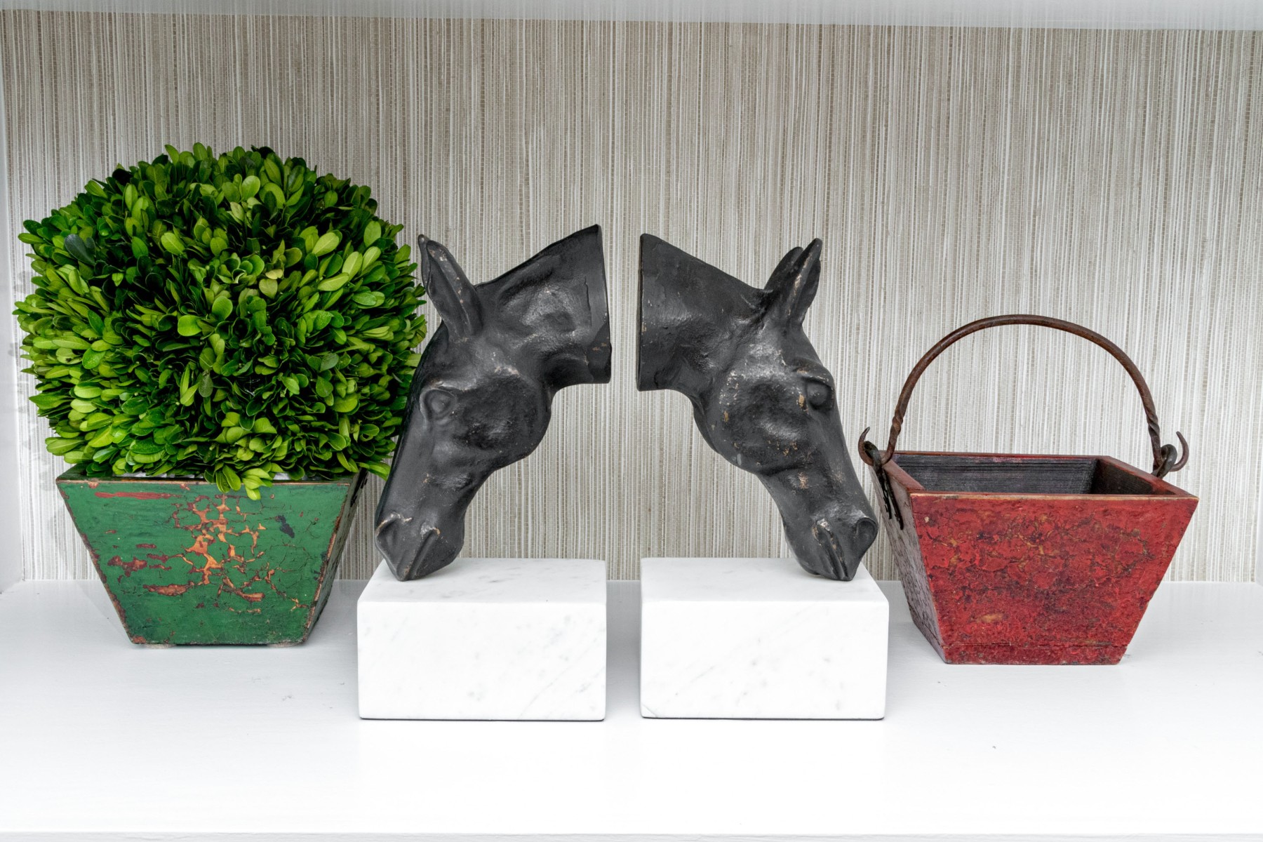 A delightful assortment of tabletop decor, including a boxwood topiary displayed in a trapezoidal wood planter in a rustic green painted finish; a pair of bronzed finished horse head form bookends, and a Chinese wood basket in a rustic red finish over a trapezoidal body topped with a wrought iron handle.