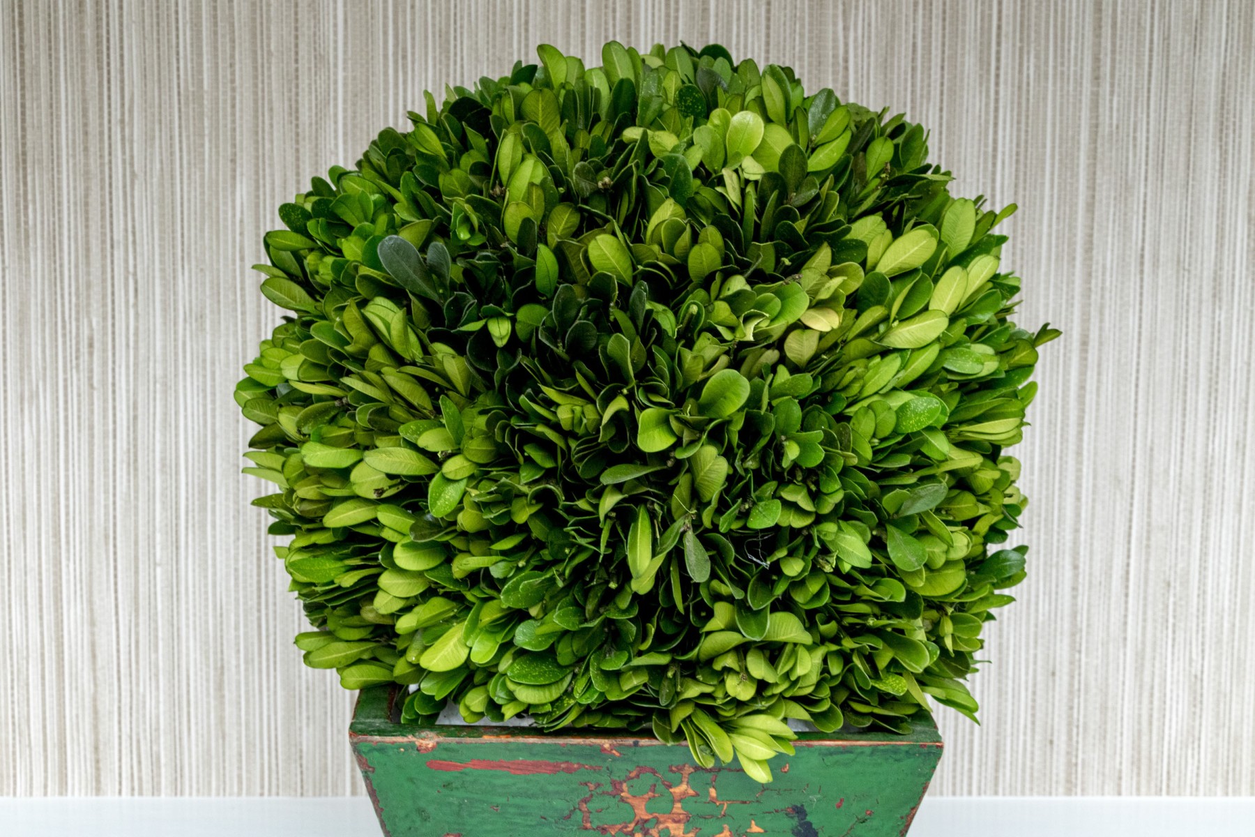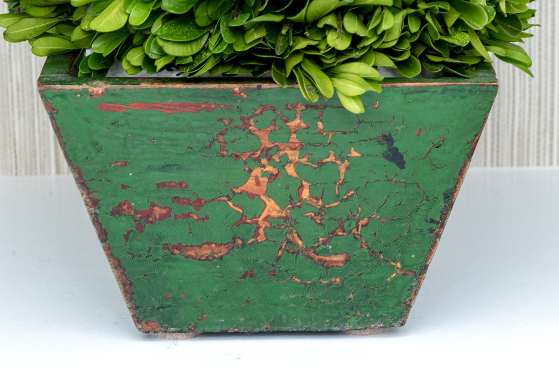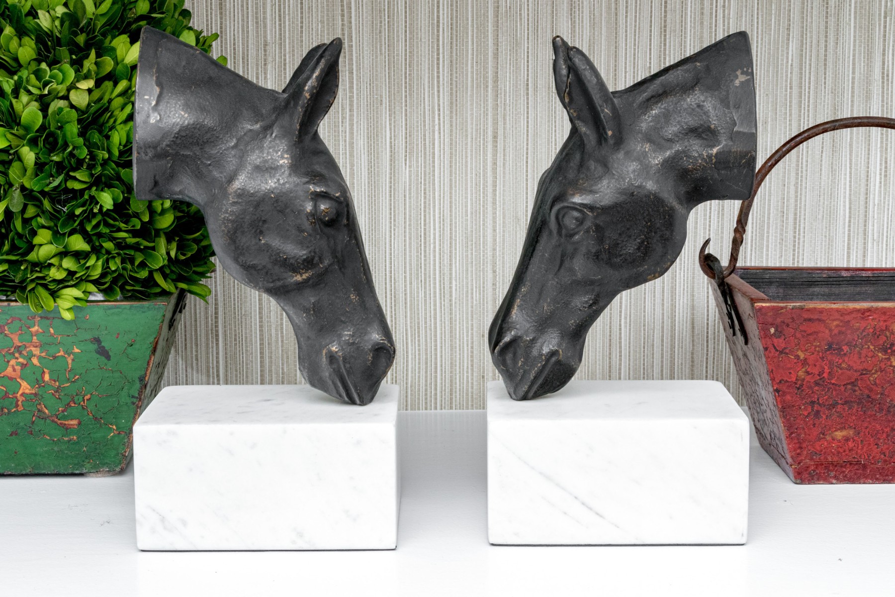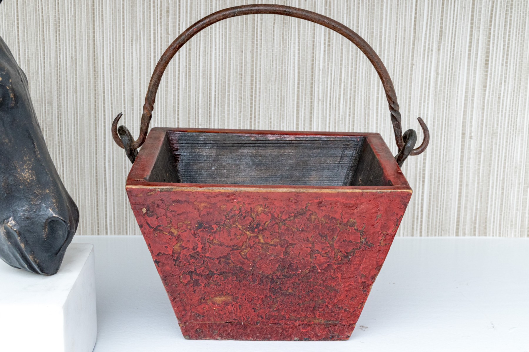 A delightful assortment of tabletop decor, including a boxwood topiary displayed in a trapezoidal wood planter in a rustic green painted finish; a pair of bronzed finished horse head form bookends, and a Chinese wood basket in a rustic red finish over a trapezoidal body topped with a wrought iron handle.