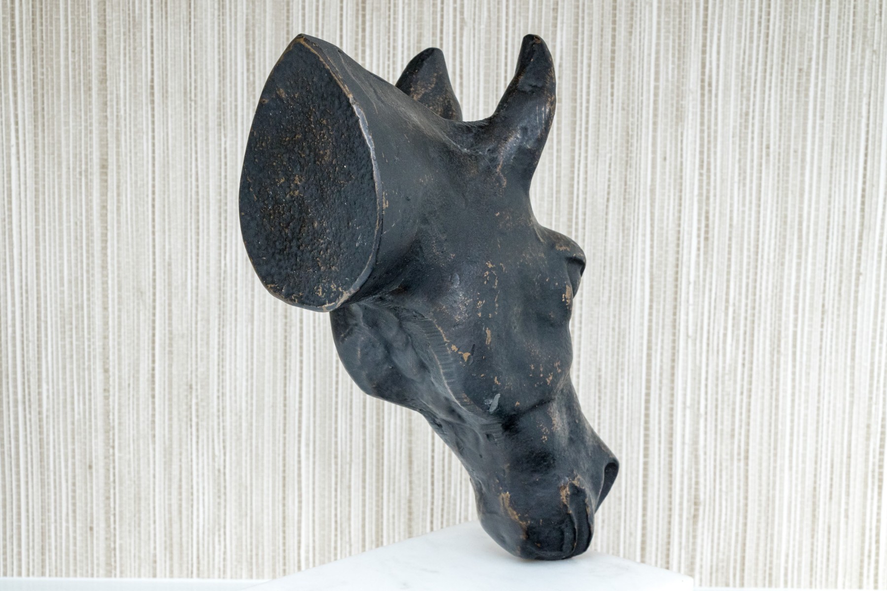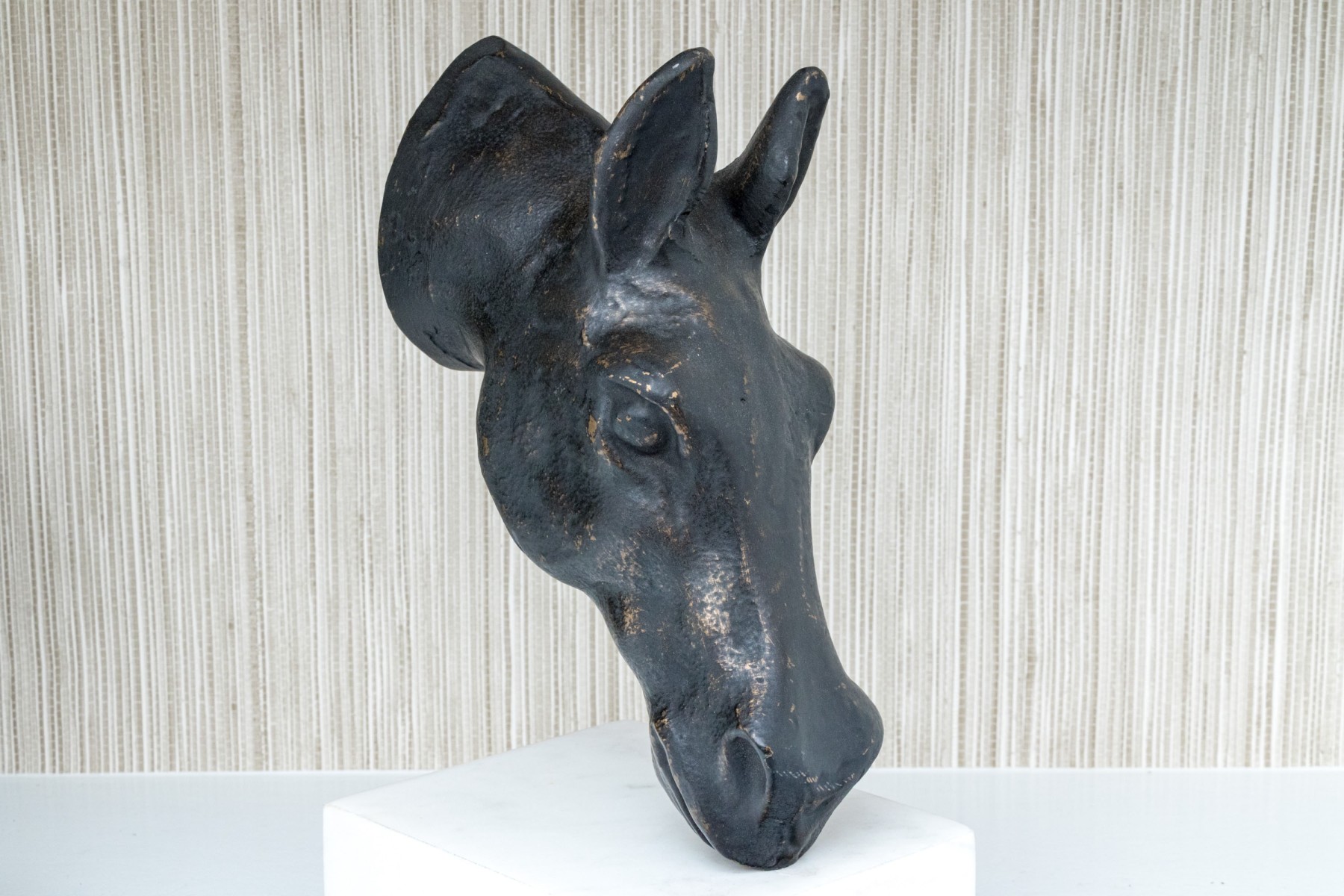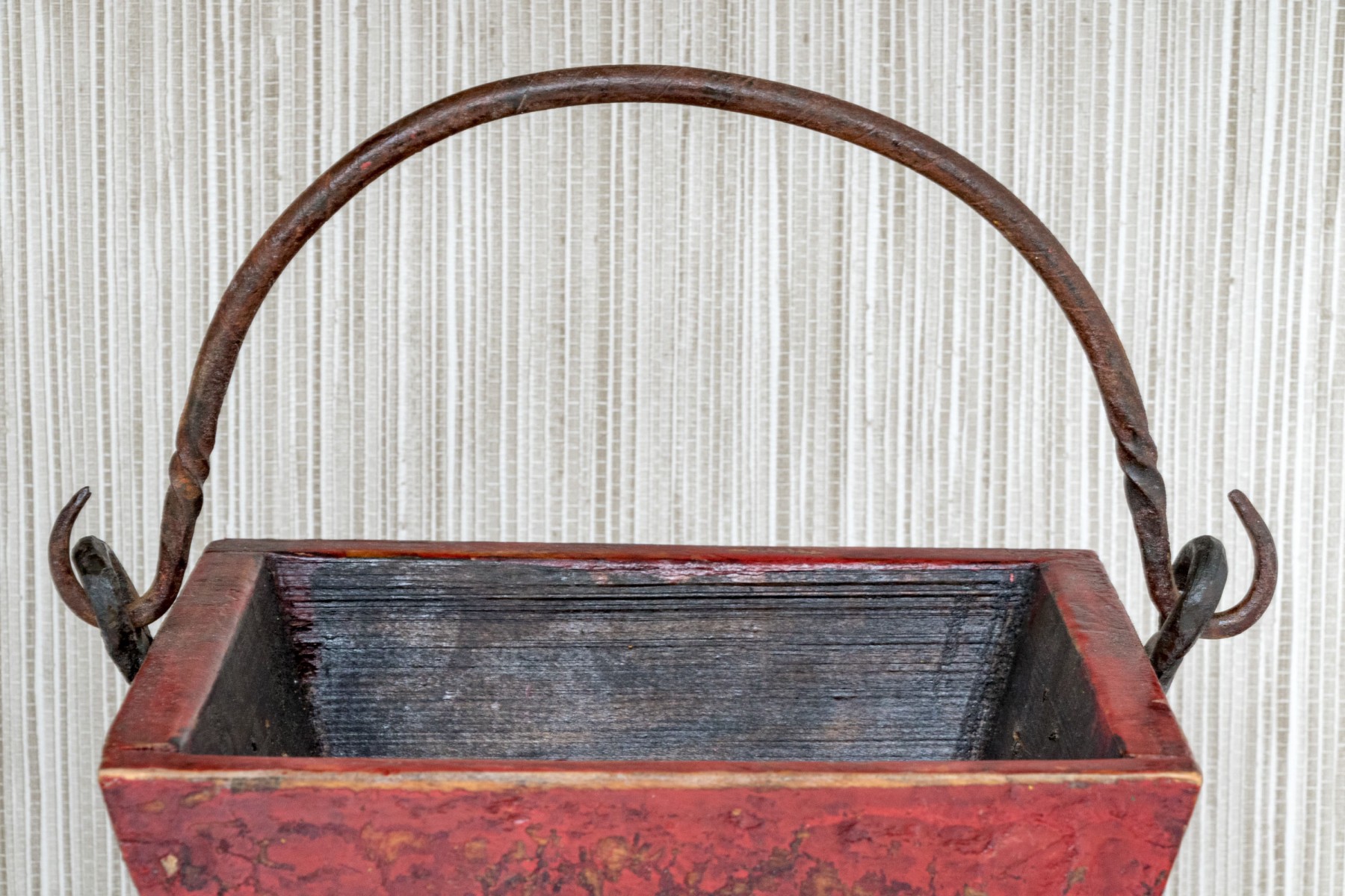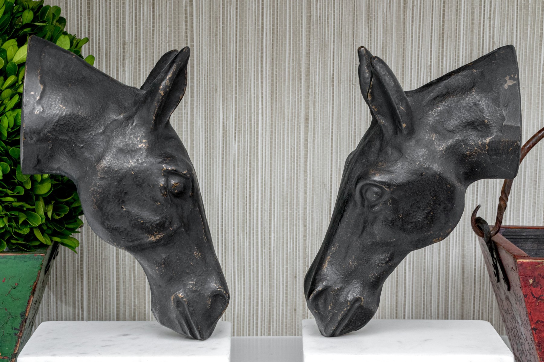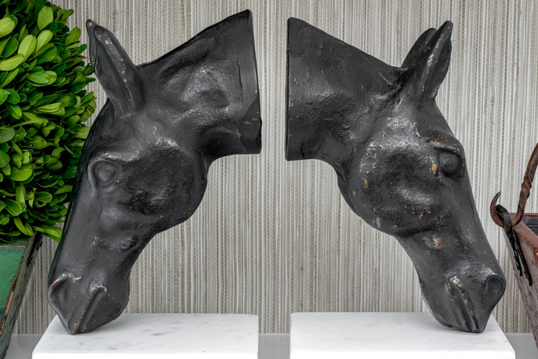 A delightful assortment of tabletop decor, including a boxwood topiary displayed in a trapezoidal wood planter in a rustic green painted finish; a pair of bronzed finished horse head form bookends, and a Chinese wood basket in a rustic red finish over a trapezoidal body topped with a wrought iron handle.