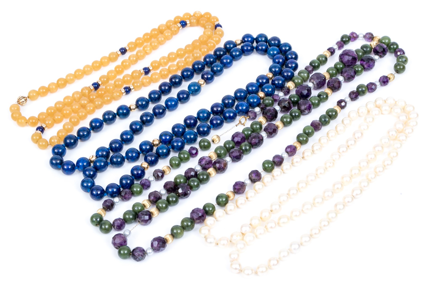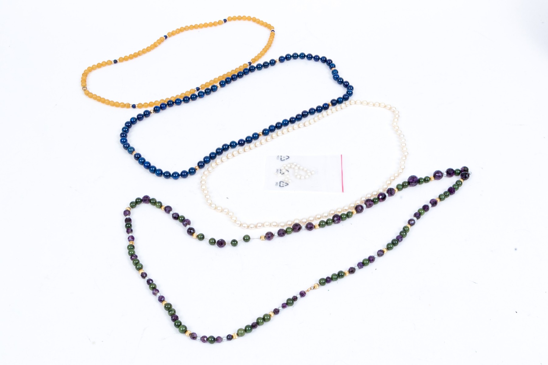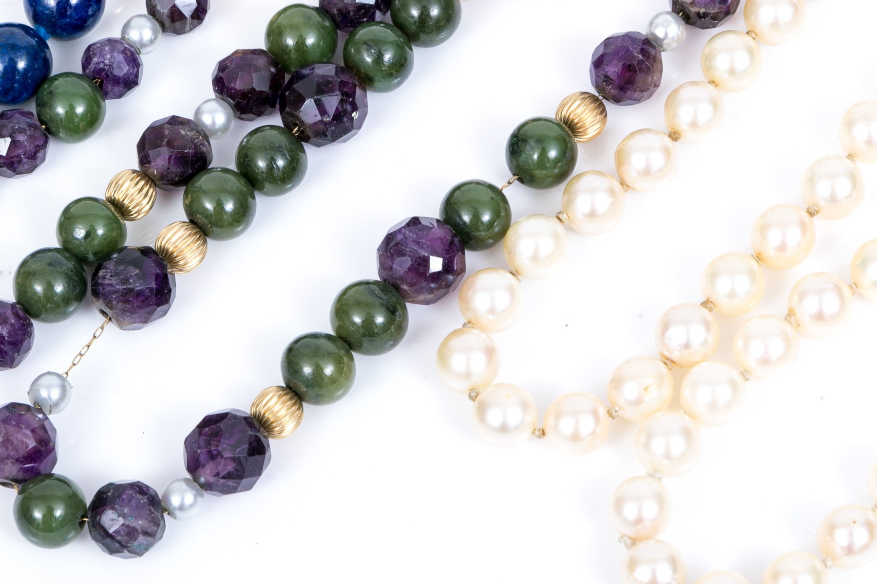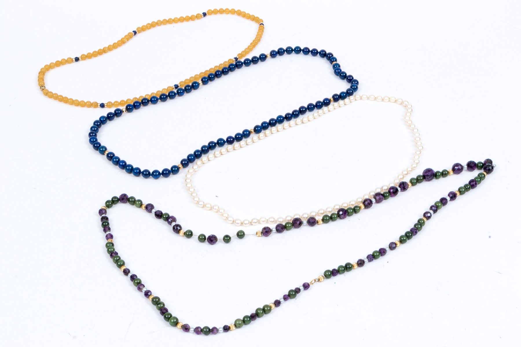 Lot of four bead necklaces, including amethyst and jade, chalcedony, cultured pearl and sodalite. Also enclosed are extra cultured pearls in a bag