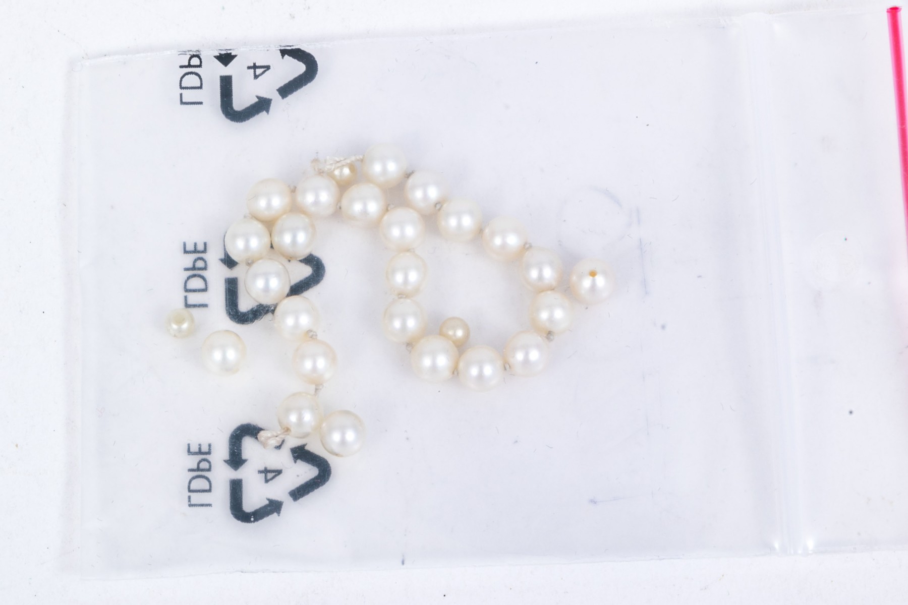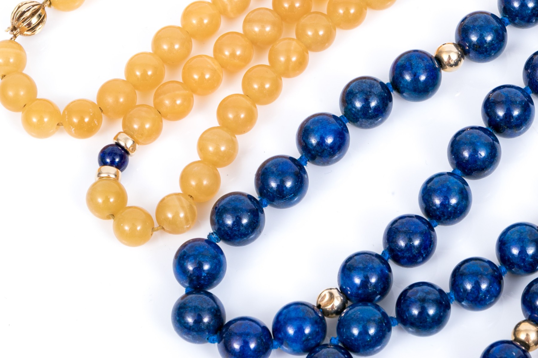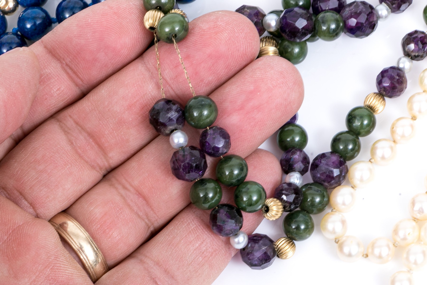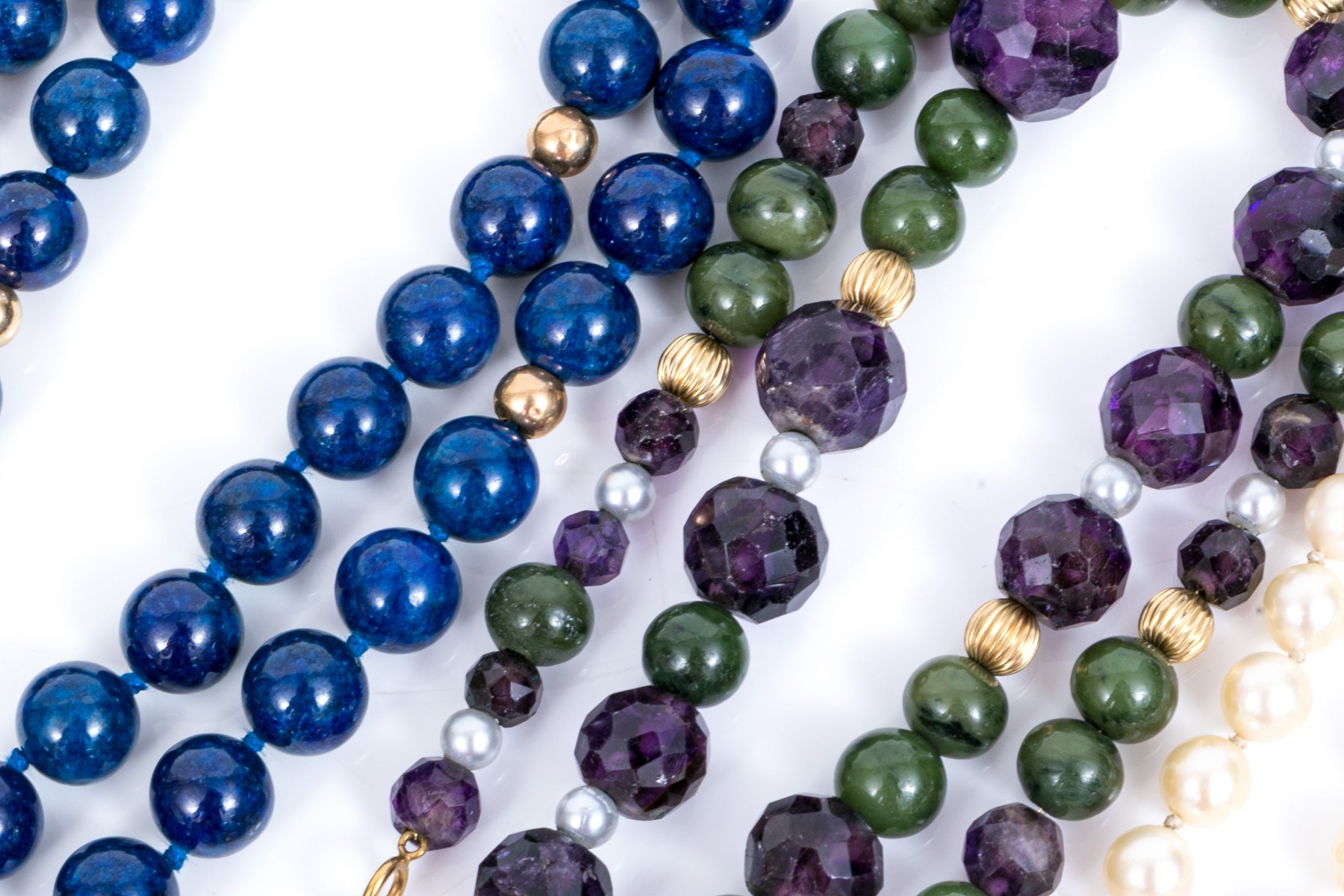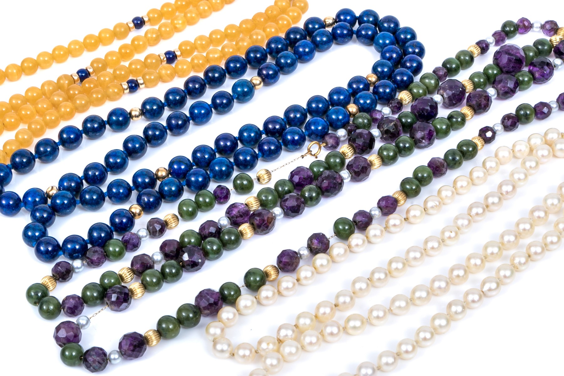Lot of four bead necklaces, including amethyst and jade, chalcedony, cultured pearl and sodalite. Also enclosed are extra cultured pearls in a bag